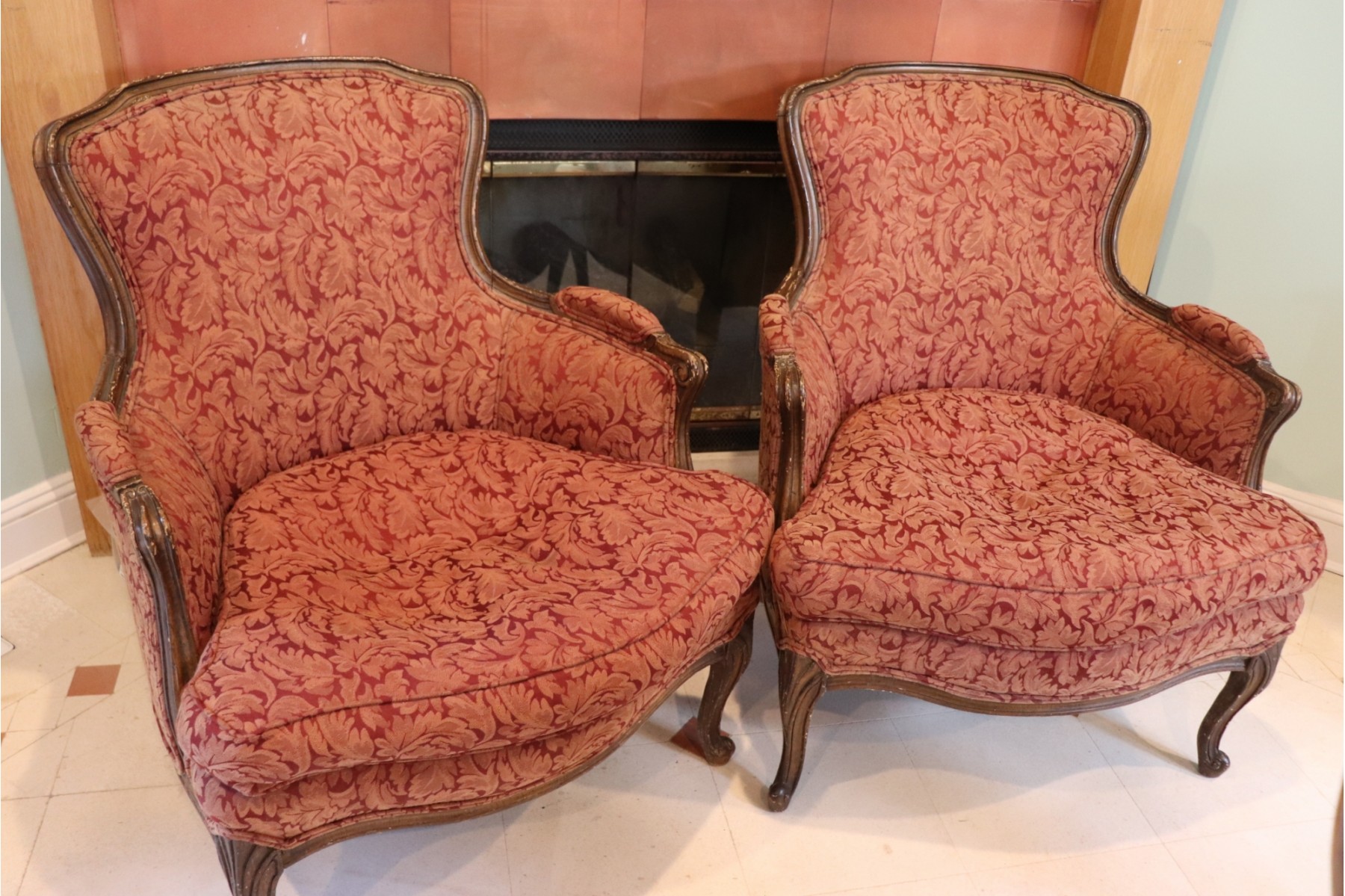 Pair of Louis XV style fauteuils. Both chairs have Age-appropriate wear to wood frame & some area of separation on arms. Please see photos for more details. Measure 29” W, 30” D 33.25” T, 21” seat depth, 18” seat height