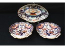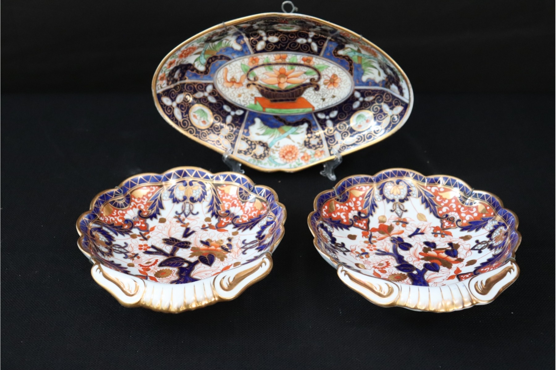 Pair of hand painted Imari dishes with a shell shaped design & a hand painted Imari oval dish. Shell shaped dishes have metal hanging wires on backs and measure 9.5” L x 8” W. Single dish is 11” L x 8” W