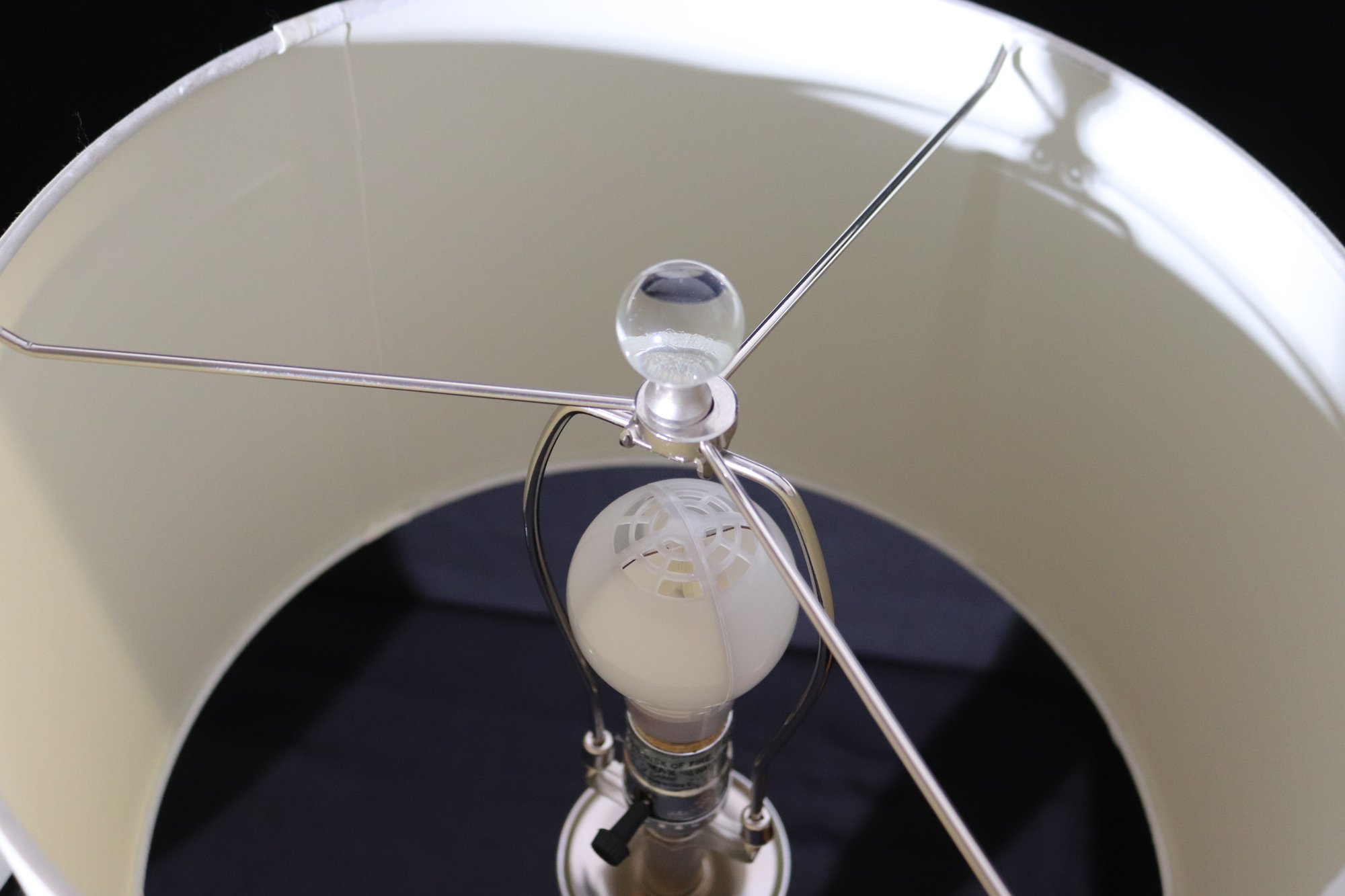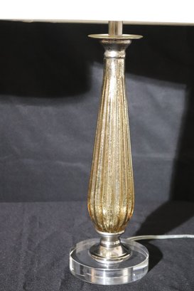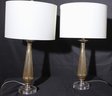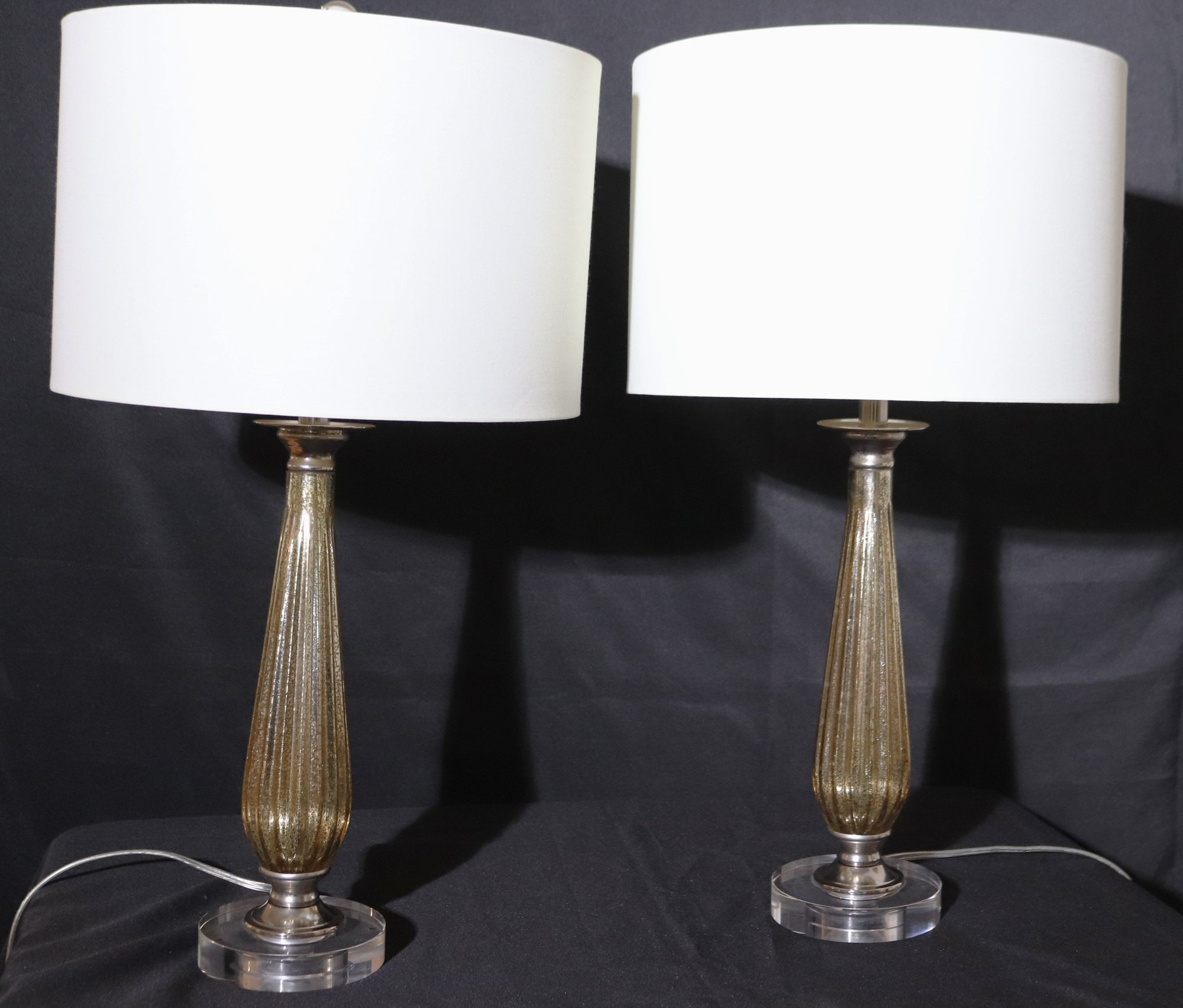 Pair of modern glass table lamps with a Lucite base and drum shade, this lamp
