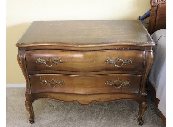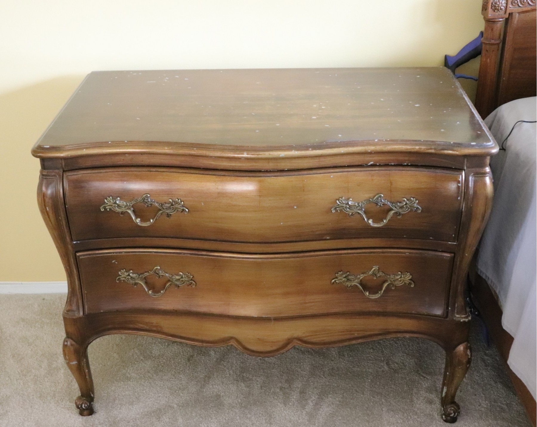 Pai of vintage 1970’s era gold painted Bombe chests with 2 drawers each. Age-appropriate chips and scratches to both tops. Please see photos for more details. The pair measures 38” L x 21.5” D x 29” T