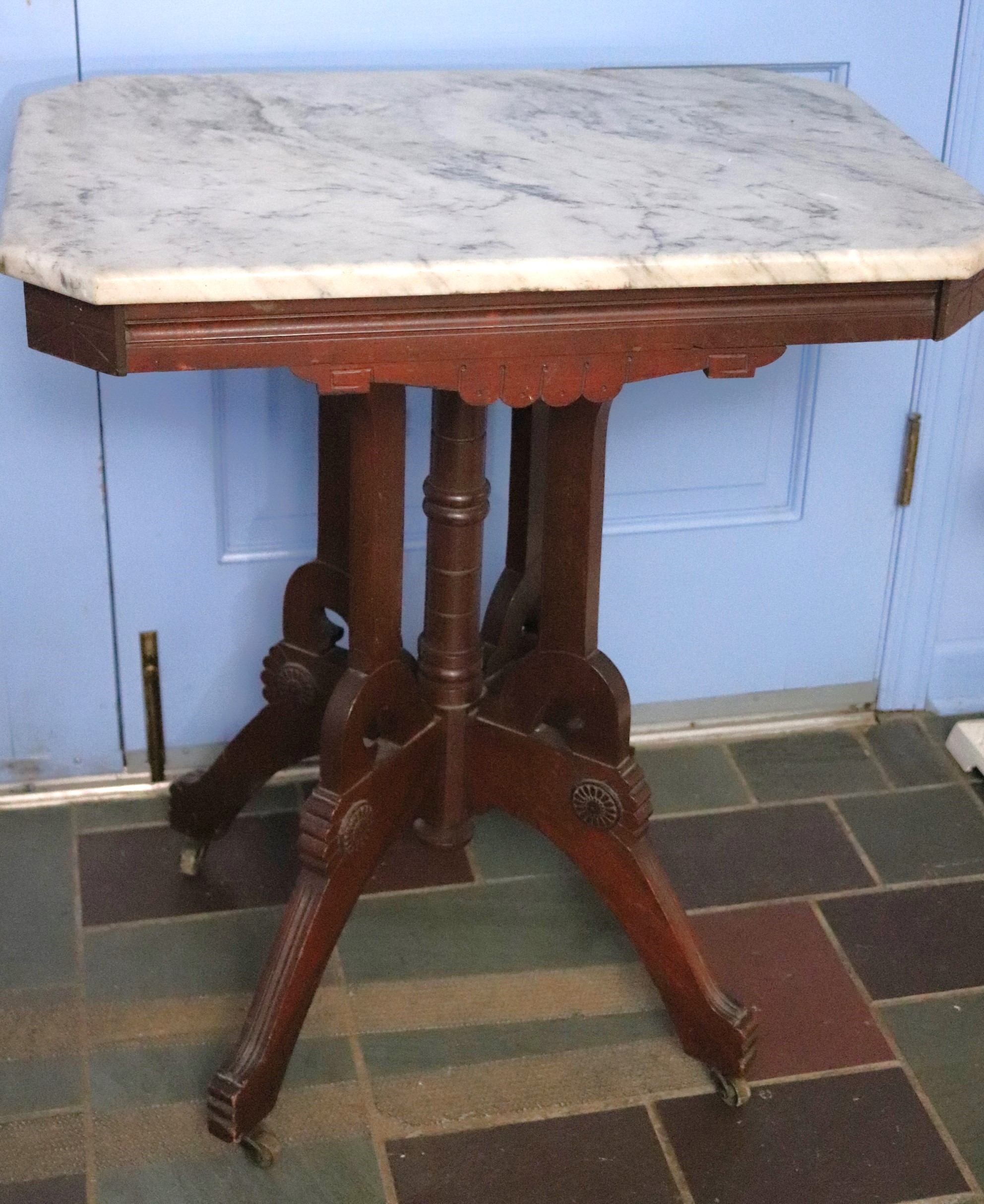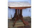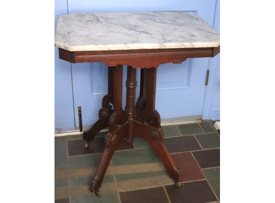 Antique Carved Wood Side Table With A Marble Stone Top. Carved Apron Along The Edges. Casters Easy To Maneuver. Measures Approximately 27” W X 19” D X 30” Tall. Really Nice Condition For Age As Pictured.