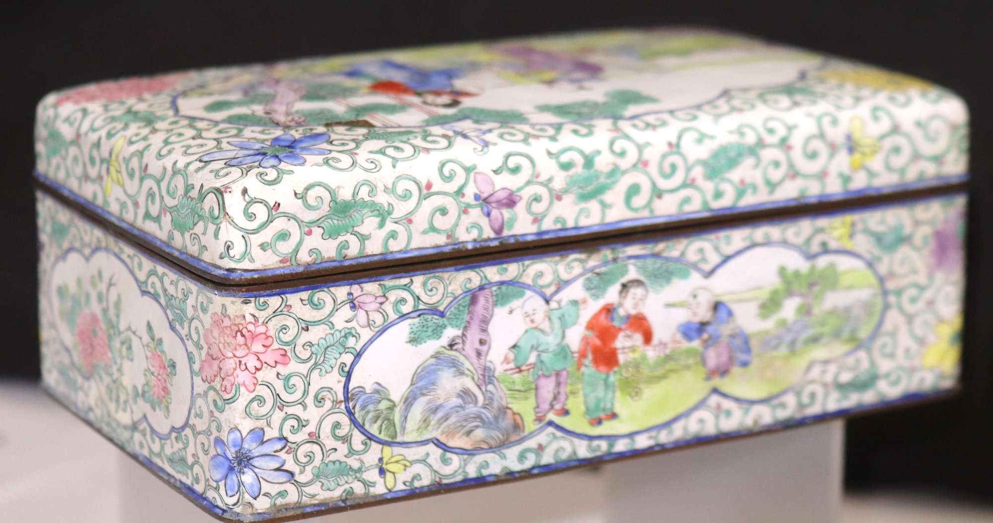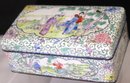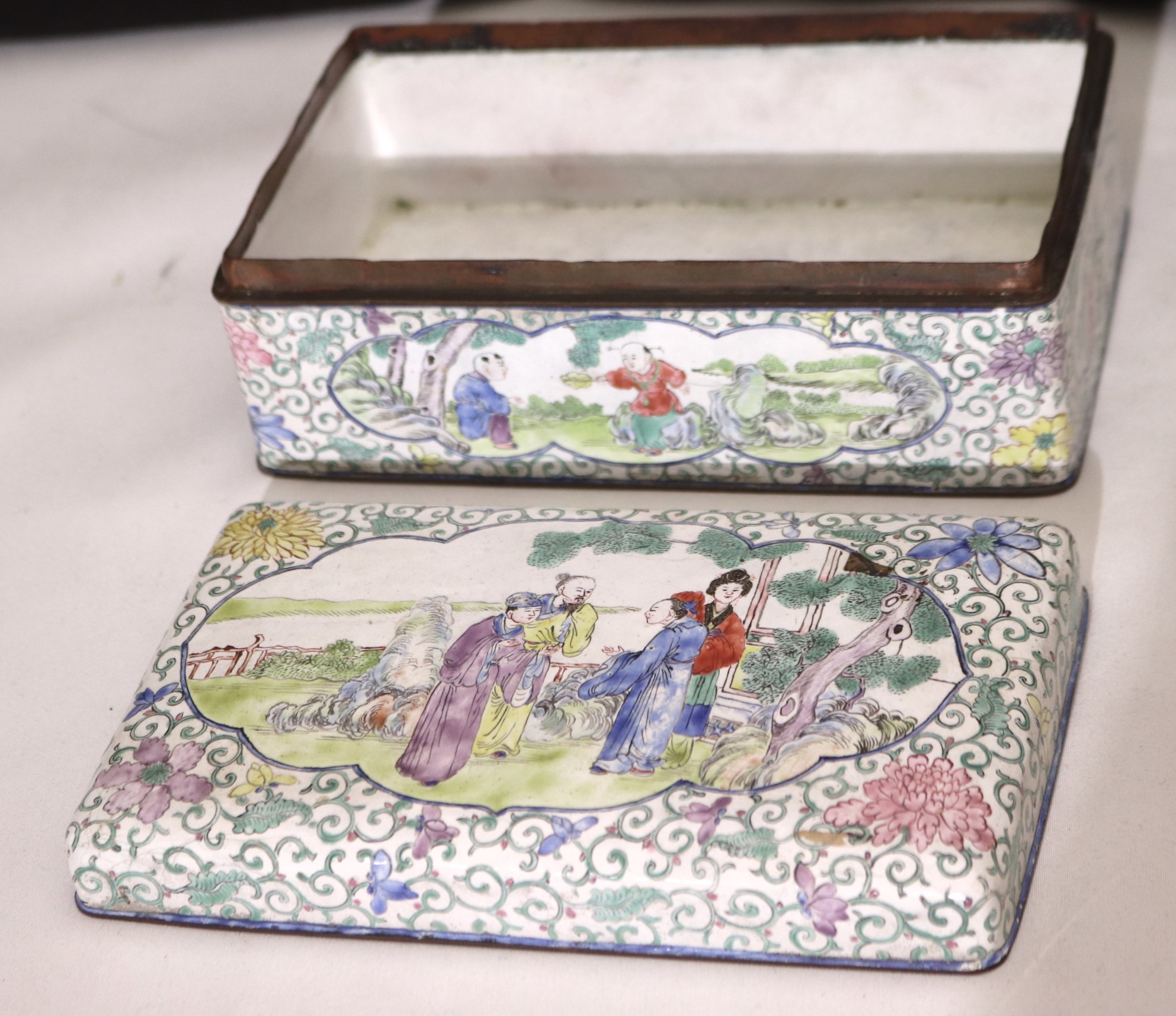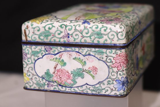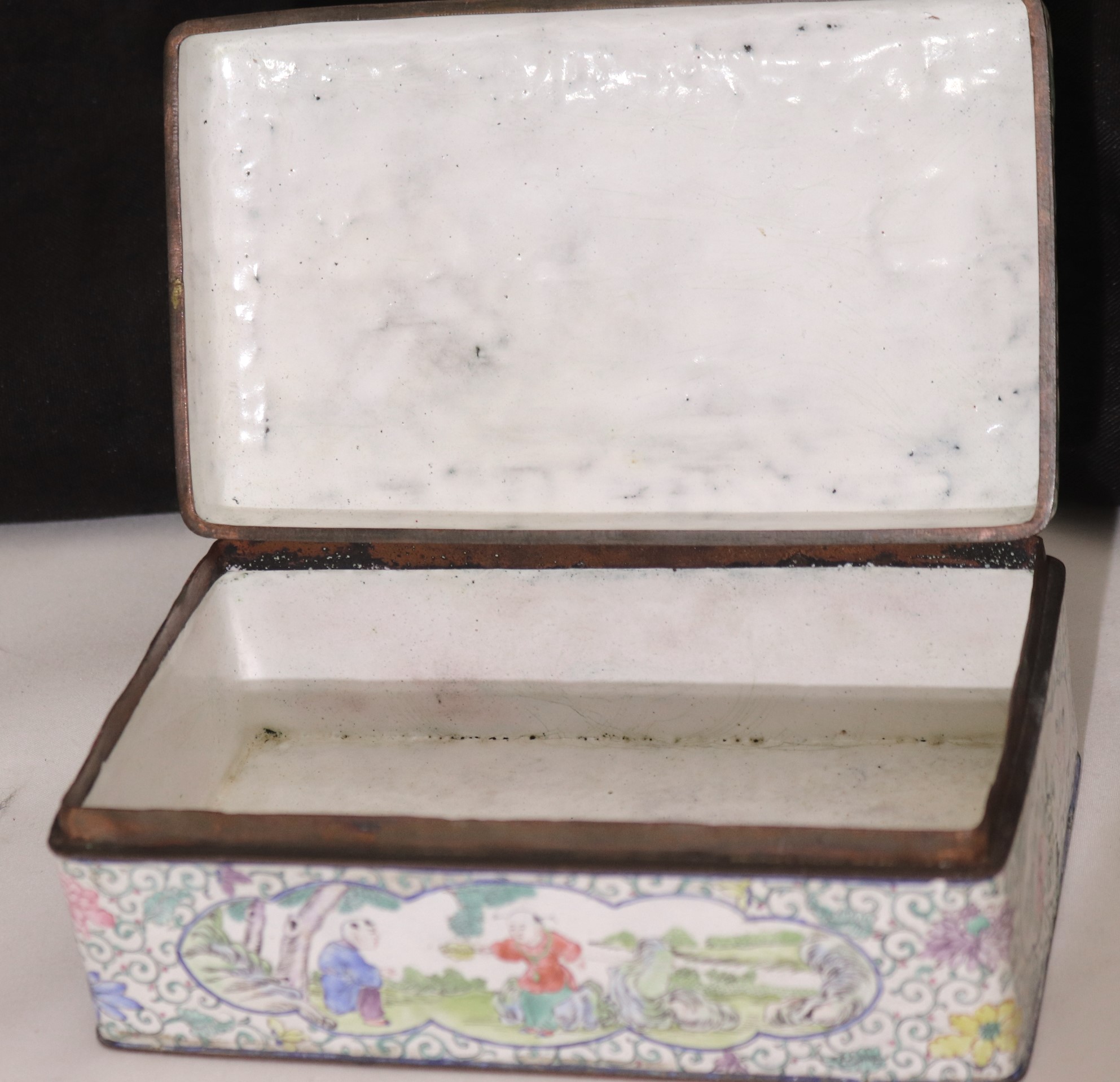 Antique Chinese enamel lidded box with hand painted scenes, and