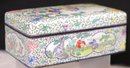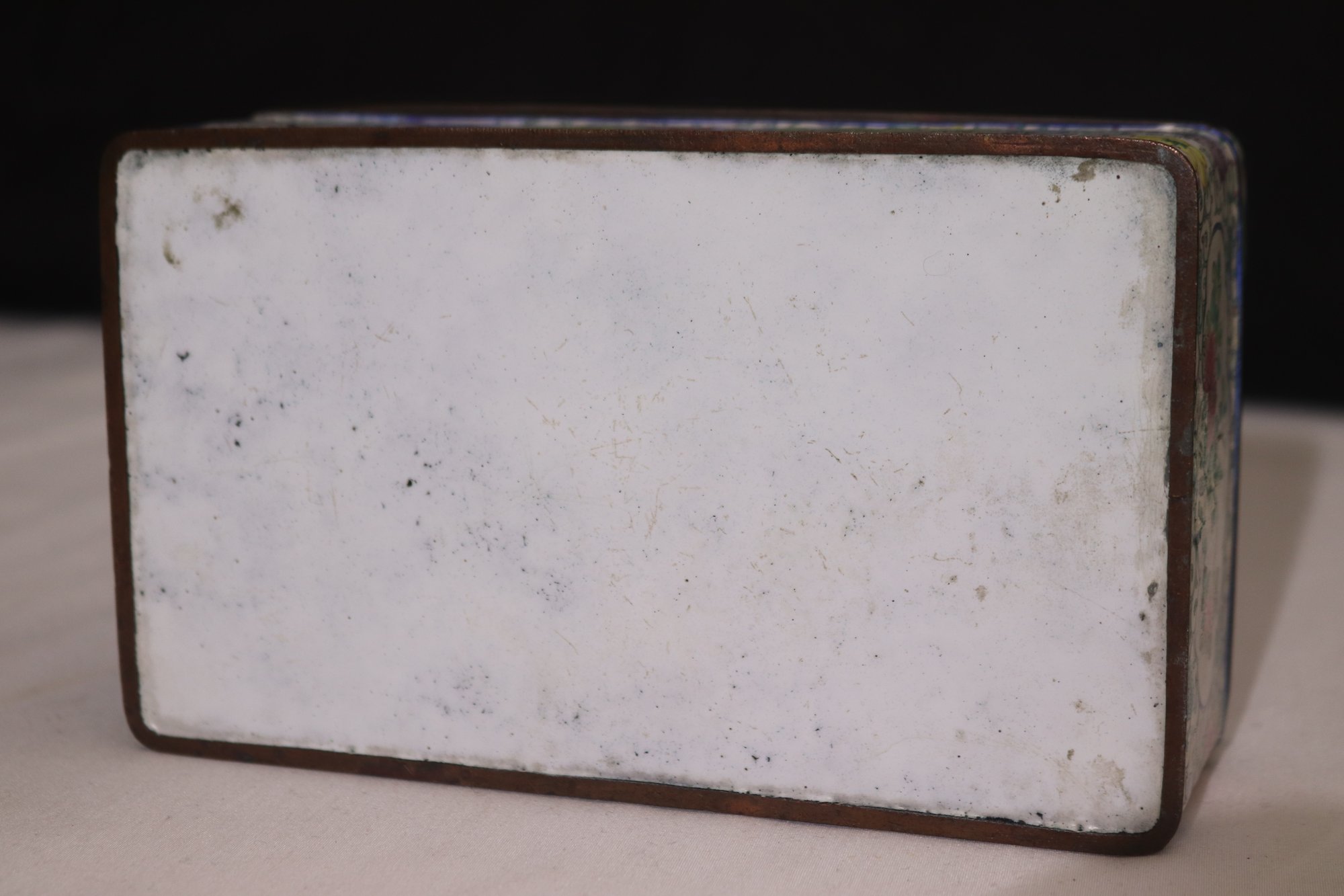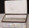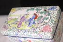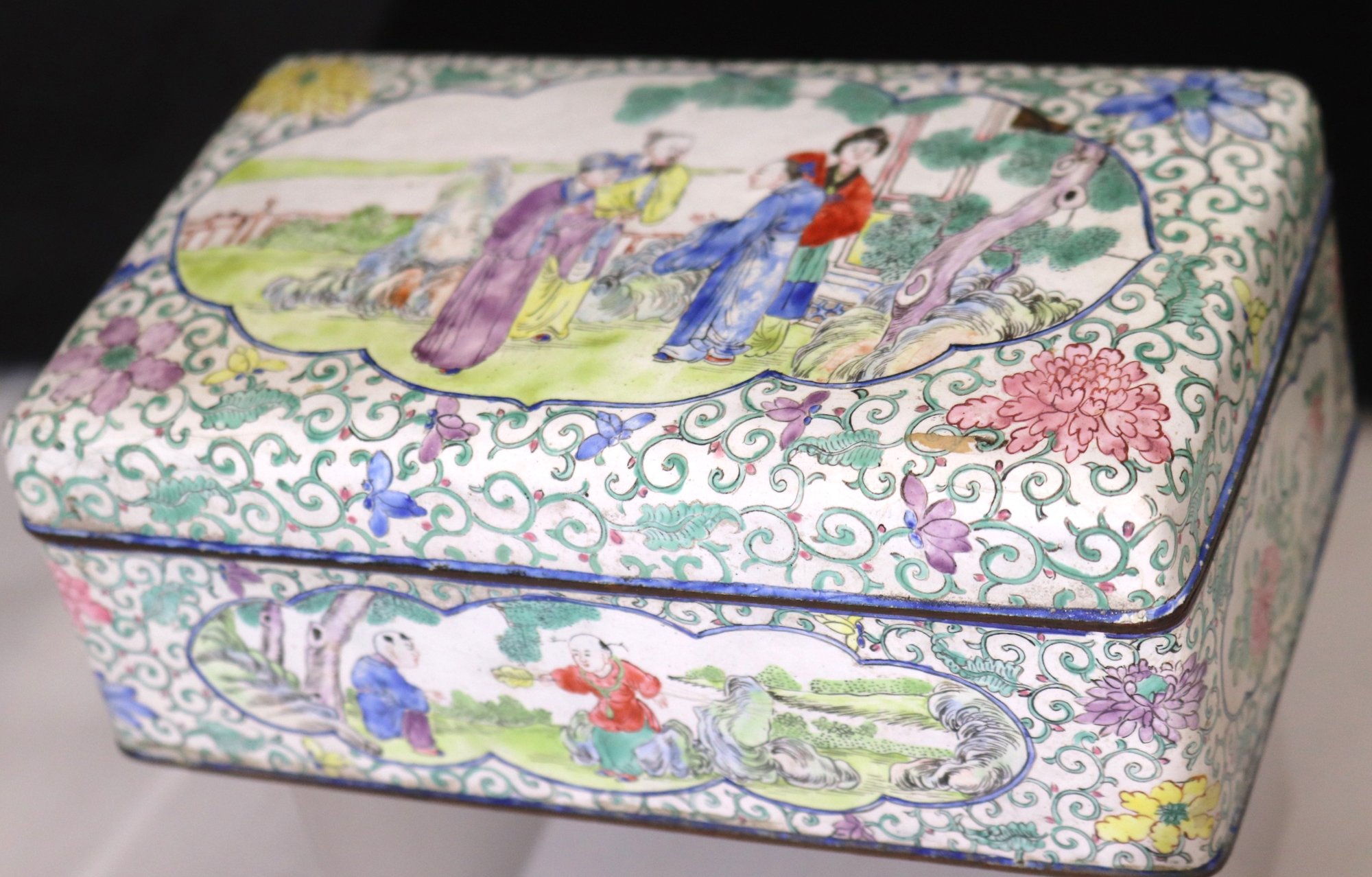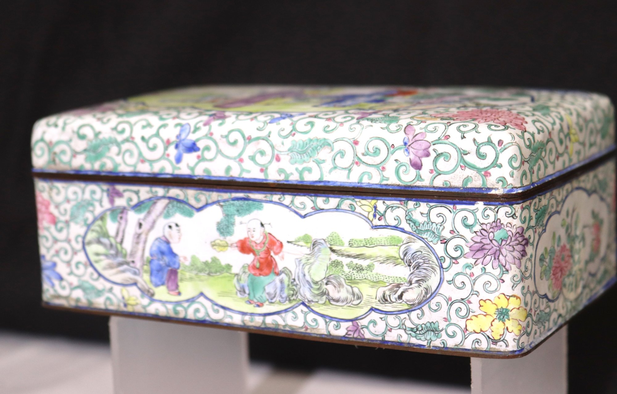 Antique Chinese enamel lidded box with hand painted scenes, and