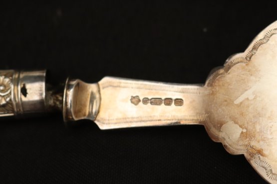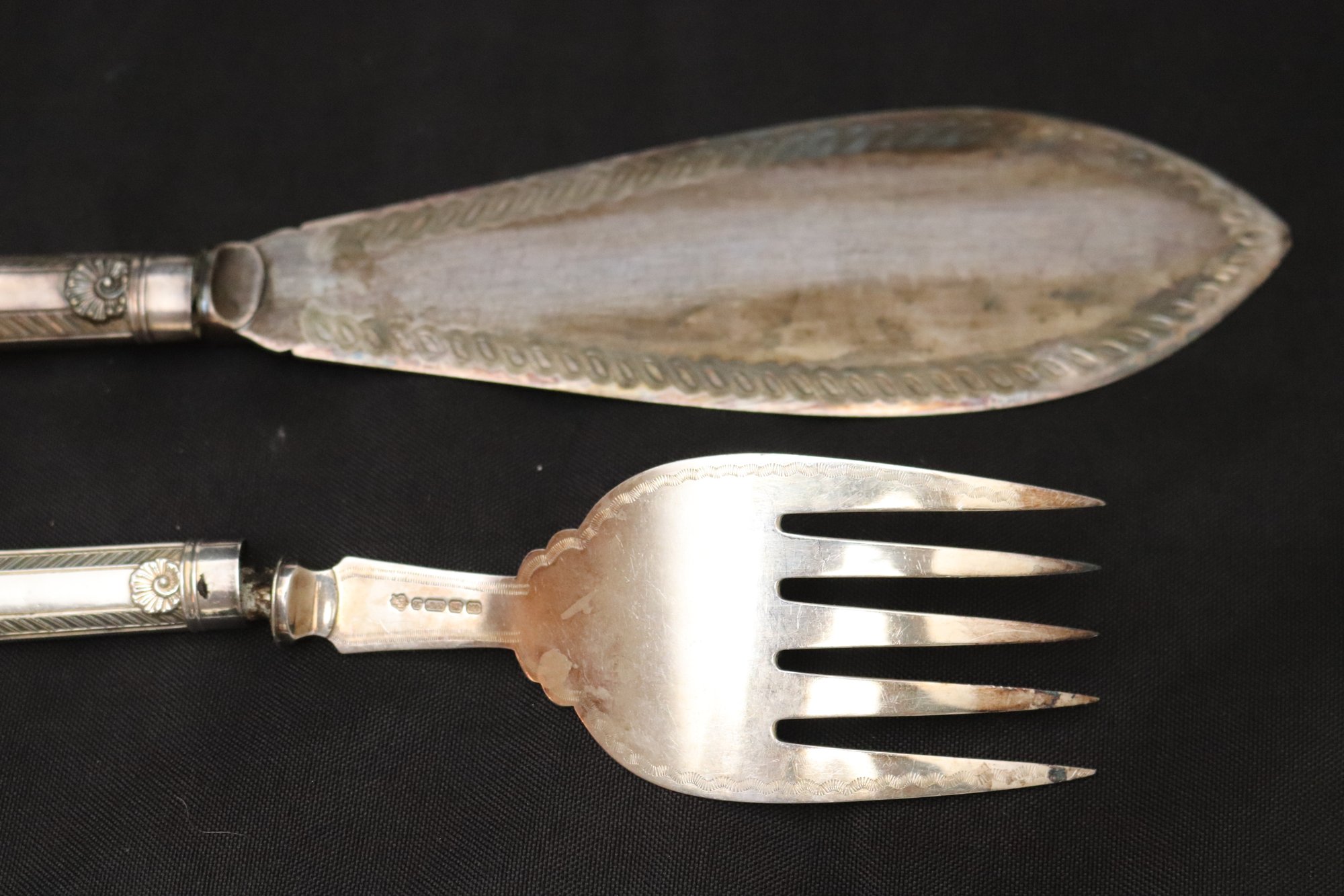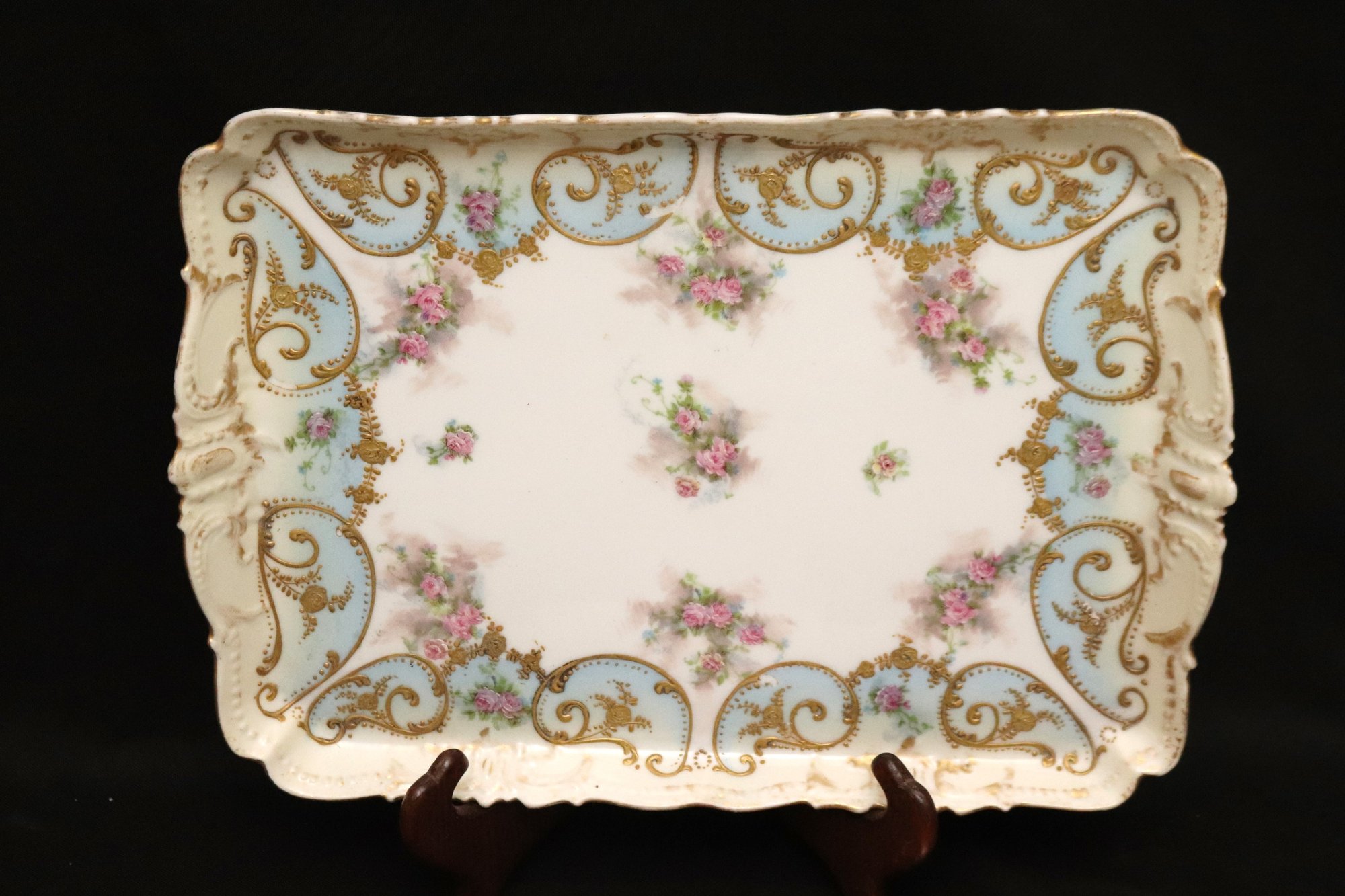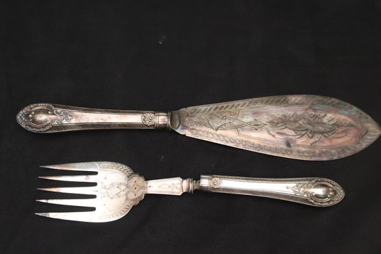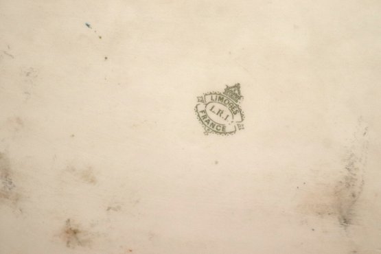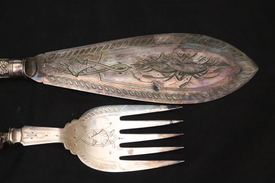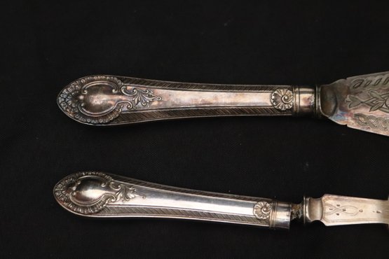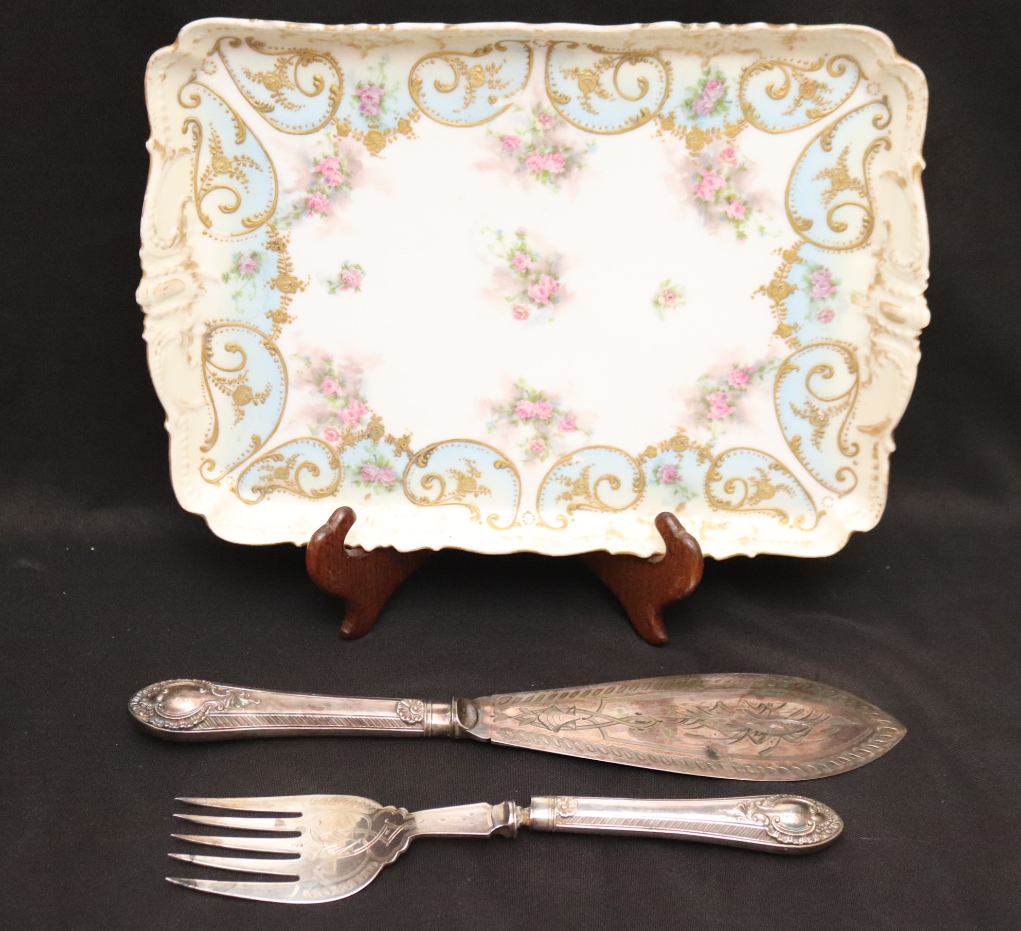 Antique Limoges France hand painted tray and fish servers with sterling silver