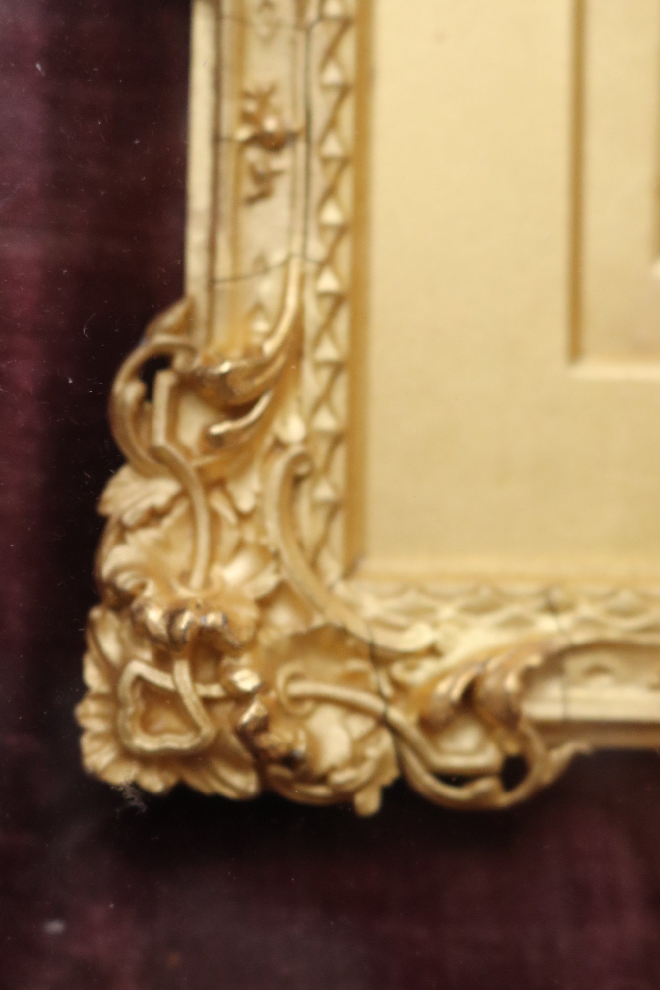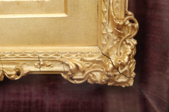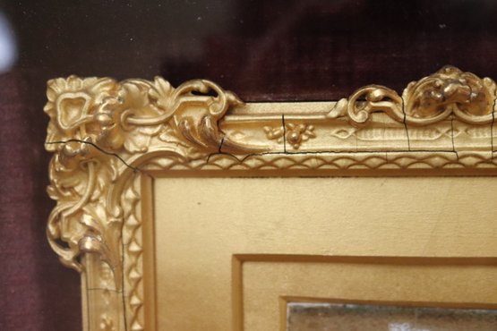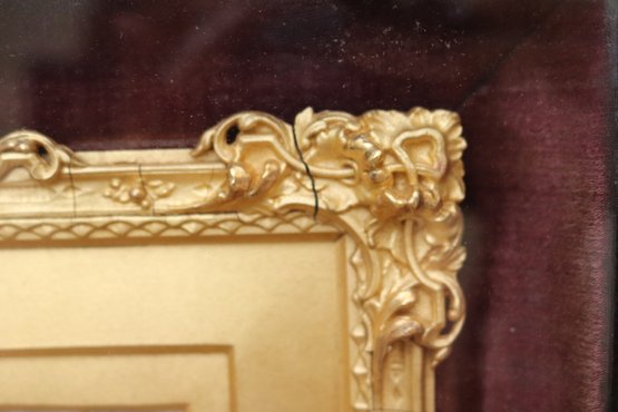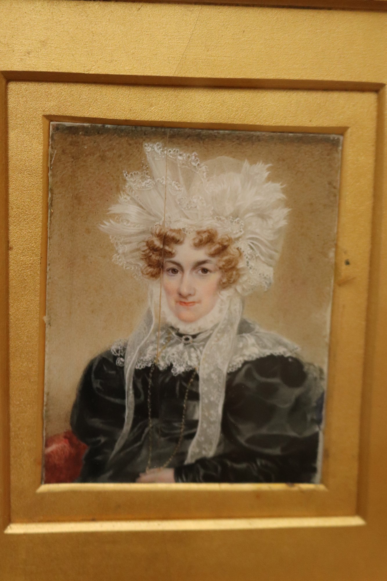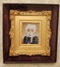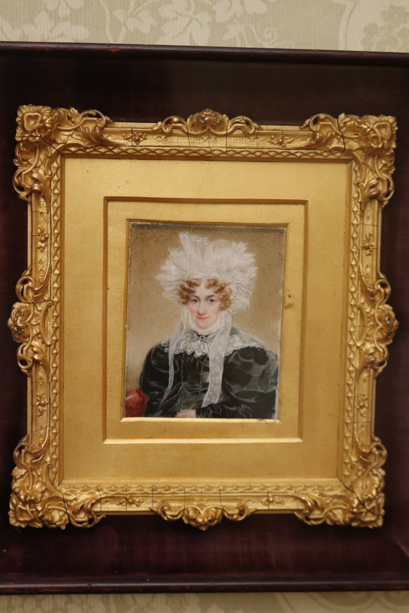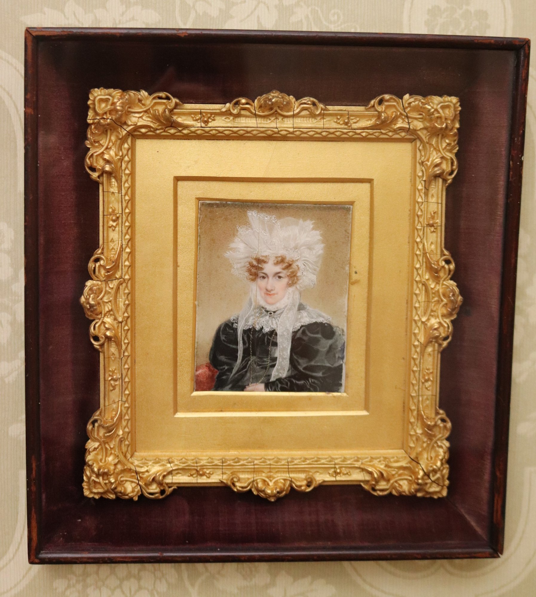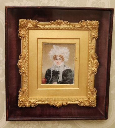 Antique miniature portrait painting in a fancy gilded wood frame encased in a