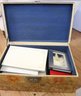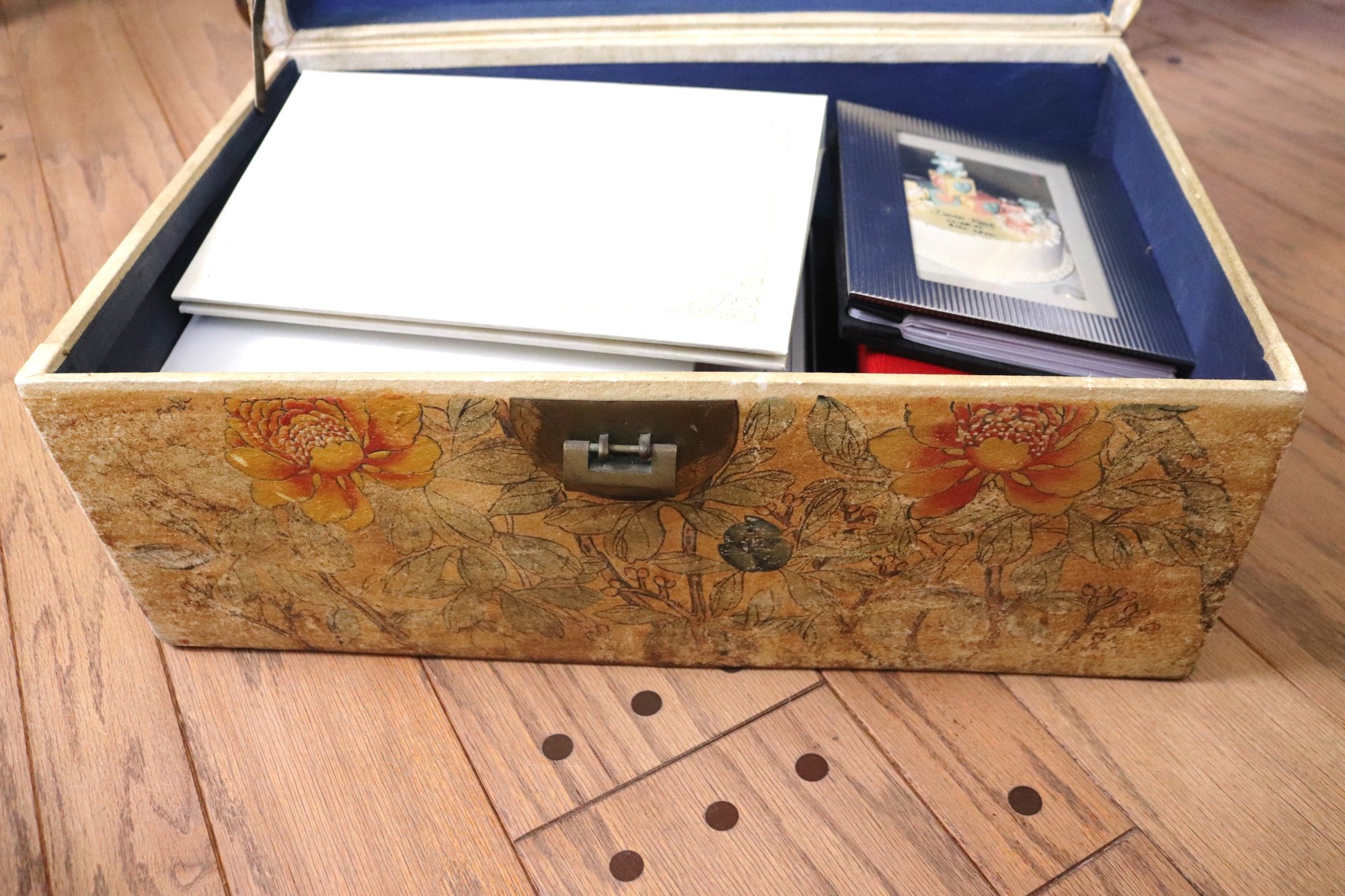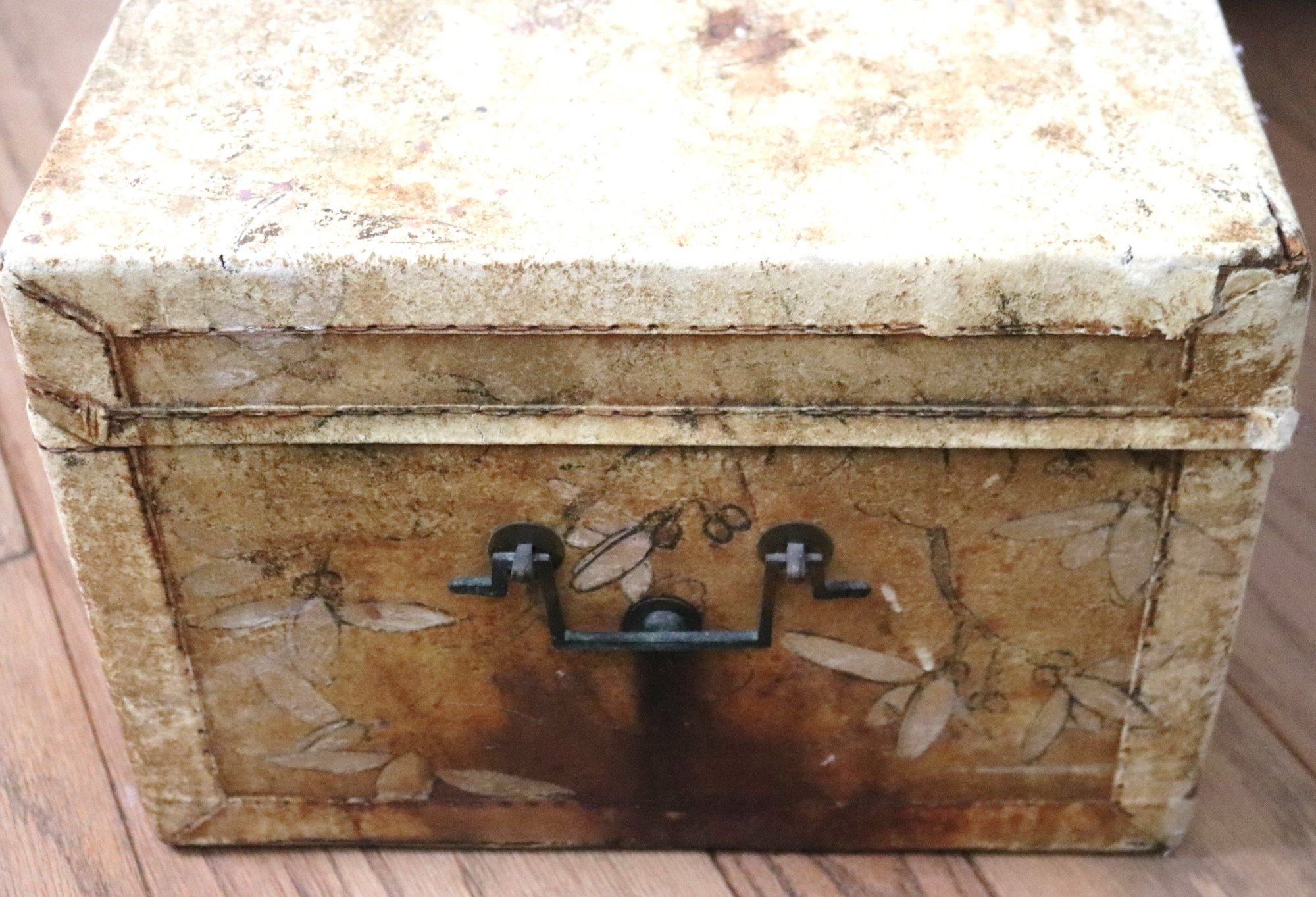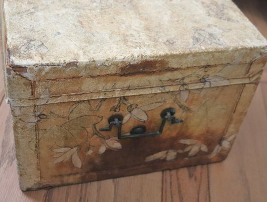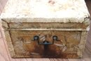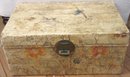 Antique pigskin trunk / chest with painted birds and metal handle. Corners are cracked and there are several age spots on the trunk. A cool