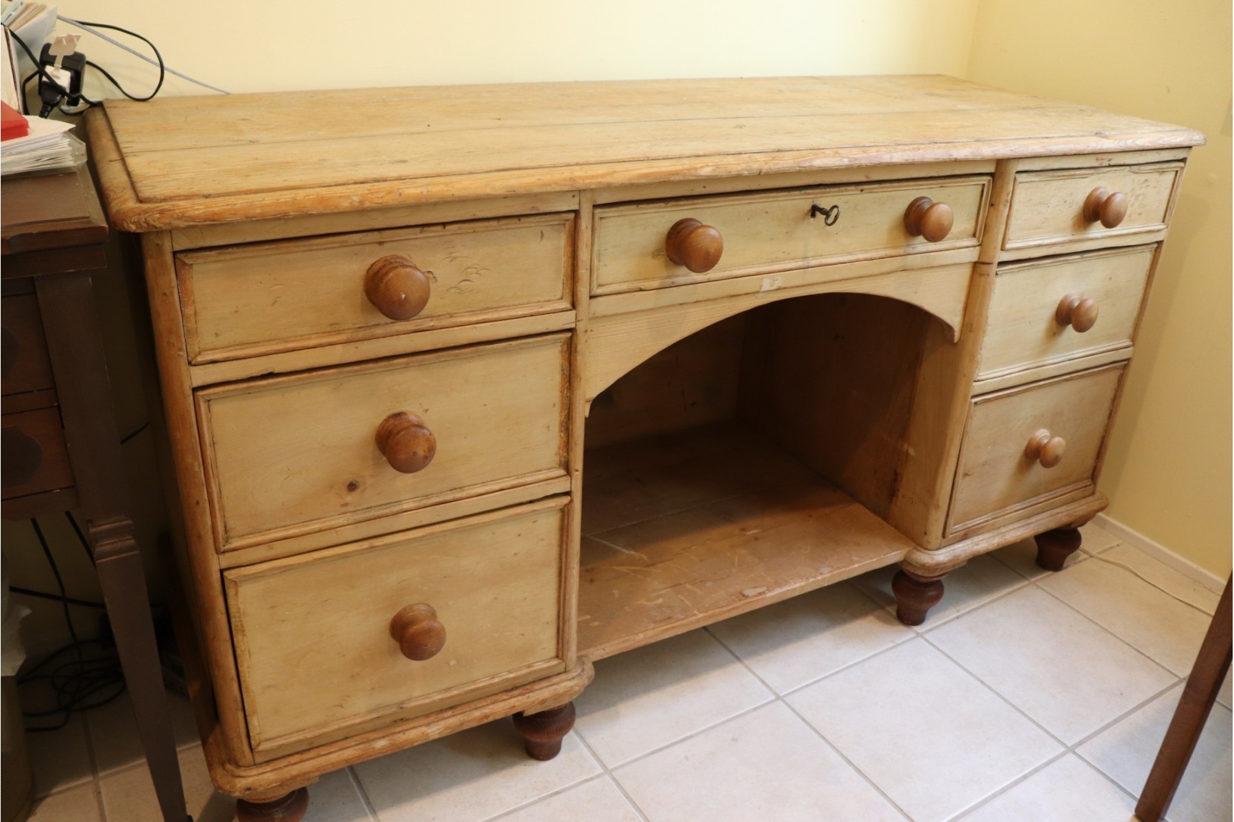 Antique rustic pine desk with 7 drawers. Desk has Age-appropriate wear to top & age crack on side. Please see photos for more details. Desk measures 59.25” L x 22” D x 31.5” T