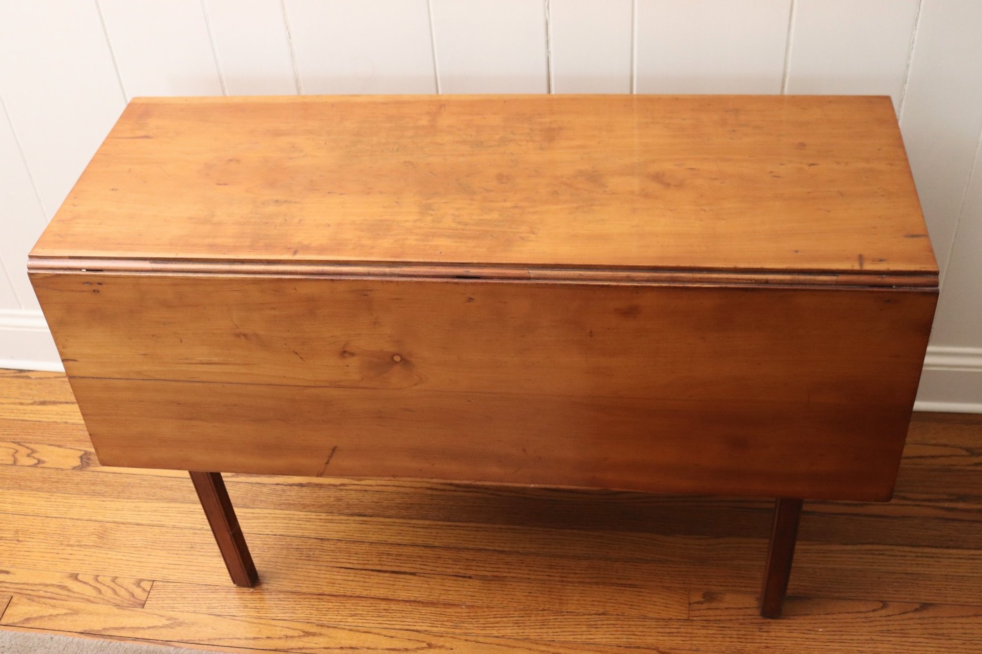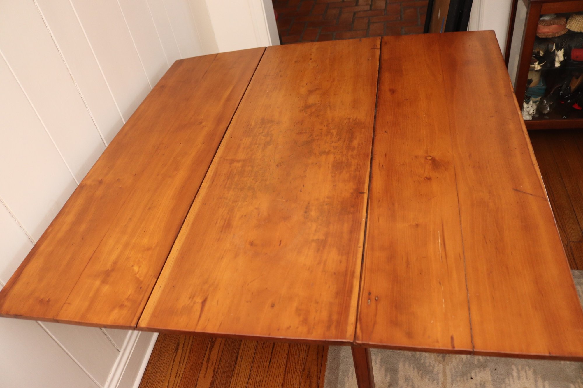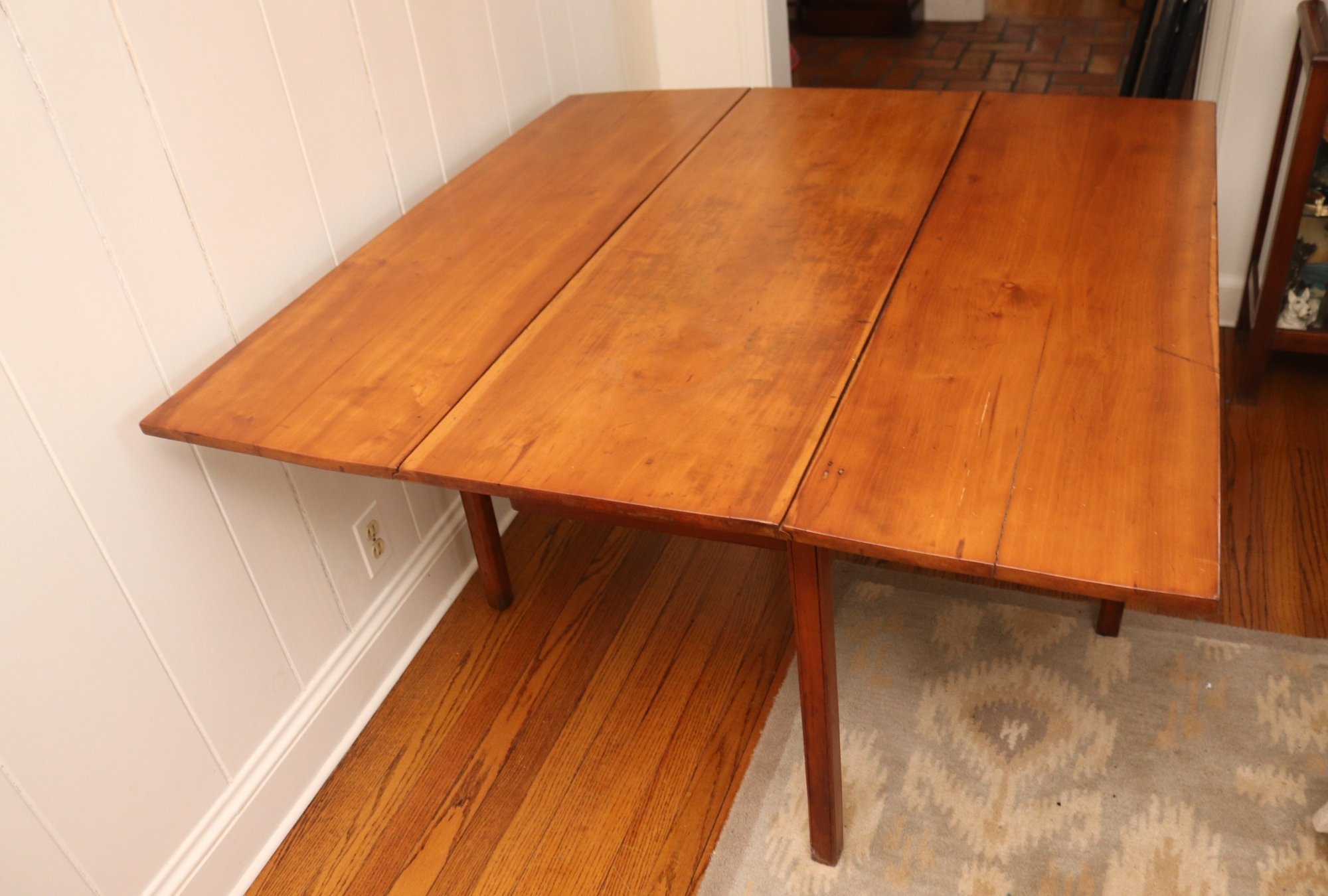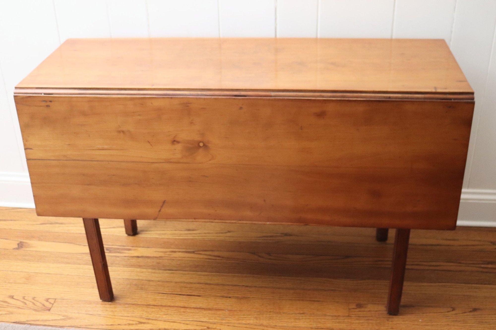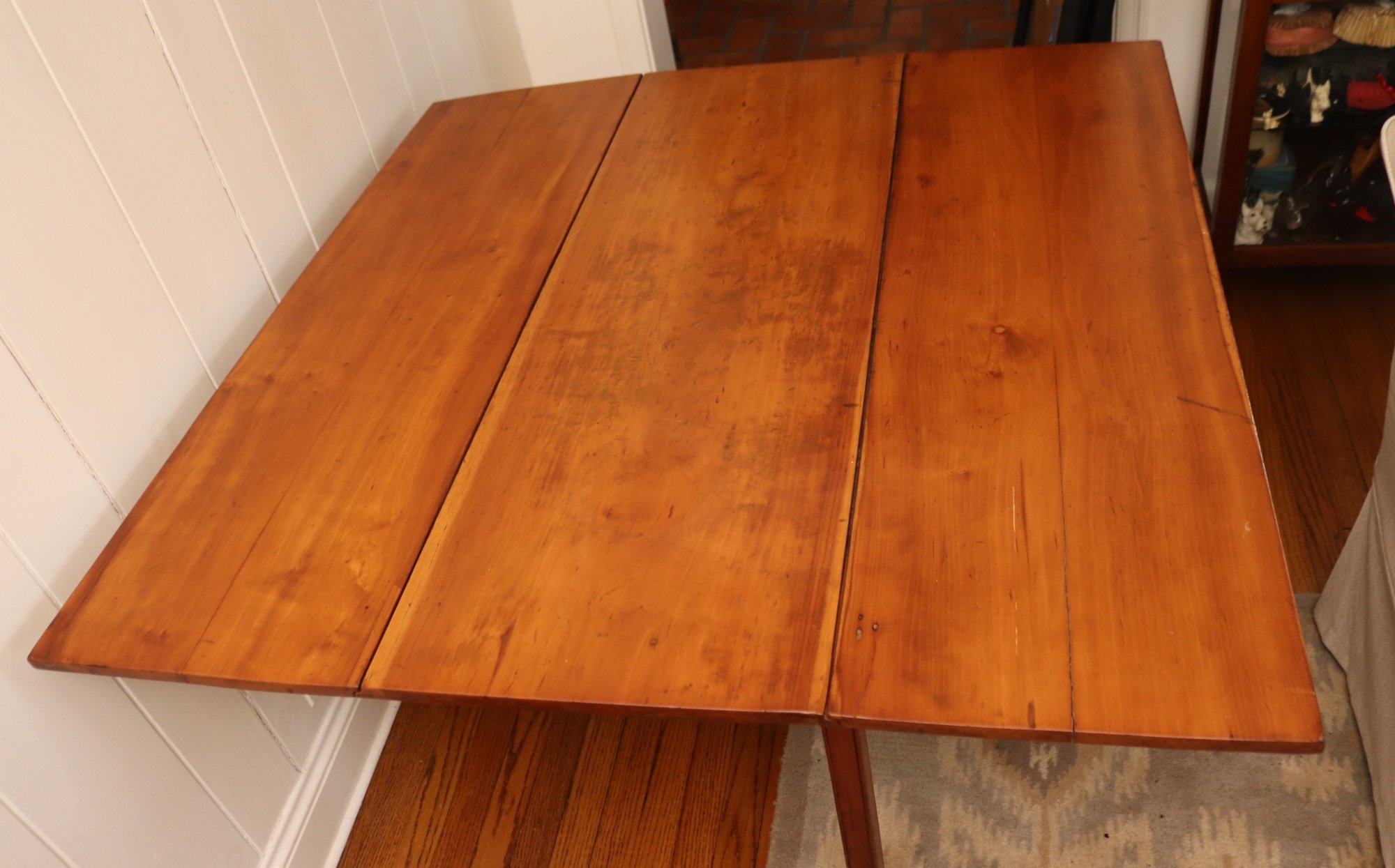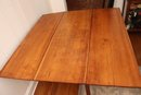This antique rustic primitive style drop leaf wooden table measures approximately 45” wide x 45” long opened x 28” tall. 17.5” long with leaves down. Very good condition for its age. Perfect for smaller spaces.