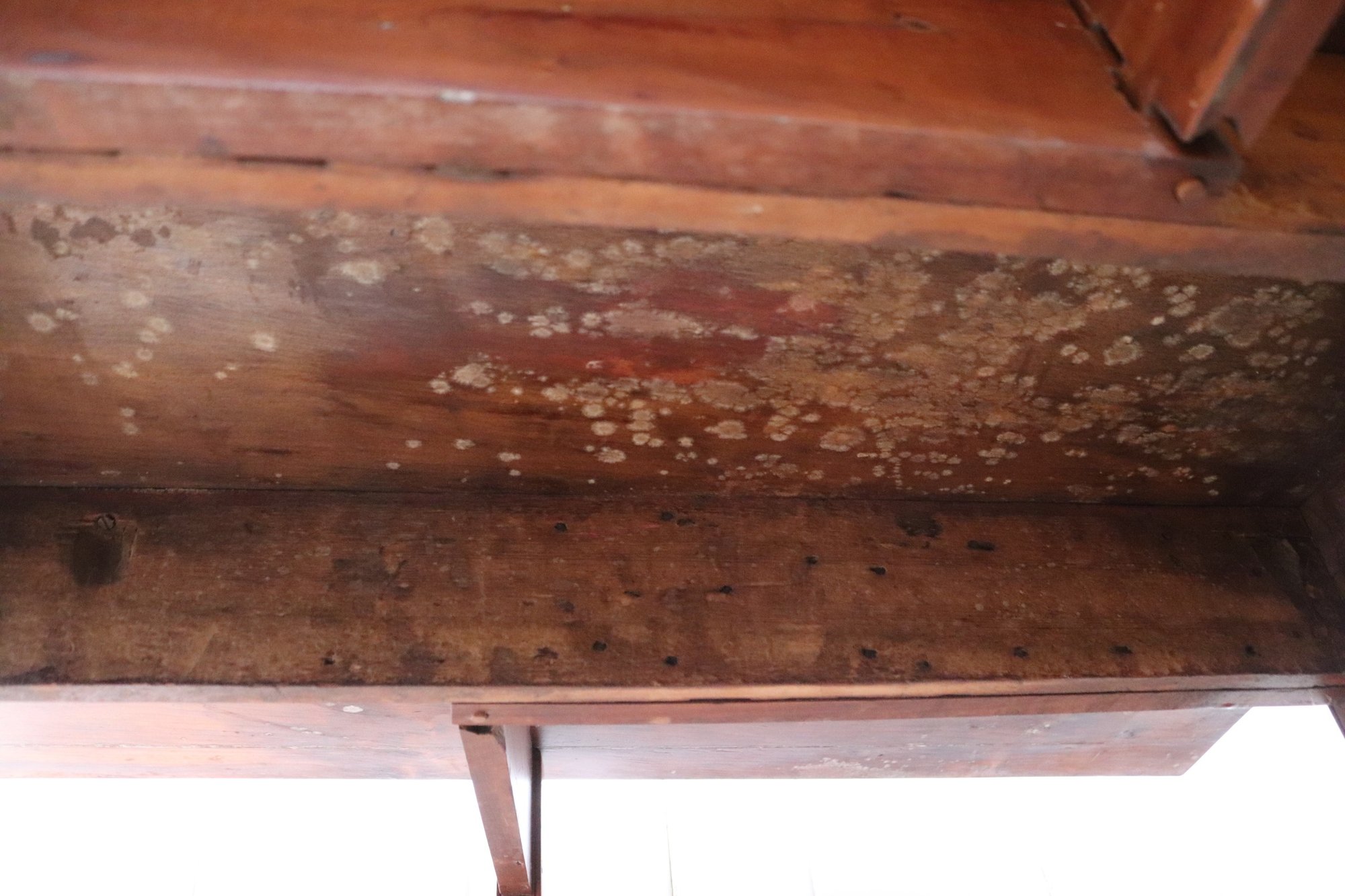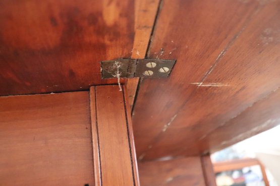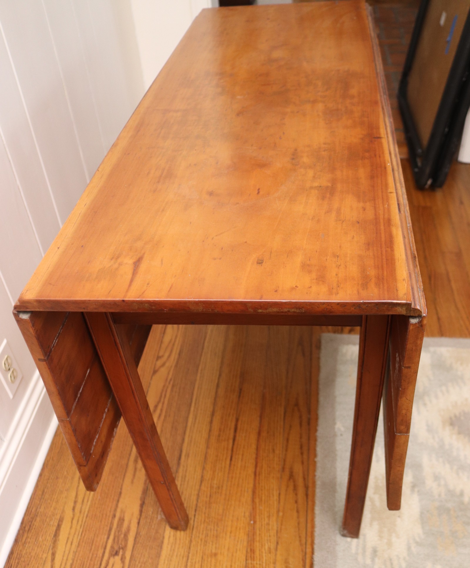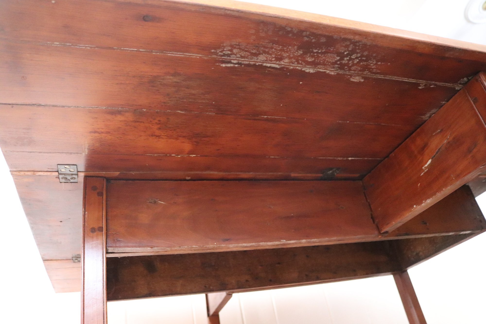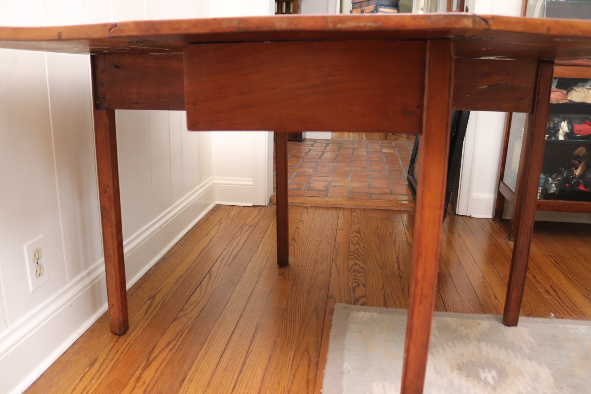 This antique rustic primitive style drop leaf wooden table measures approximately 45” wide x 45” long opened x 28” tall. 17.5” long with leaves down. Very good condition for its age. Perfect for smaller spaces.