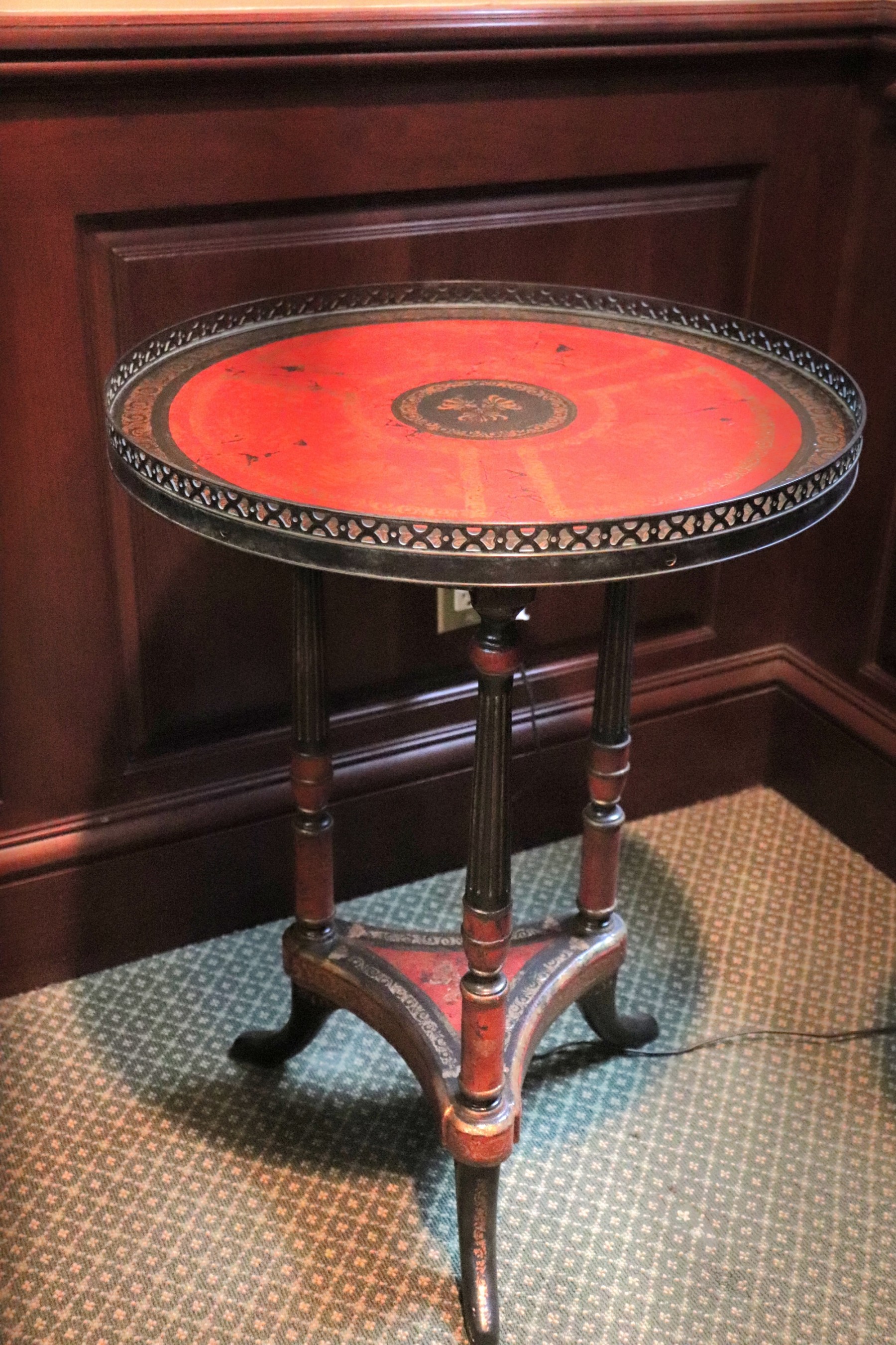 Antique Style Leather Top Side Table With A Beautiful Gallerie Railing Approximately 20” X 27” Tall, Beautiful Piece