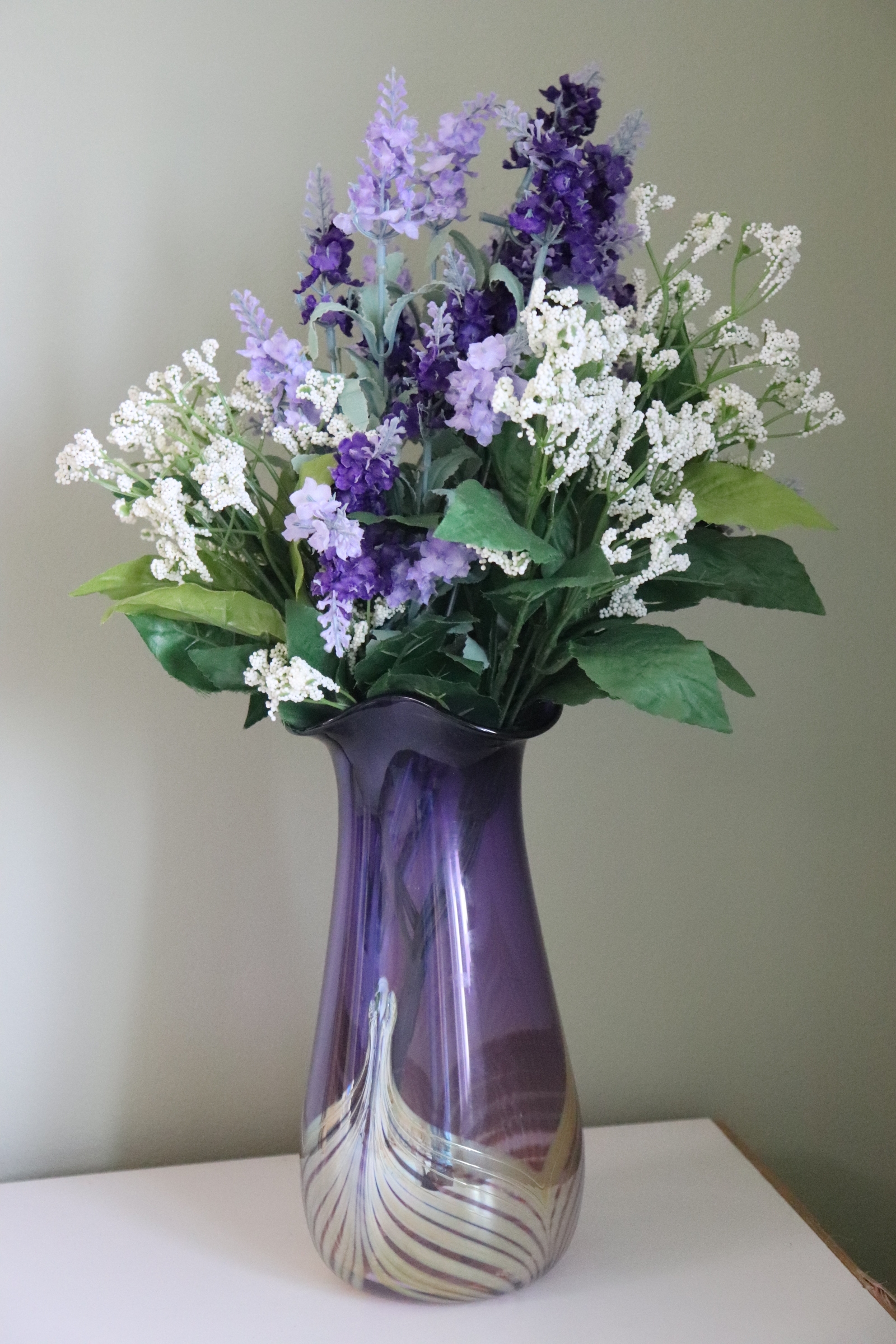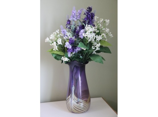 Purple Art glass vase with pulled feather design. Vase is 10” T x 5” Dia.