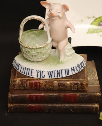 Vaseline dish, 3 small antique books and piggie match holder. The