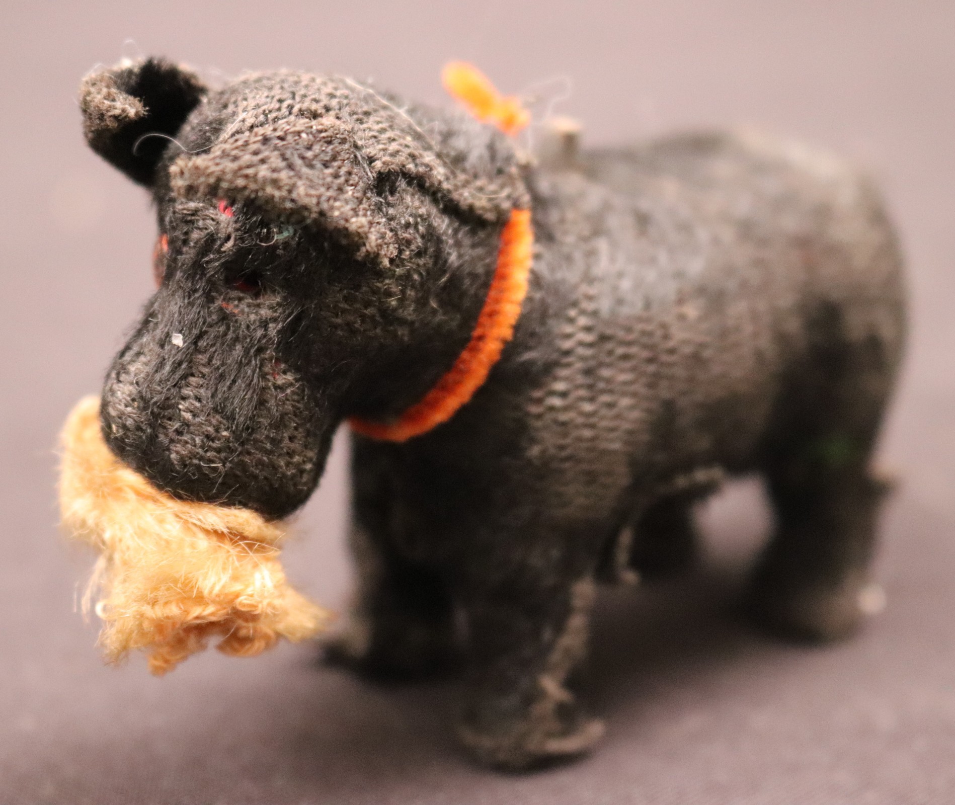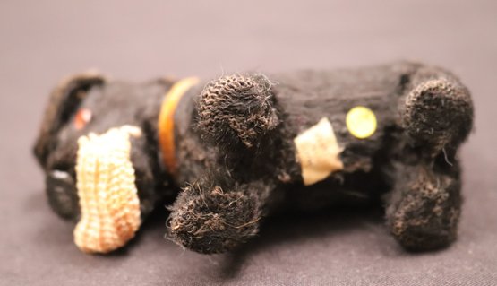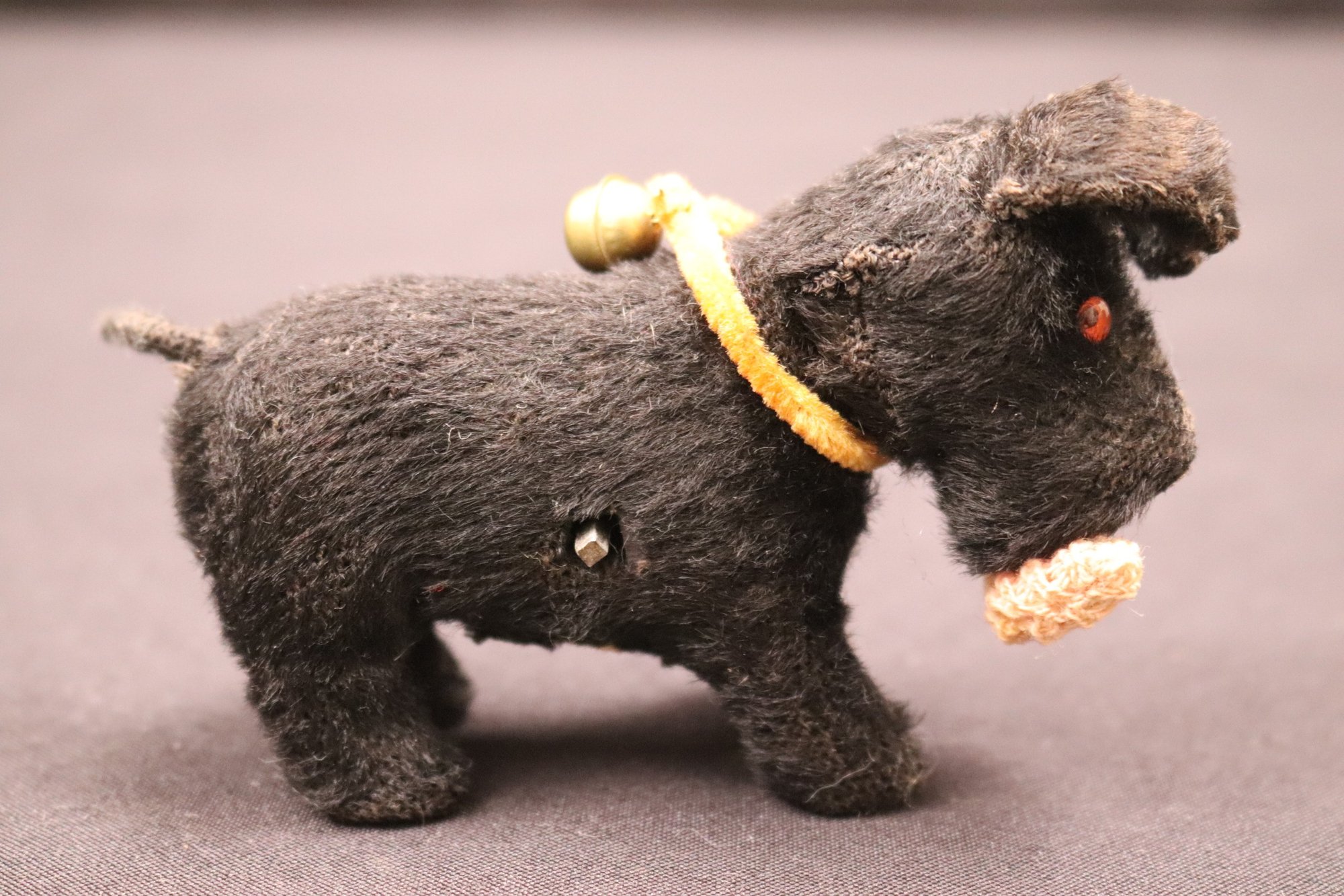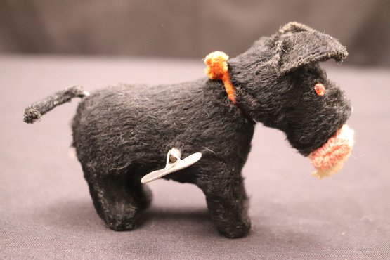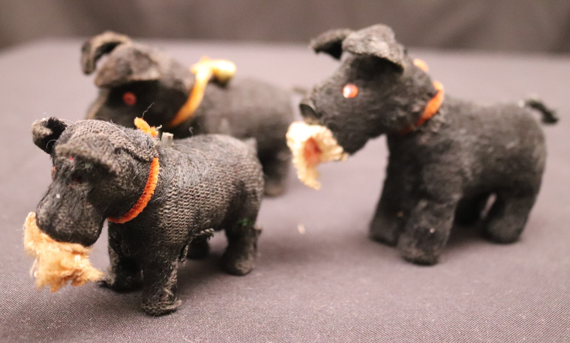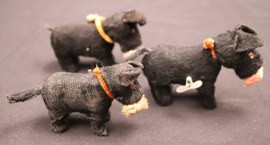 These small vintage black plush covered Scottie dog wind-up toys measure approximately 4” long. All toys are wind up, only one has a key. Not tested. One of the dogs is missing one eye. Age-related wear consistent with age and some loss of fur as pictured.