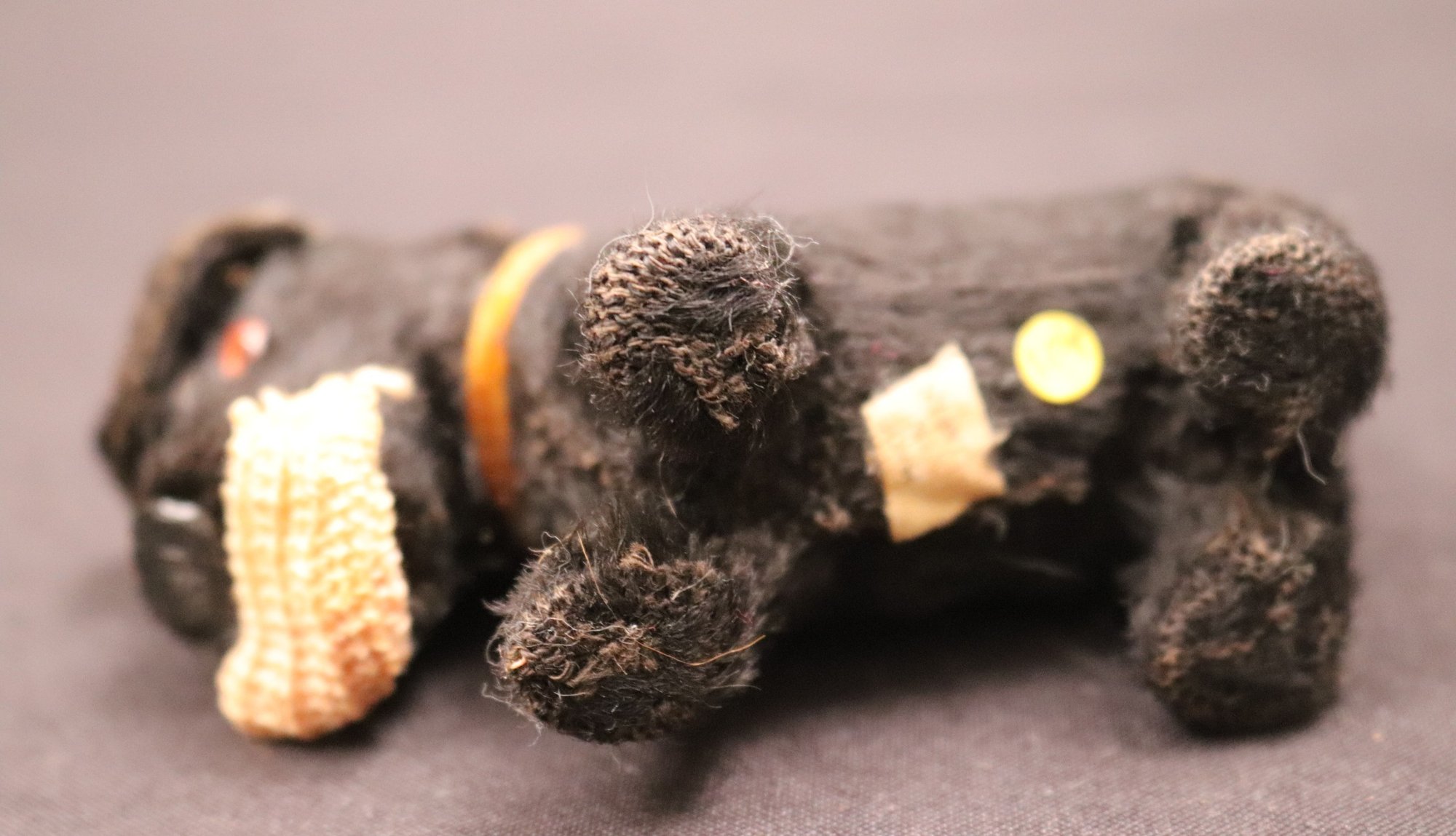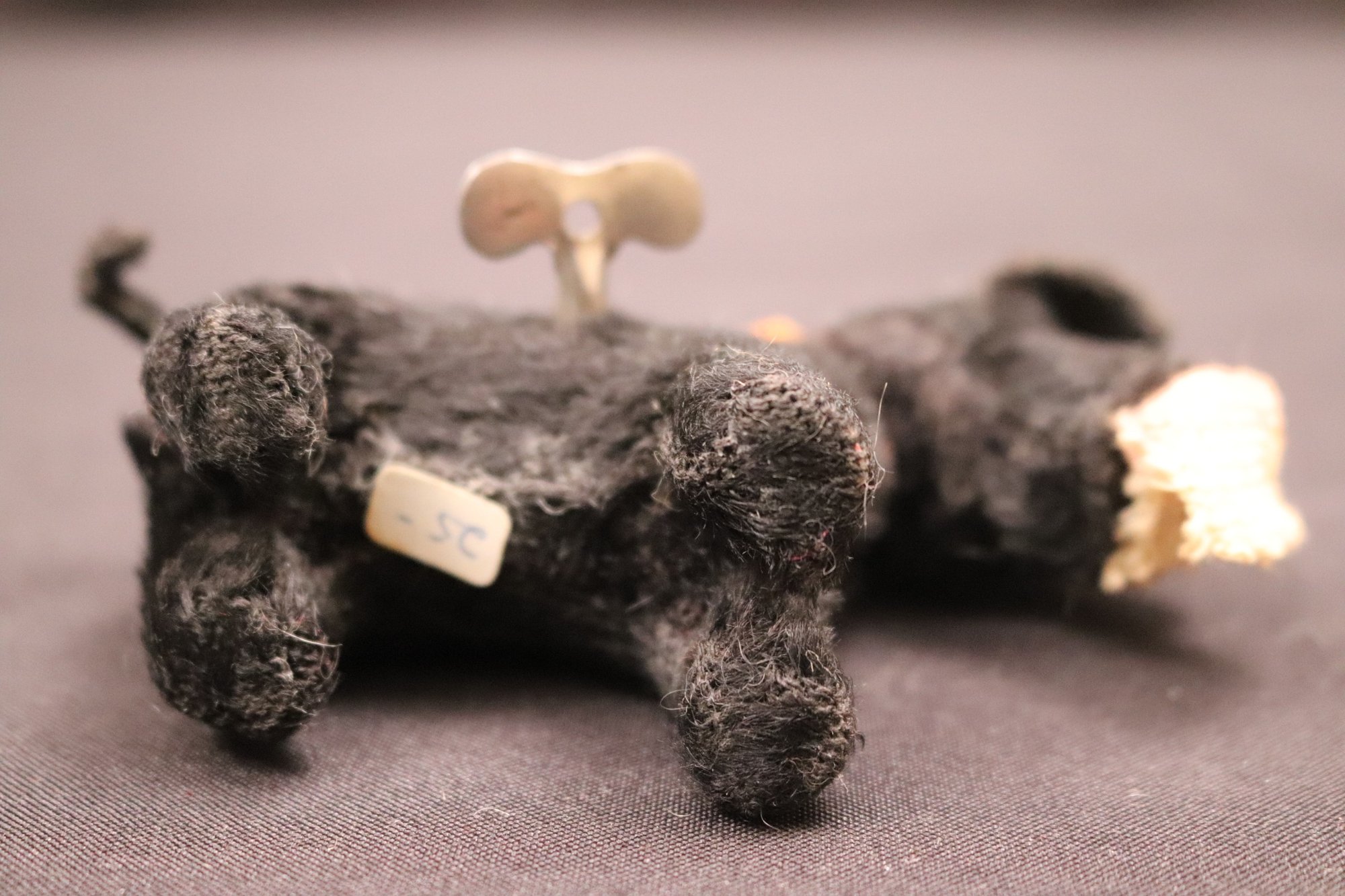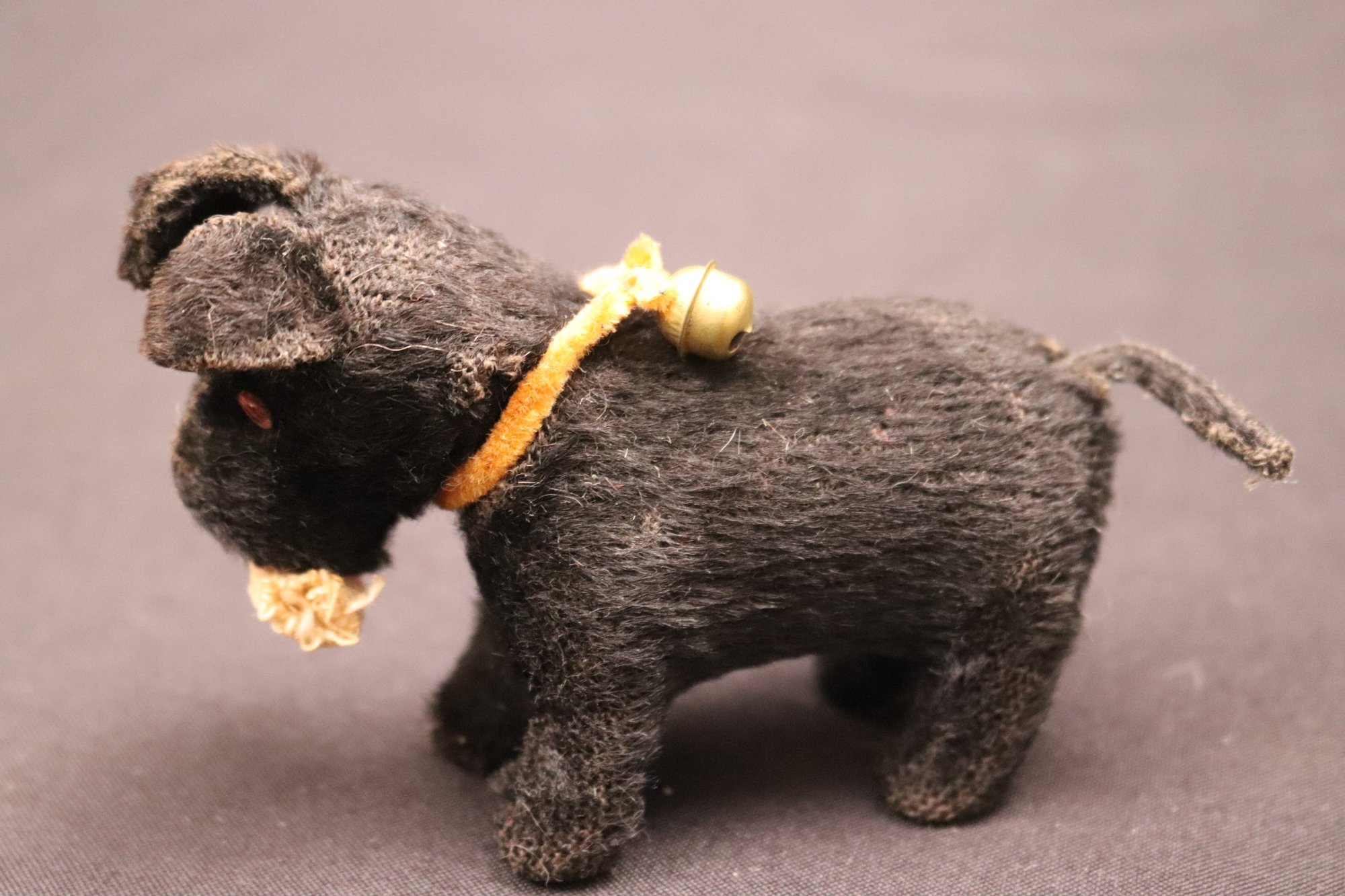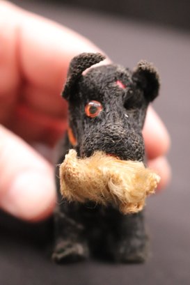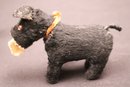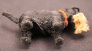 These small vintage black plush covered Scottie dog wind-up toys measure approximately 4” long. All toys are wind up, only one has a key. Not tested. One of the dogs is missing one eye. Age-related wear consistent with age and some loss of fur as pictured.