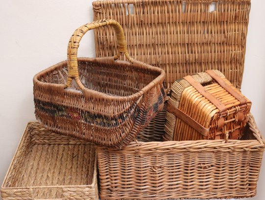 Assorted wicker baskets as pictured may show some wear or separation as pictured. The larger basket with lid measures Approximately 19” w x 13” d x 9” tall.
