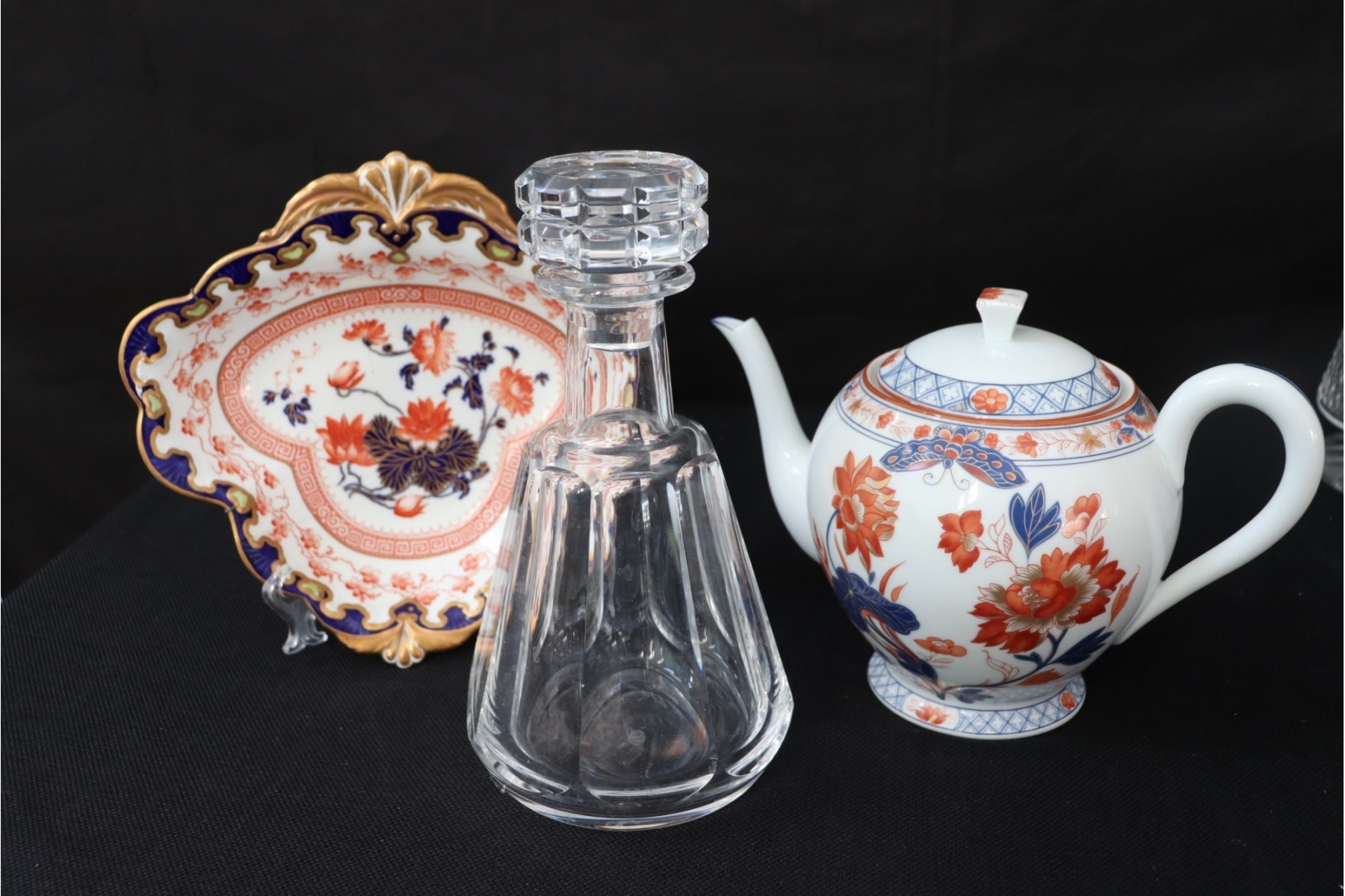The Baccarat decanter is 9.25” T, the Haviland Limoges teapot is Les Papillons & antique shell shaped dish is hand painted, with age crack on bottom. The teapot is 10” W. The plate is 9.25” W