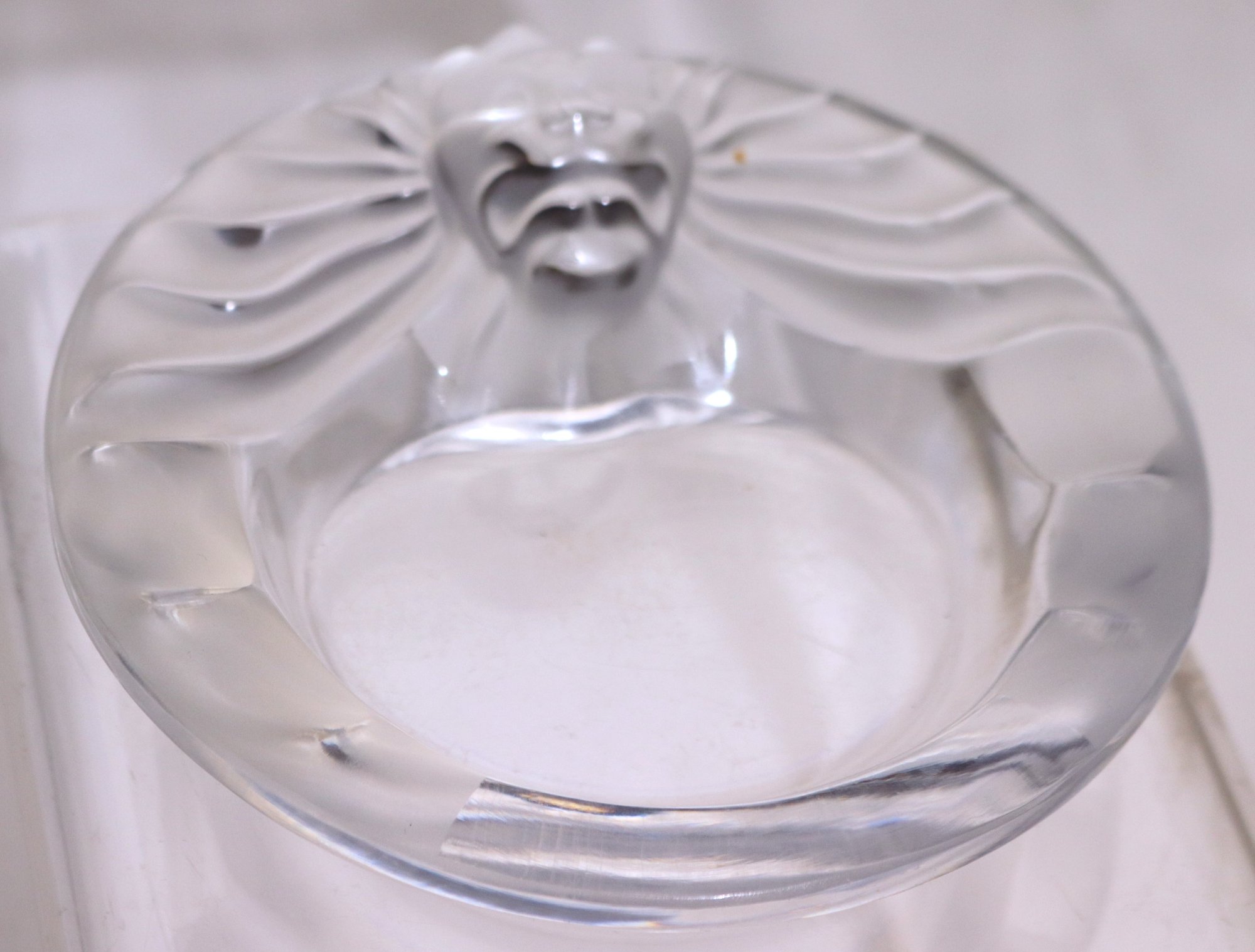 Baccarat vase and Lalique frosted lion’s head ashtray.