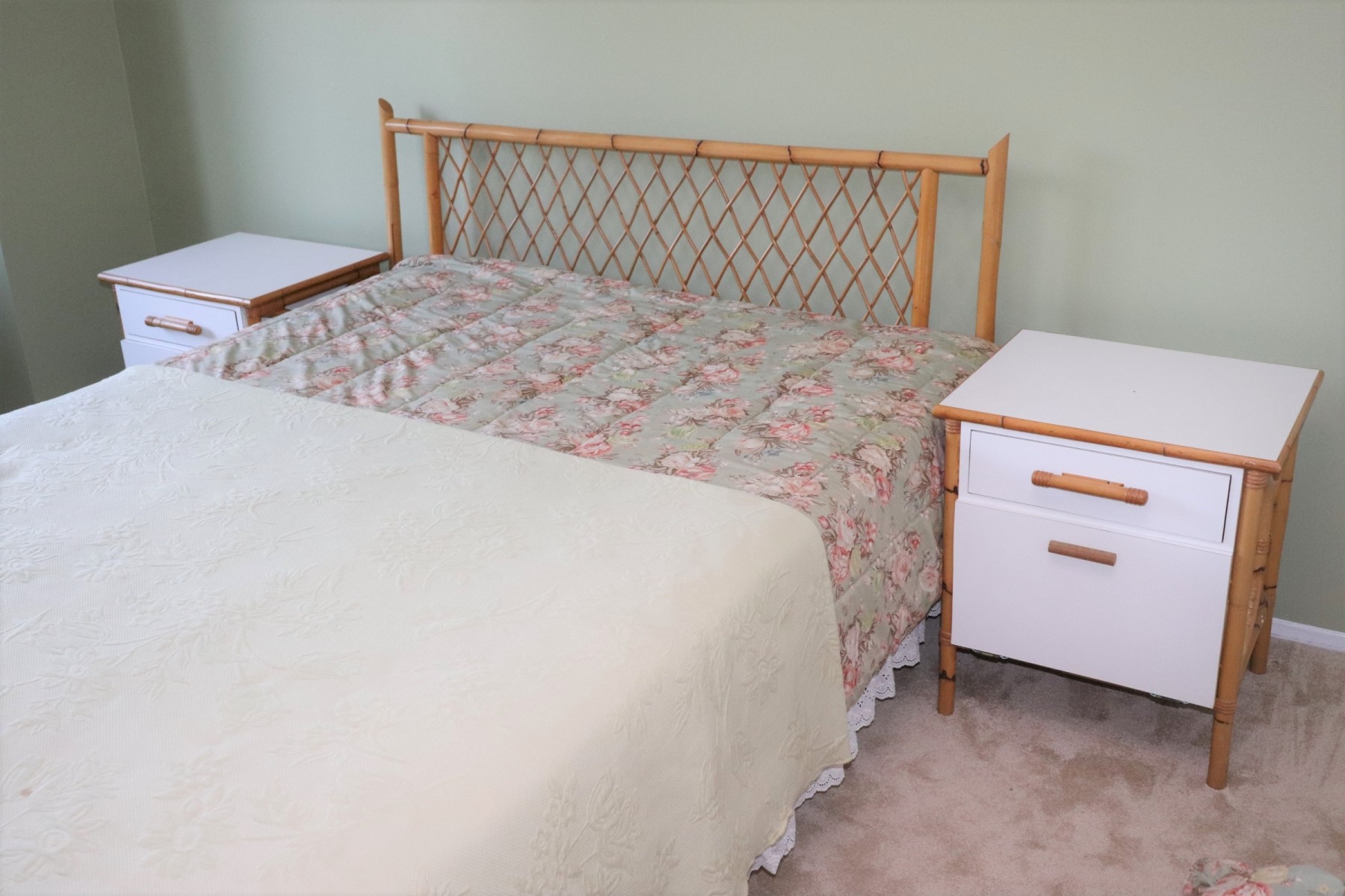Bamboo queen size headboard, pair of nightstands, and bedding. Headboard is 63” w, 38.75” h. Mattress can be included if you would like. Nightstands are 22” W x 18” D, 25” T