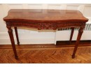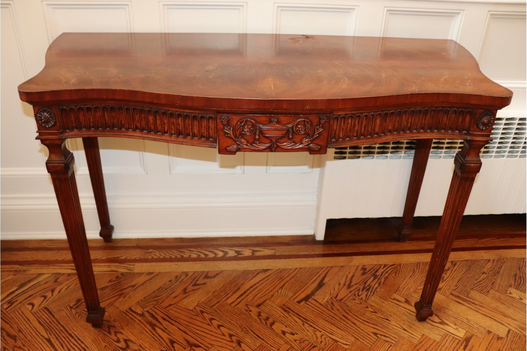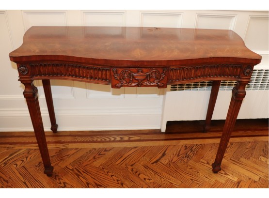 Vintage Carved English Style Console With Curved Front , Carved Apron - Top Shows Wear And Water Marks, May Want To Refinish Nice Vintage Piece With Tongue And Groove Woodwork Measures Approximately 54” W X 24” D X 34.5” Tall.