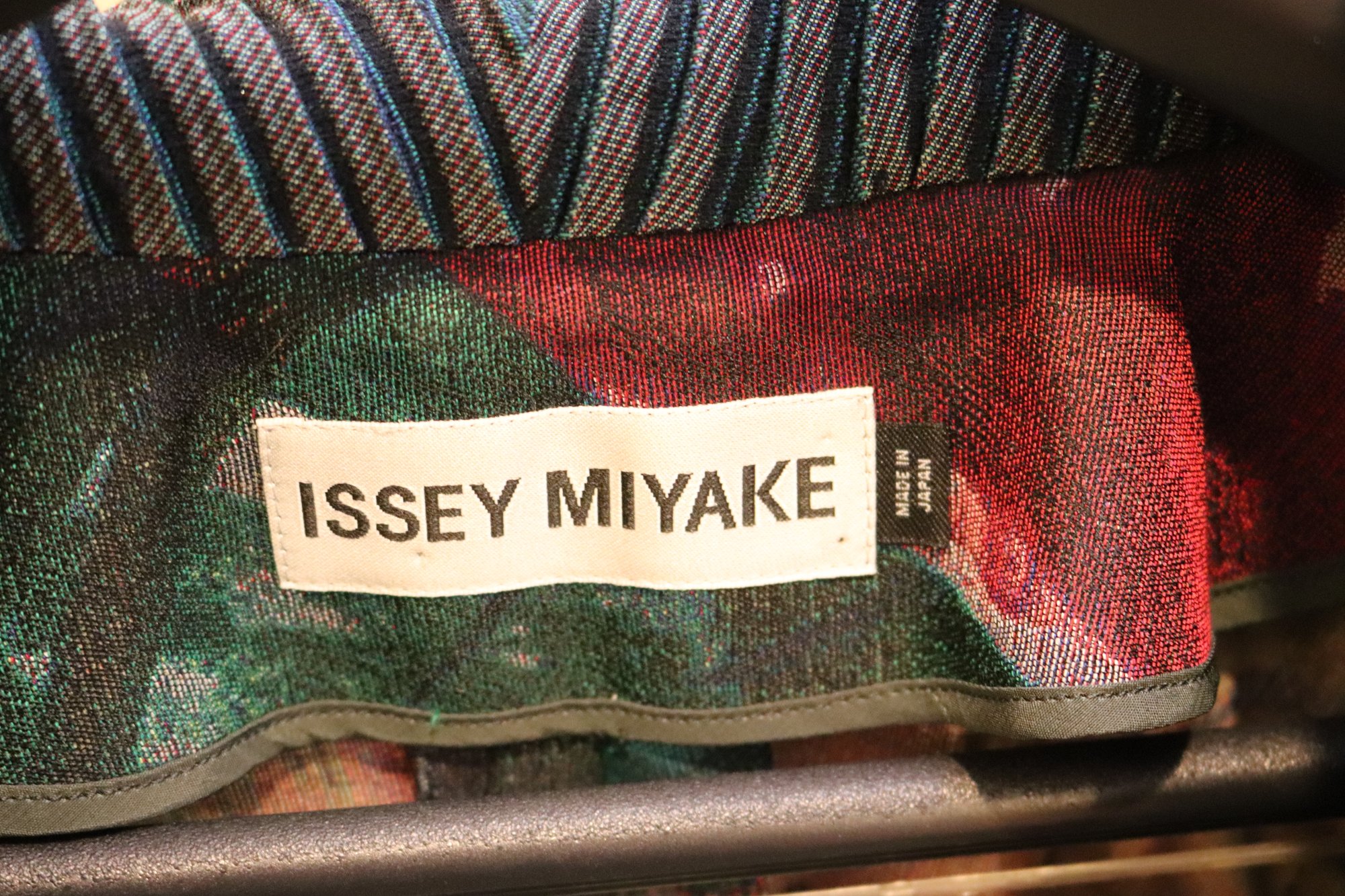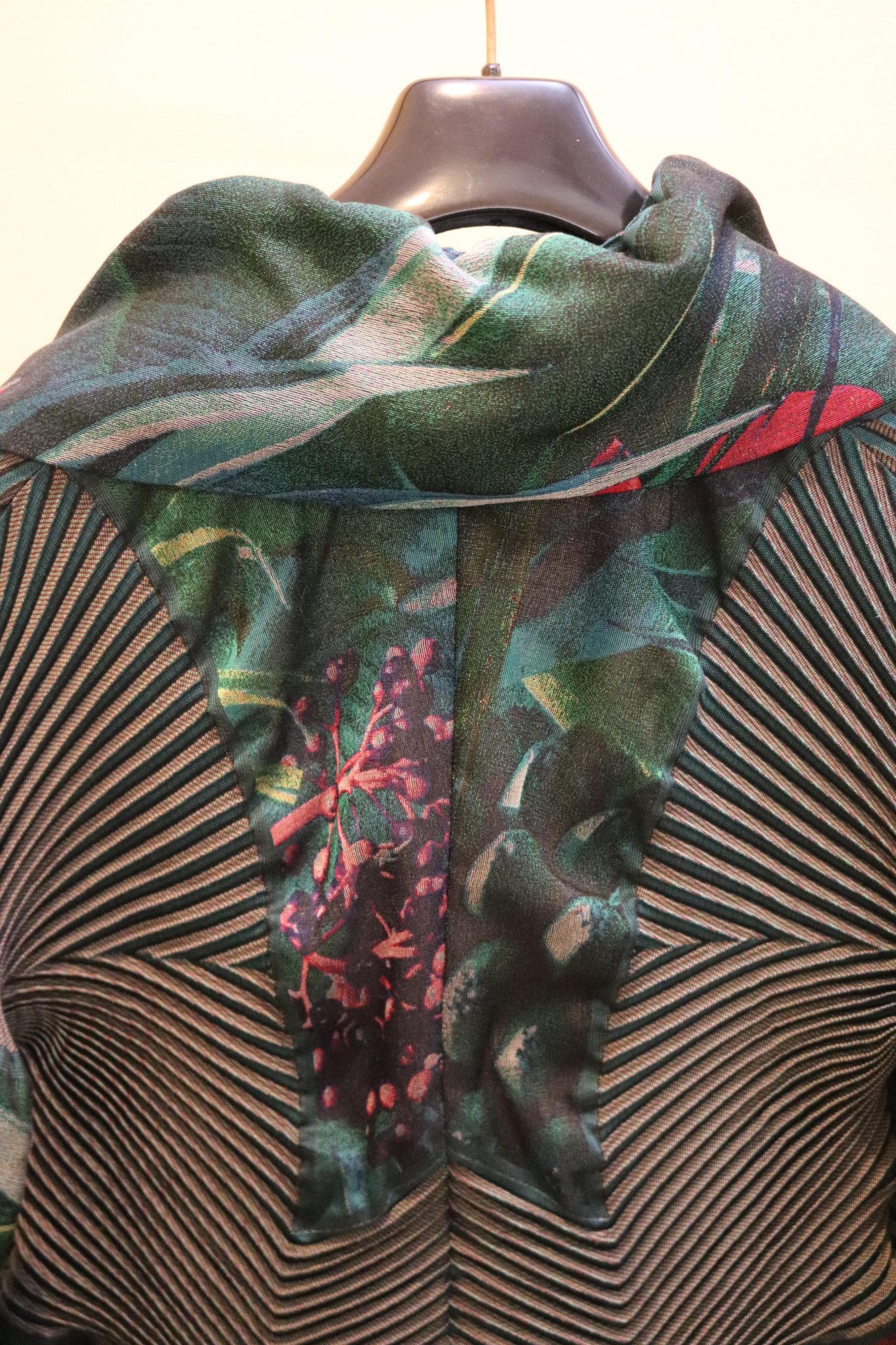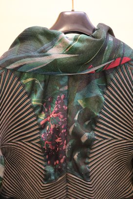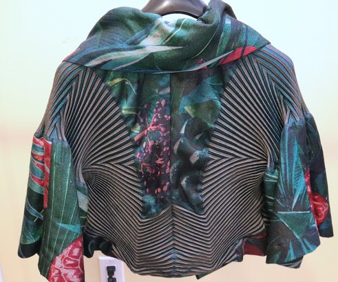 Chic Issey Miyake Vintage 3/4 sleeve pleated/stretch sleeves / jacket with green floral print & oversize collar Size 2 made in Japan. Size 2 is small.