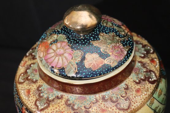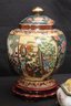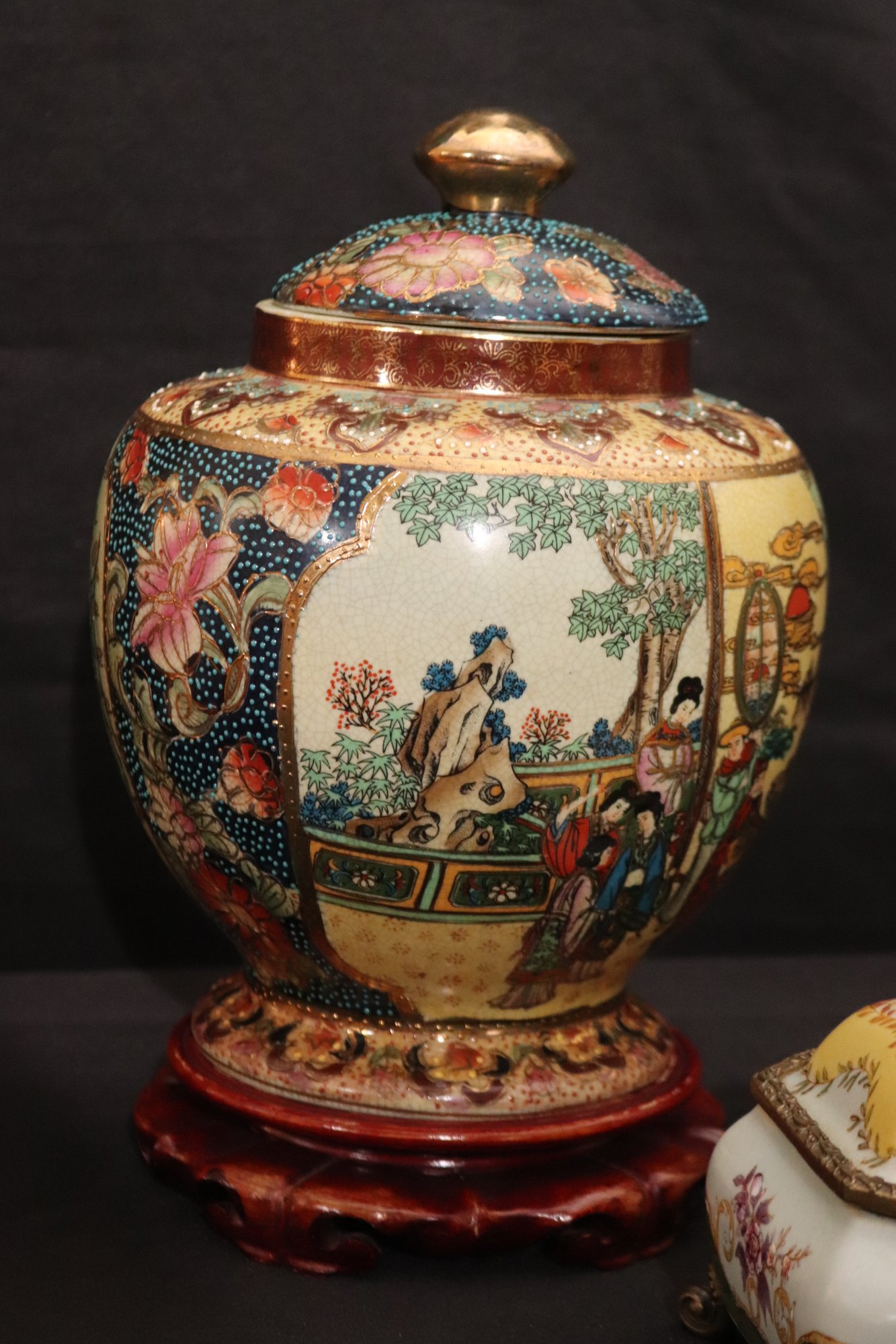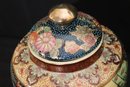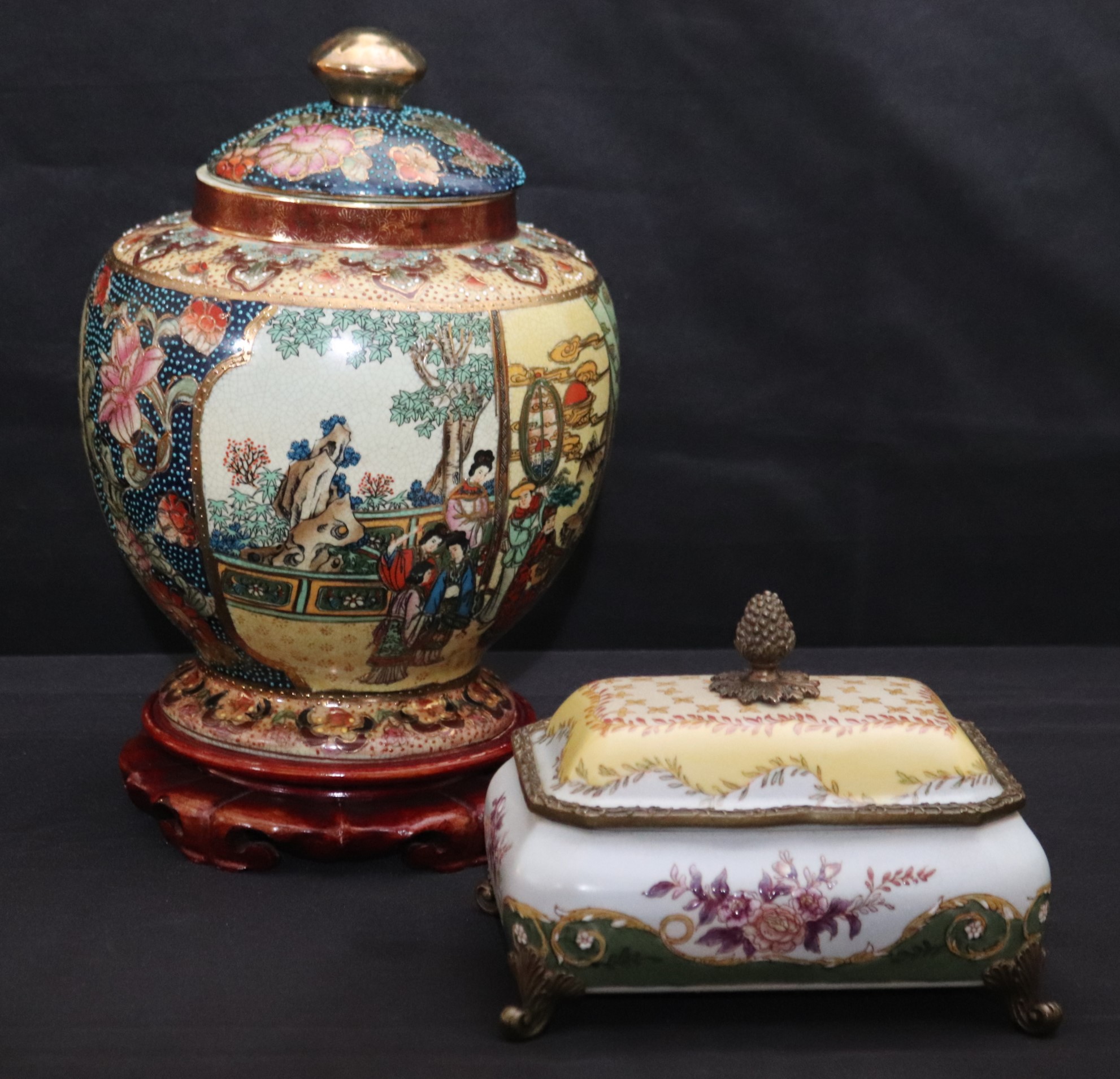 Chinese hand painted Satsuma crackle finished ginger jar with lid and stand measures approximately 8” w x 12” tall. Includes a trinket box with brass accents and acorn finial that measures approximately 7” w x 5” d x 5” tall.