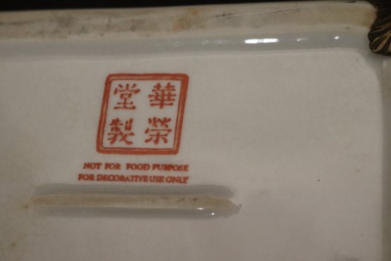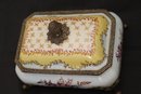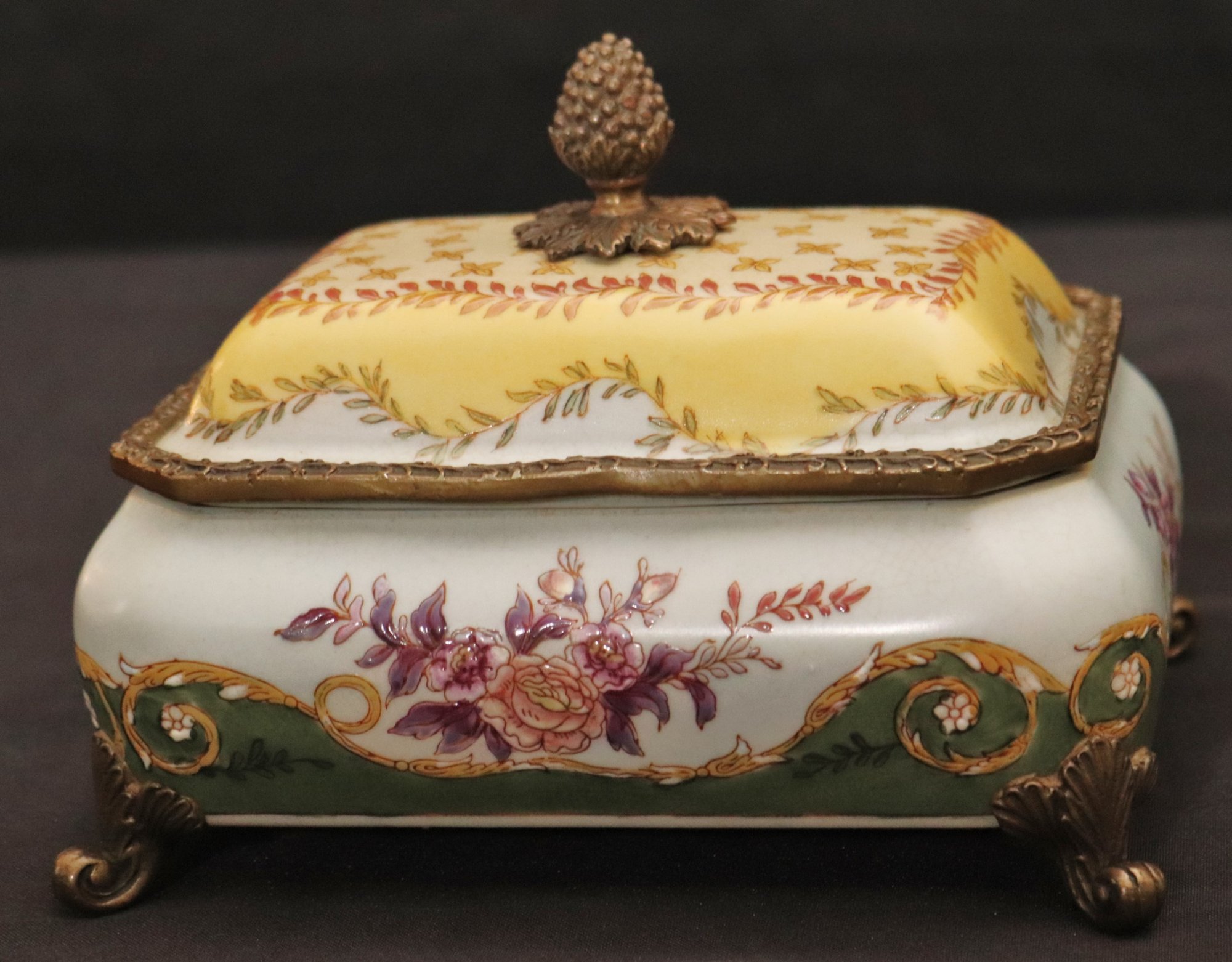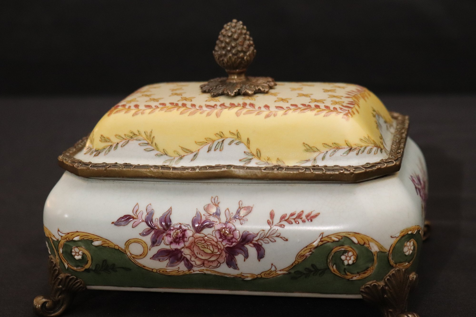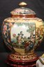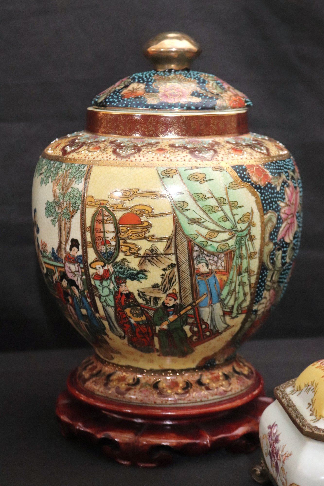 Chinese hand painted Satsuma crackle finished ginger jar with lid and stand measures approximately 8” w x 12” tall. Includes a trinket box with brass accents and acorn finial that measures approximately 7” w x 5” d x 5” tall.