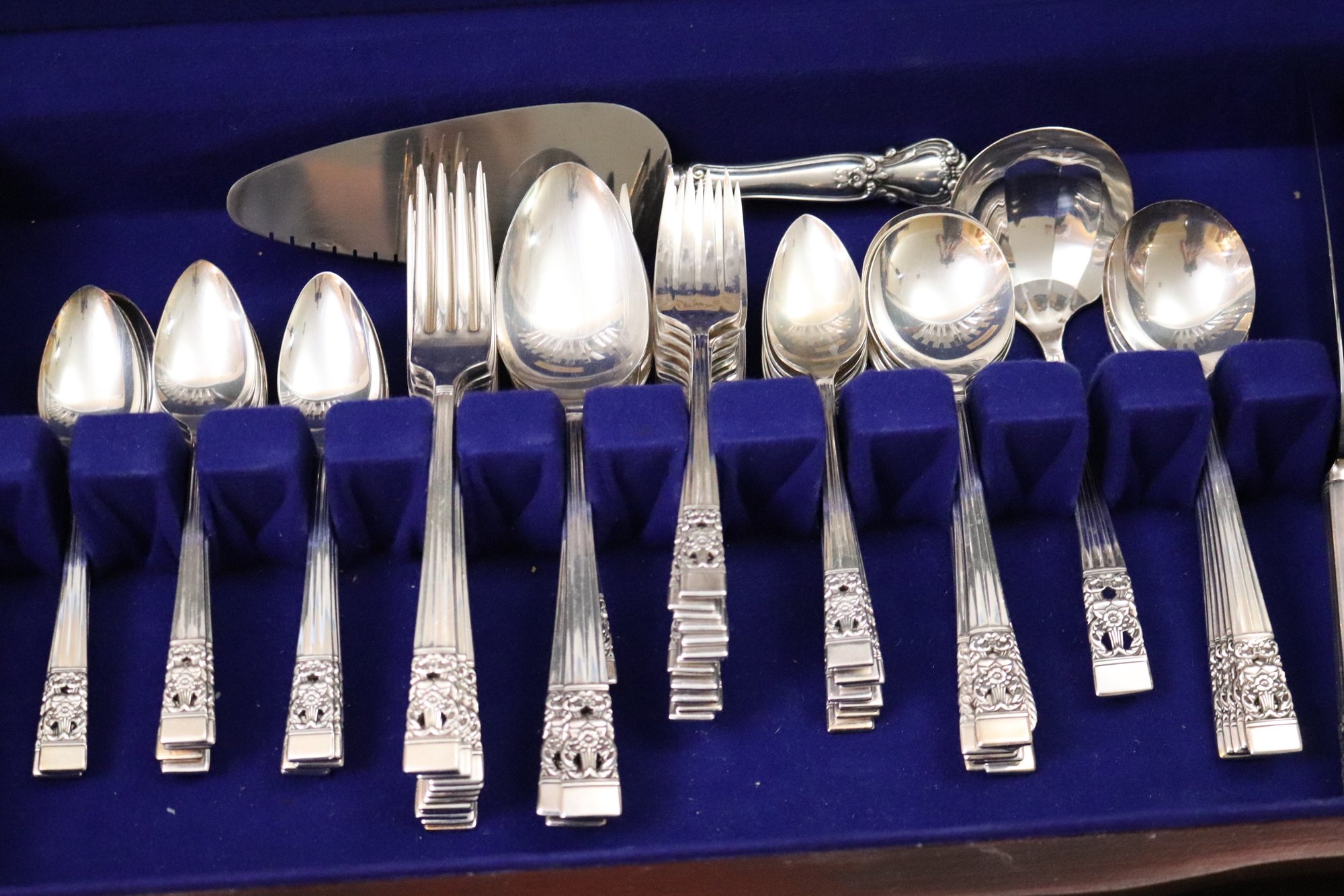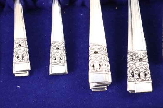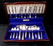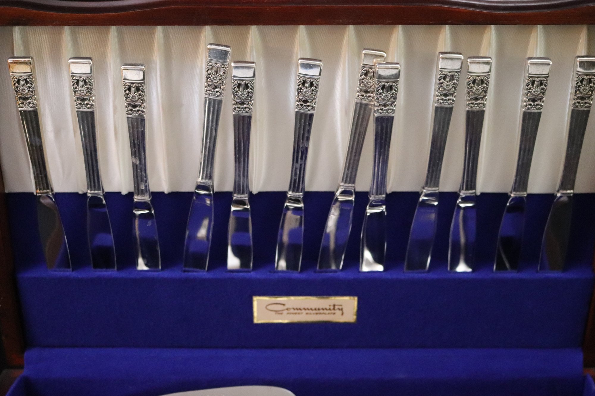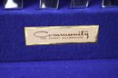 Community Silverplate service for 12 in original box The set contains 12 knives, dinner forks, 12 salads, 12 soups, 24 teaspoons, ladle, 2 pie servers, 2 serving spoons and 1 serving fork.