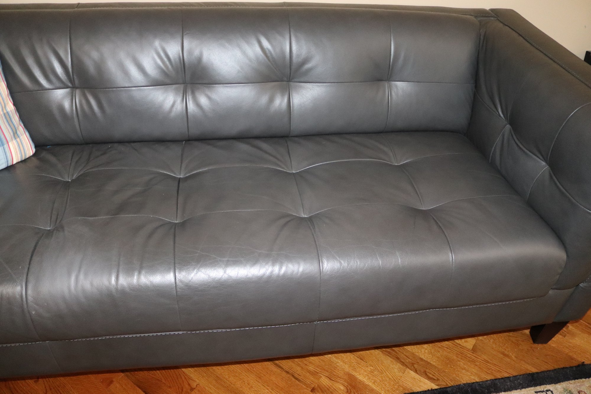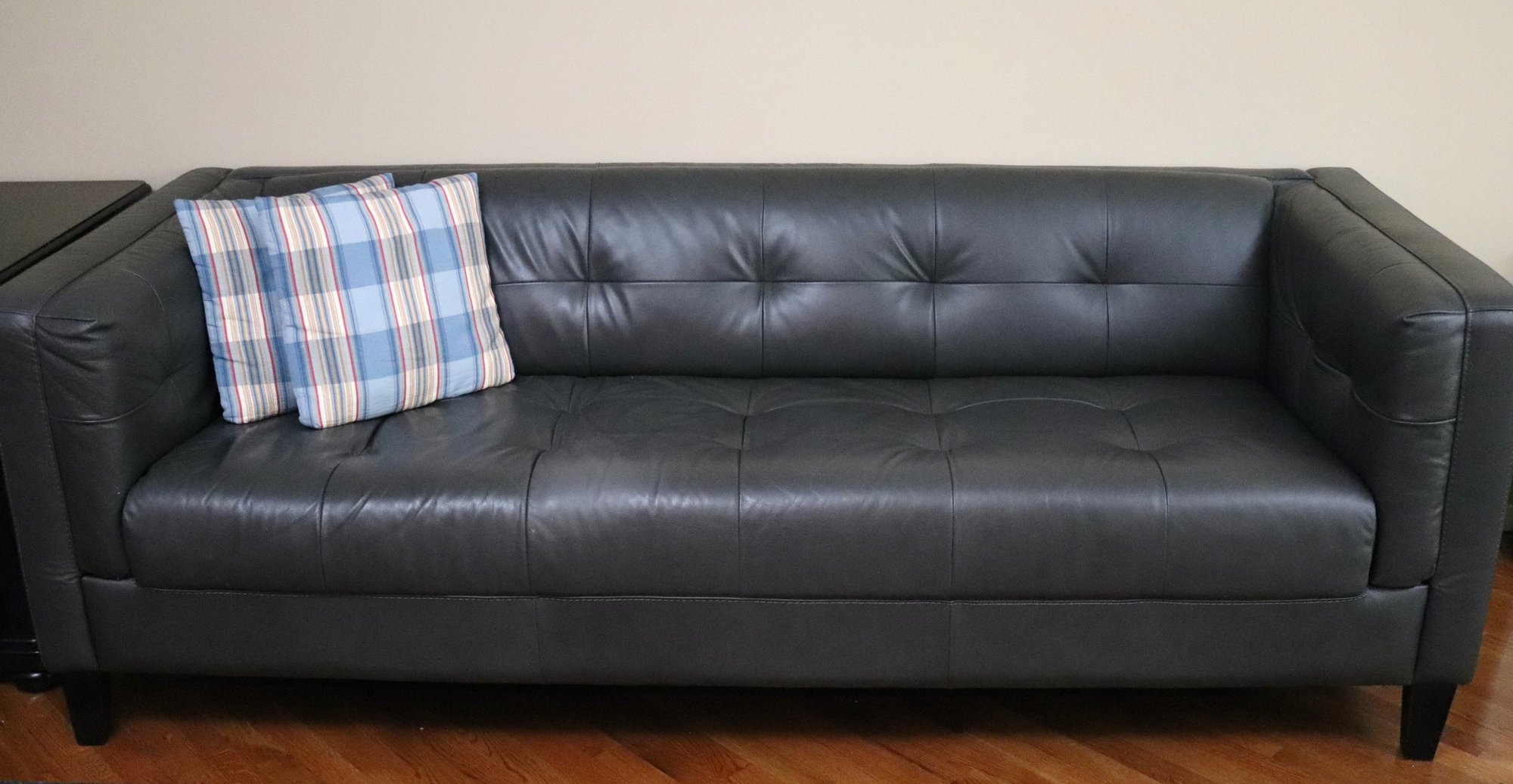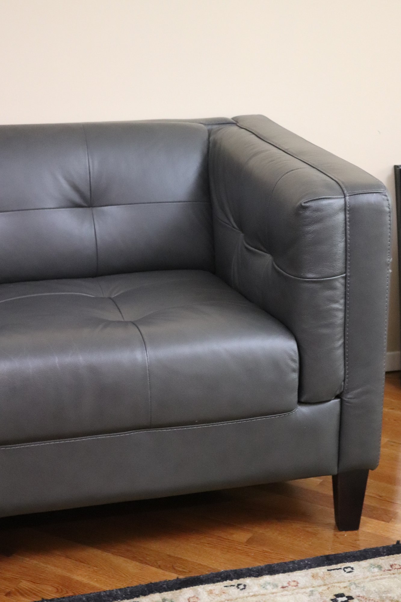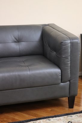 Contemporary dark grey leather-look tufted style sofa. This faux leather sofa looks and feels like the real thing. Add a touch of modern comfort to your home with a classic & clean style. measuring 84” L x 34” D x 30” T, seat height 19”, depth 22”
