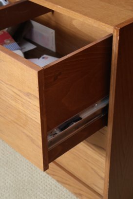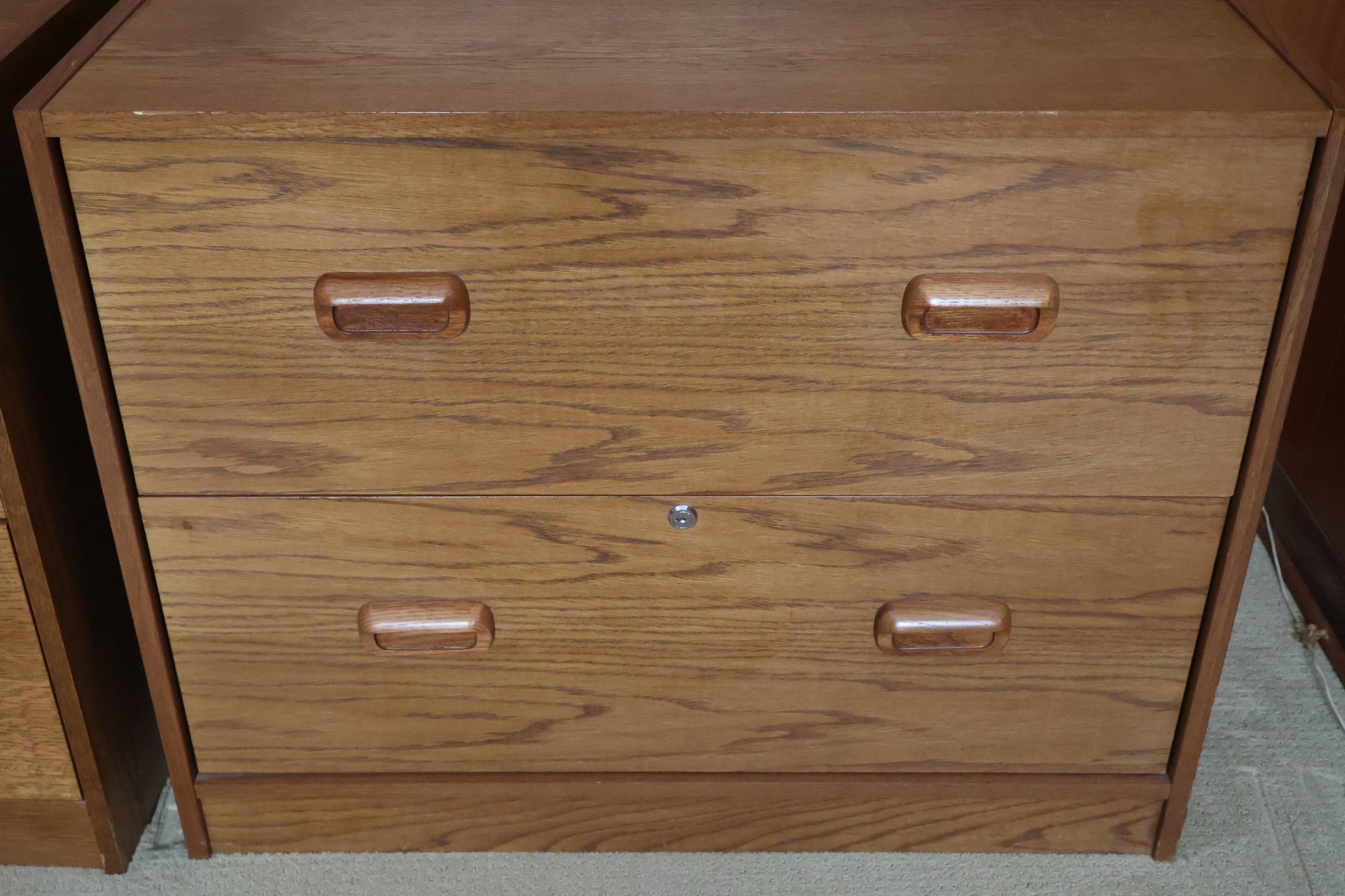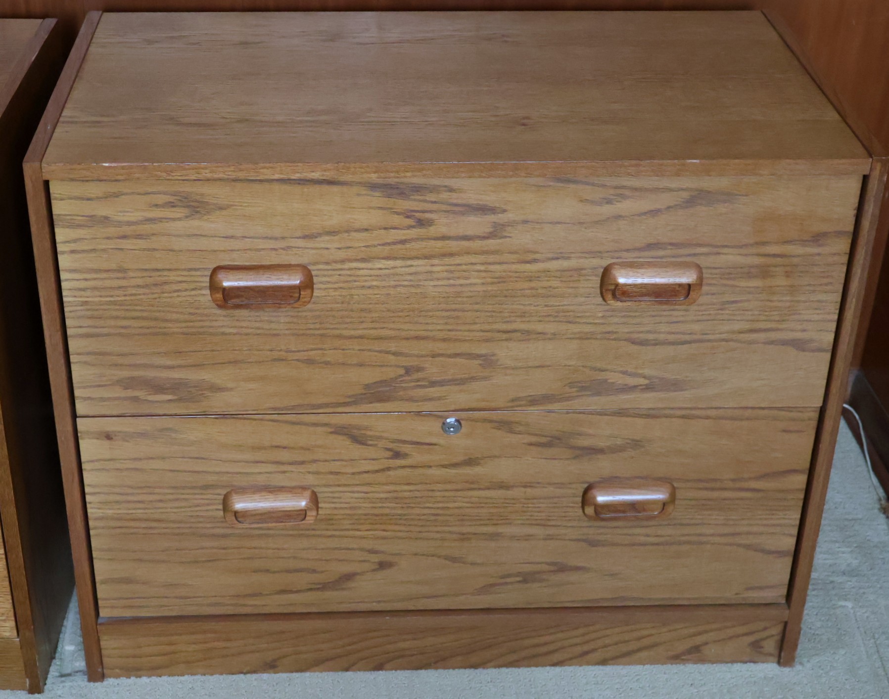 Contemporary oak 2 drawer file cabinet. Bottom drawer with lock 36” x 19” x 28”. This