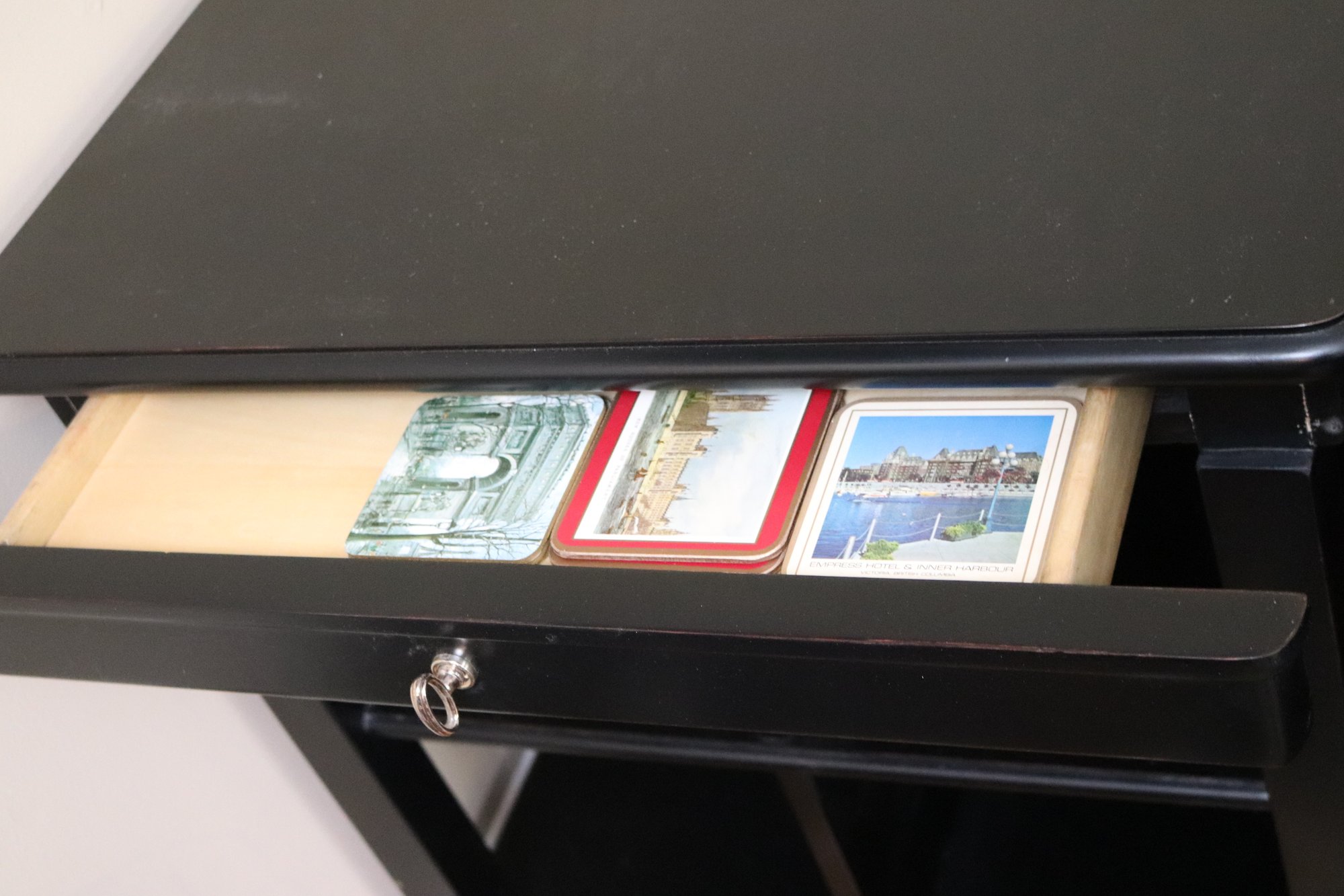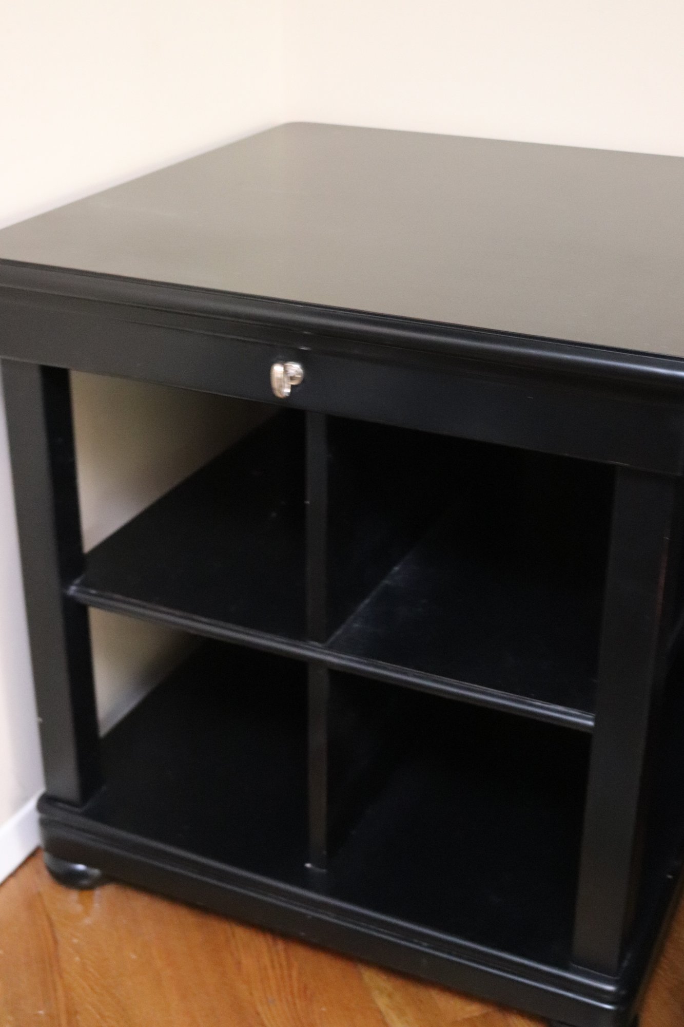 Contemporary side table with bookcase compartments & drawer. Measures 28” Sq. x 28.5” T