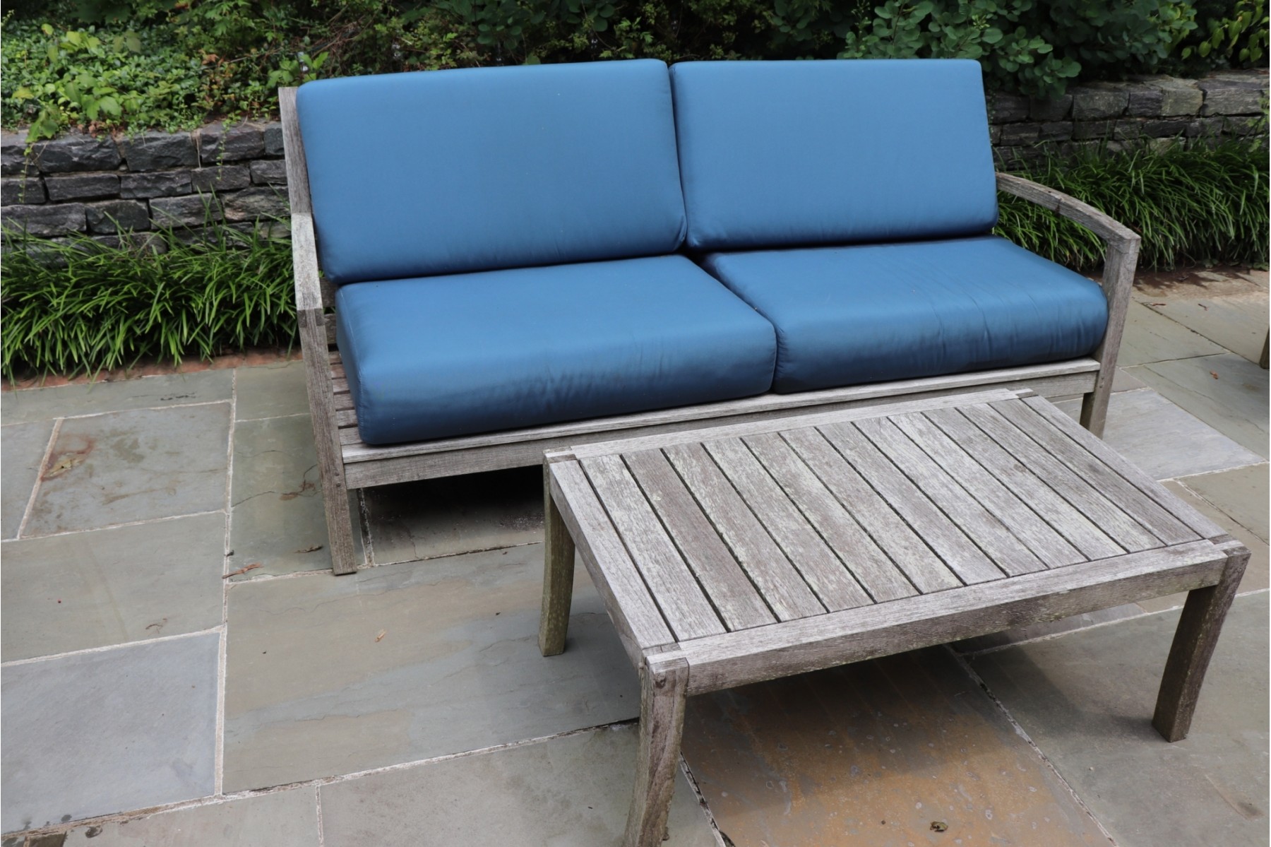 Crate & Barrel Outdoor Teak Sofa Is Approximately 76” W X 30” D X 34” Tall. Includes Table Measures 40” W X 25” D X 16.5” Tall. Shows Some Age And Weathering, Needs Power Washing And Stain/Paint To Freshen Up.