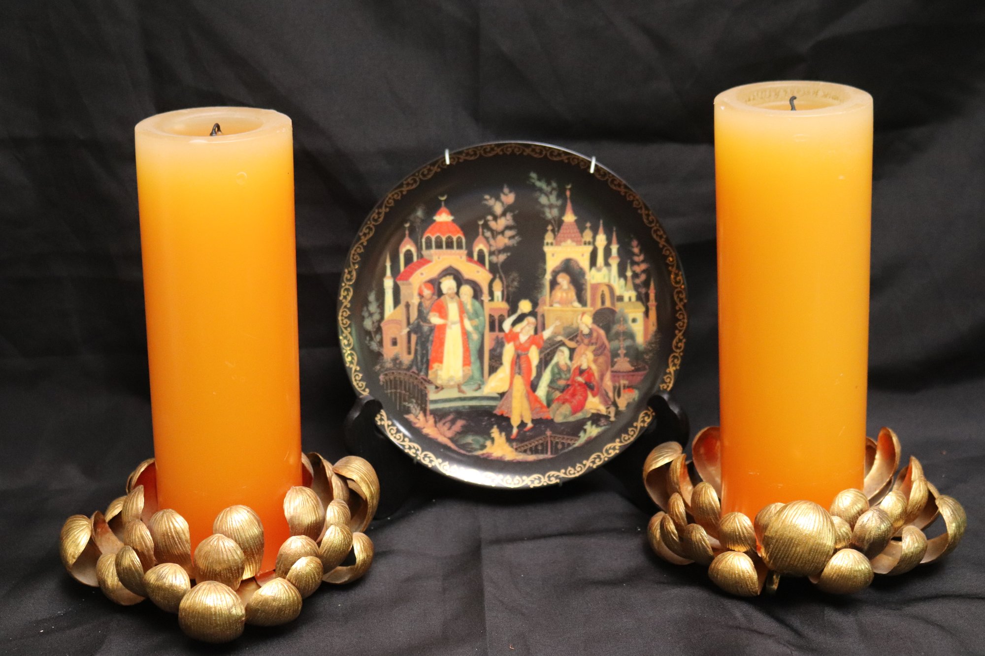 Plate is 8” diameter including decorative candle holders and candles as pictured 7”