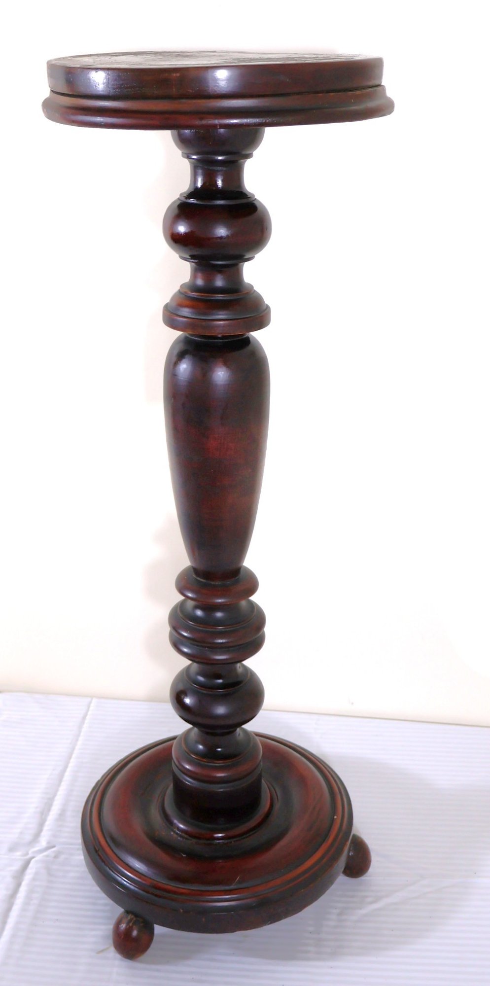 Early 20th Century turned wood Mahogany pedestal or plant stand with ball feet. Condition