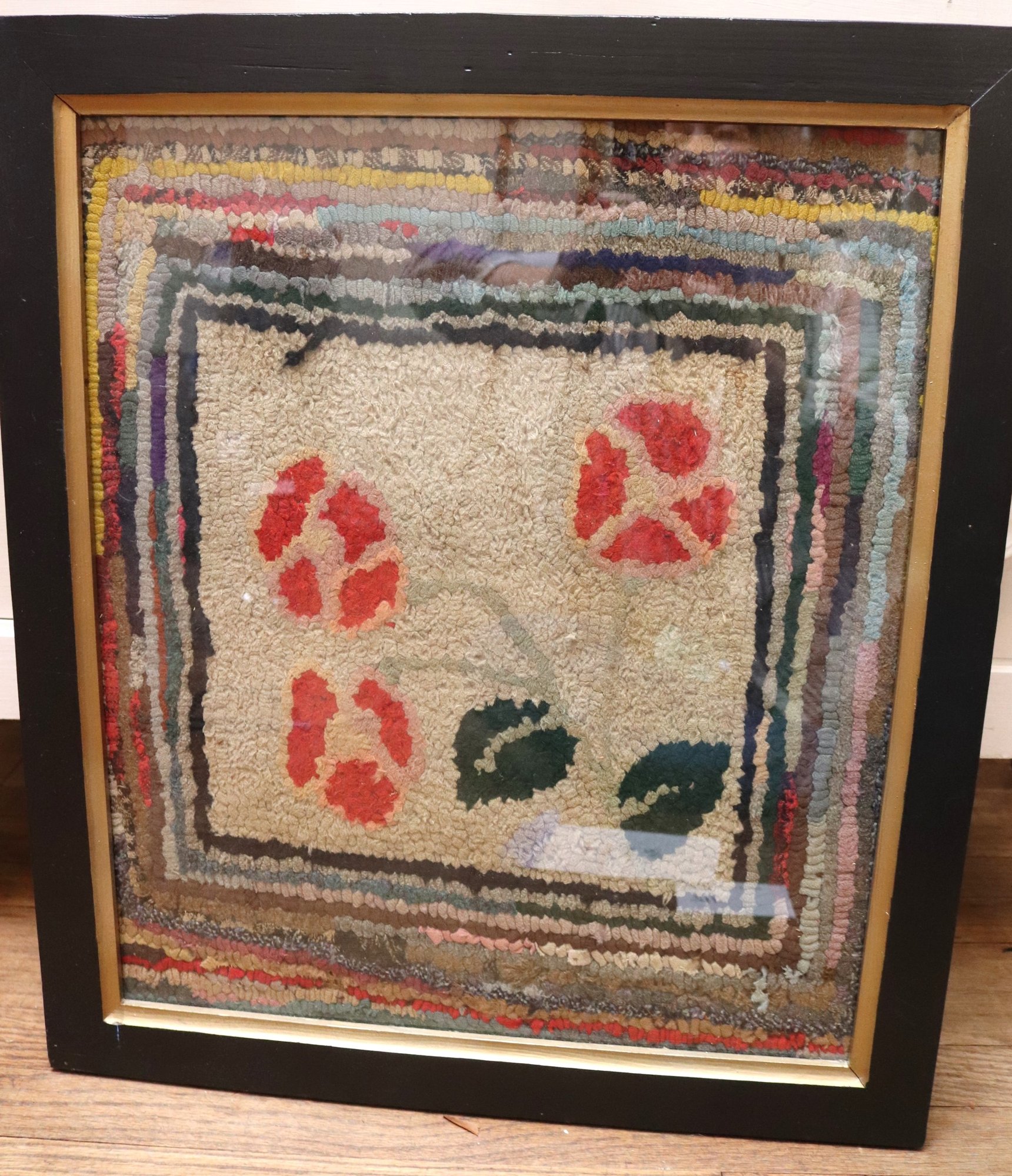 Early American hooked Rug, measures approximately 22” w x 25” tall in the frame.