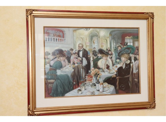 Elegant Print Of A Turn Of The Century Restaurant With Sophisticated Ladies In A Beautiful Matted Linen Frame Measures Approximately 33” W X 25” Tall.