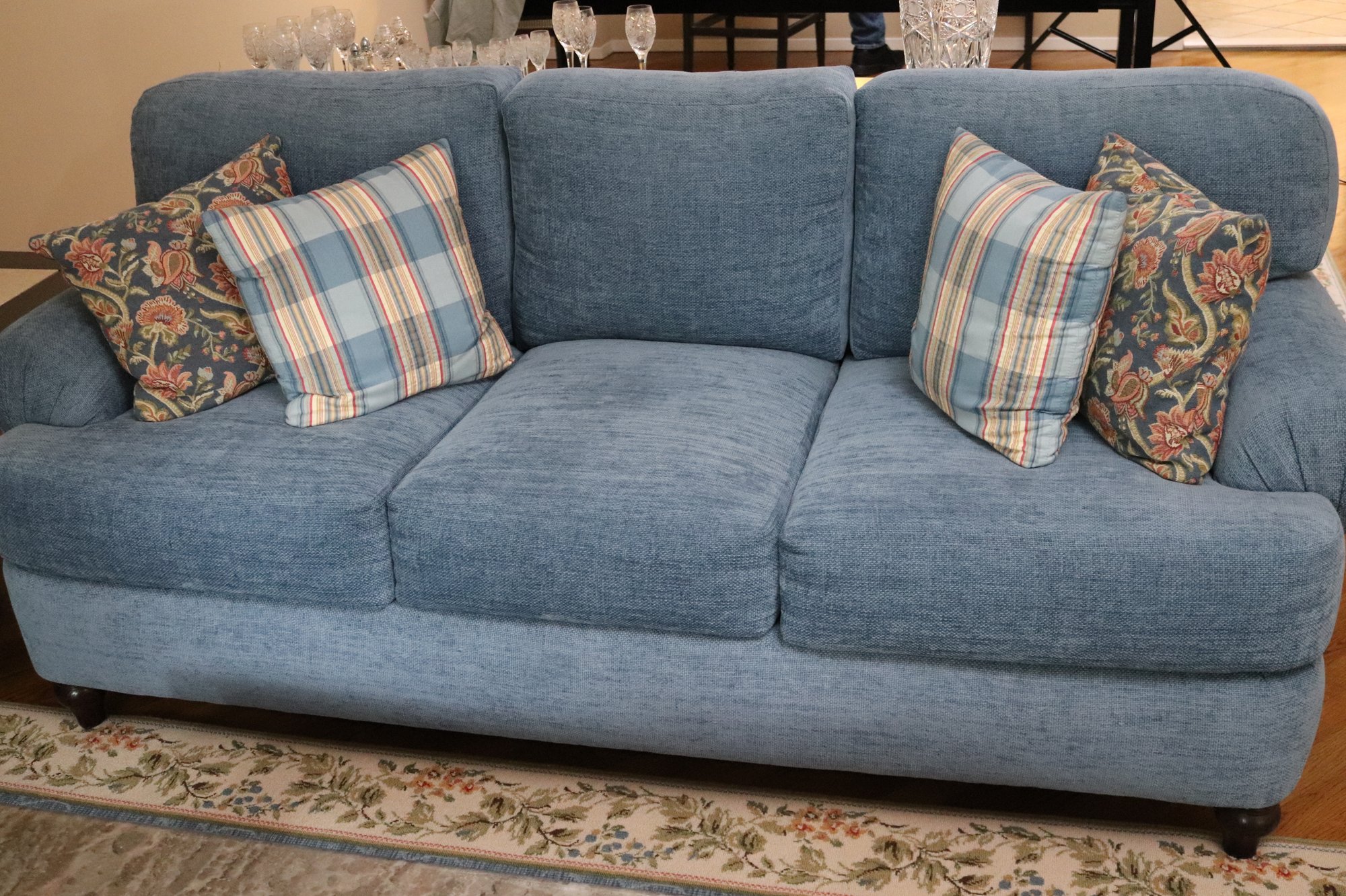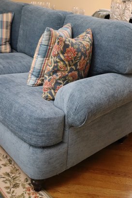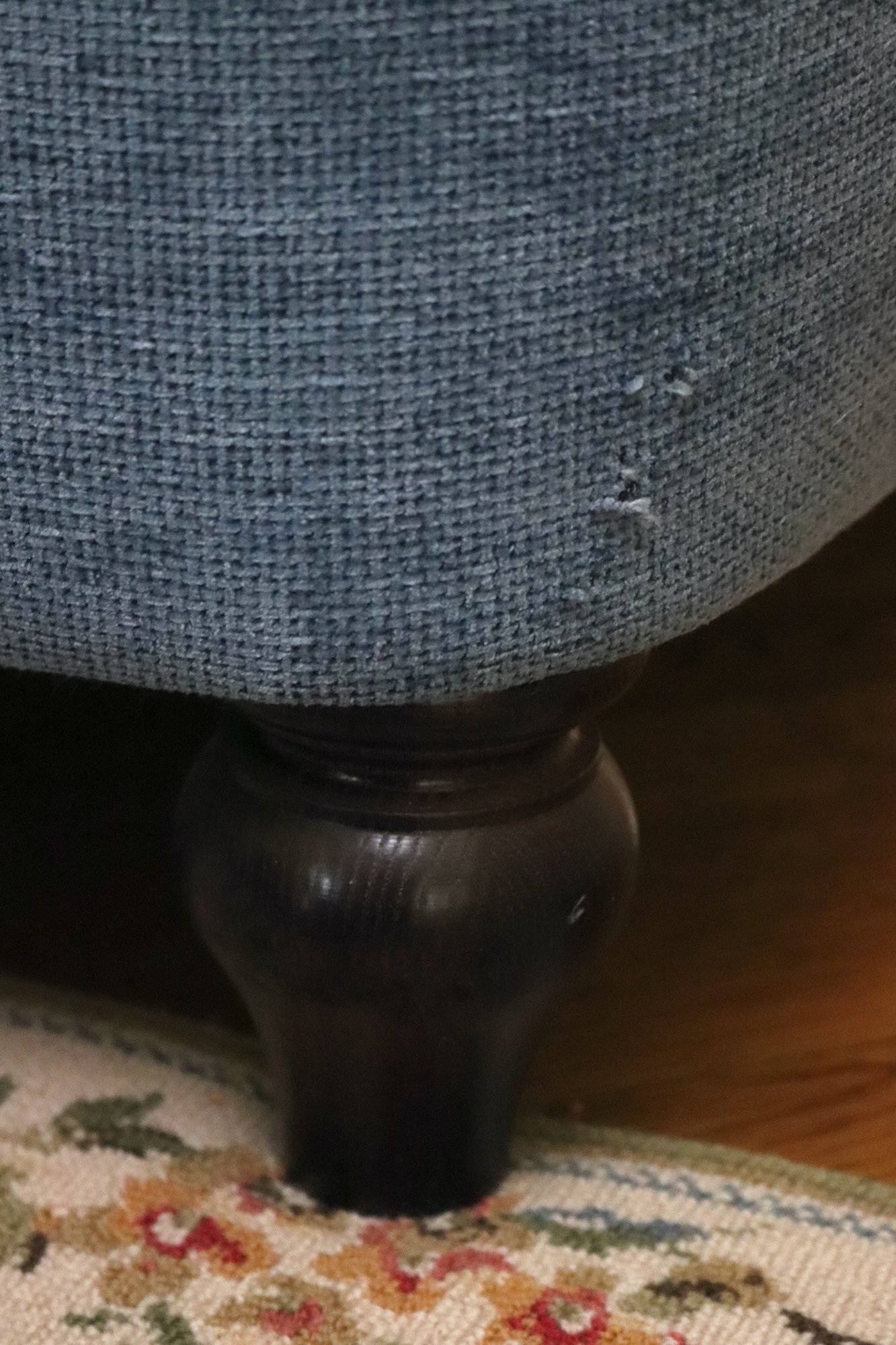 This English style roll arm loveseat in textured blue velvet fabric & wooden feet is an