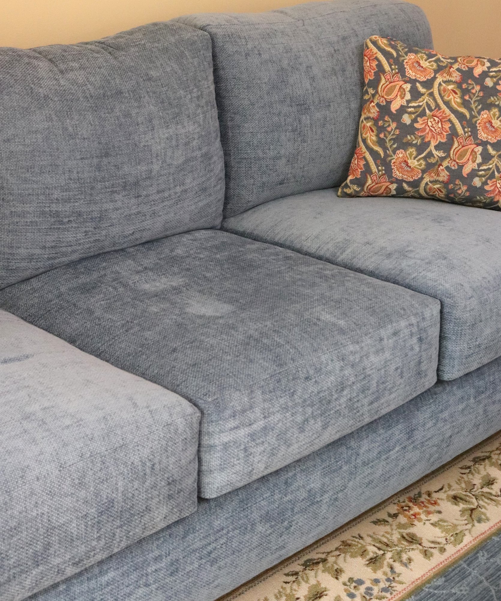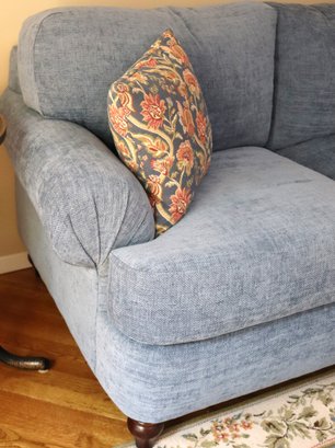 well made, English style roll arm sofa in textured blue velvet fabric with wooden feet in
