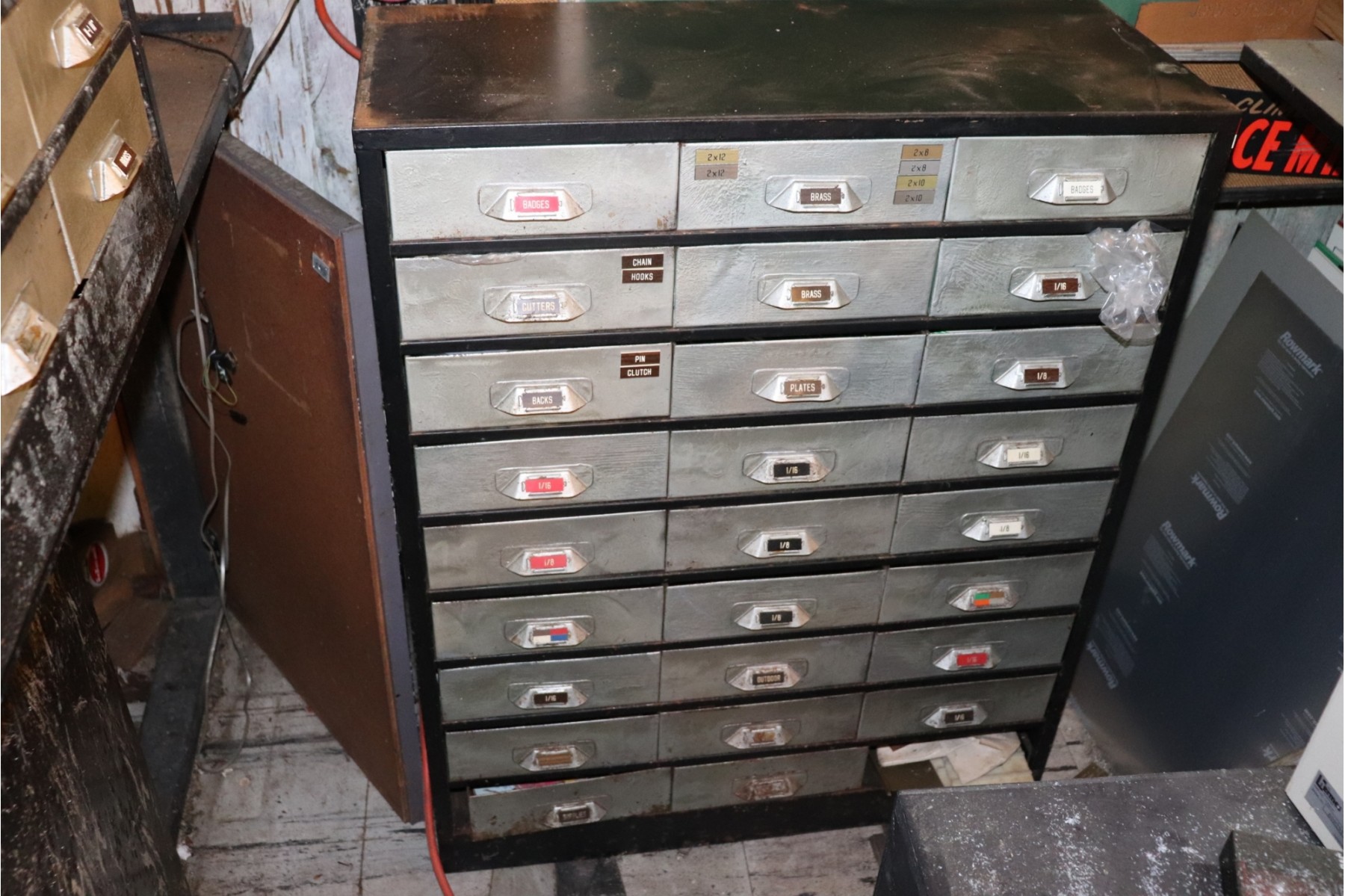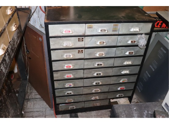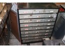 Engravers Cabinet with Drawers Filled With Assorted Items, Name Plates, Badges, Missing One Draw on Bottom, Measures Approximately 29" W x 12" D x 36" Tall