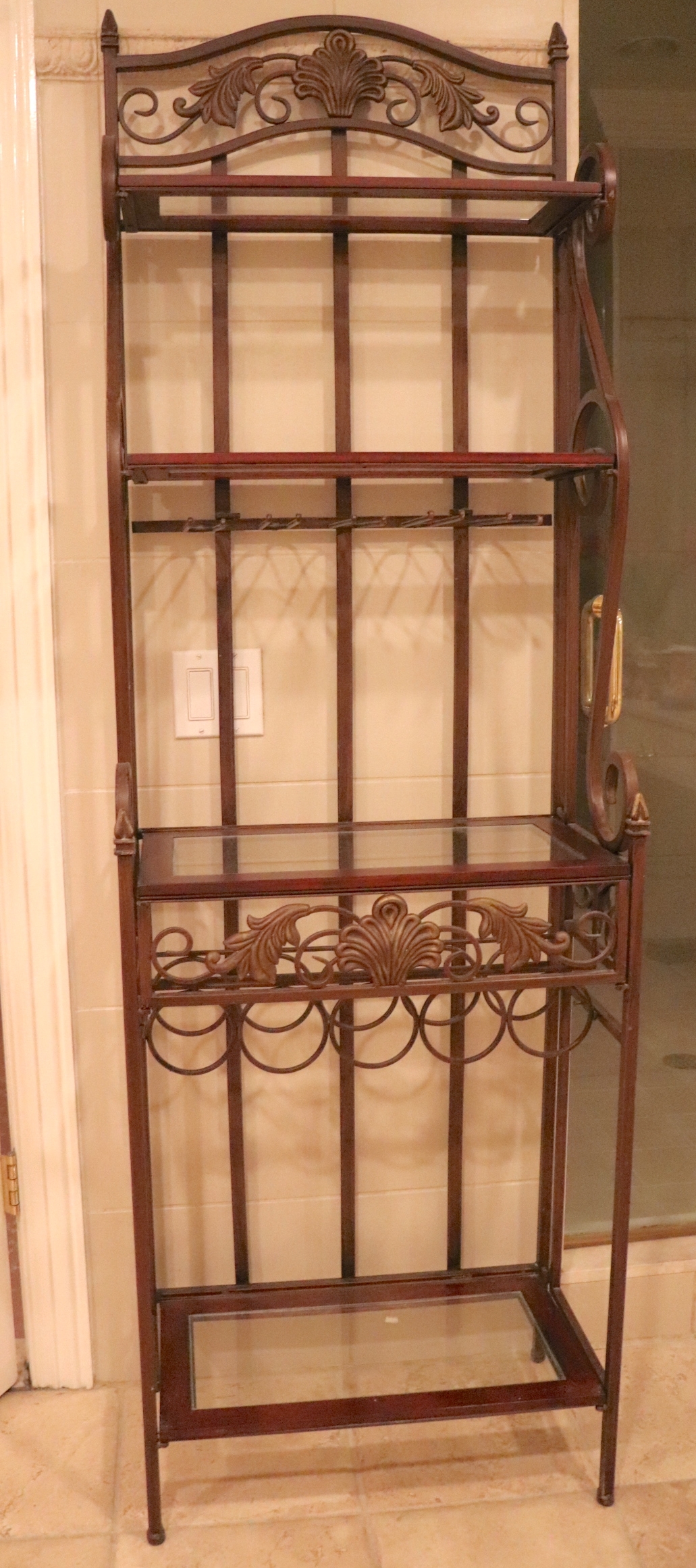 Petite Metal with Wood & Glass Shelf Bar Rack. Has built in wine bottle rack and stemmed glassware rack. In very good used condition with minor wear as shown. Approximate Measurements: 23”W x 13”D x 73”H