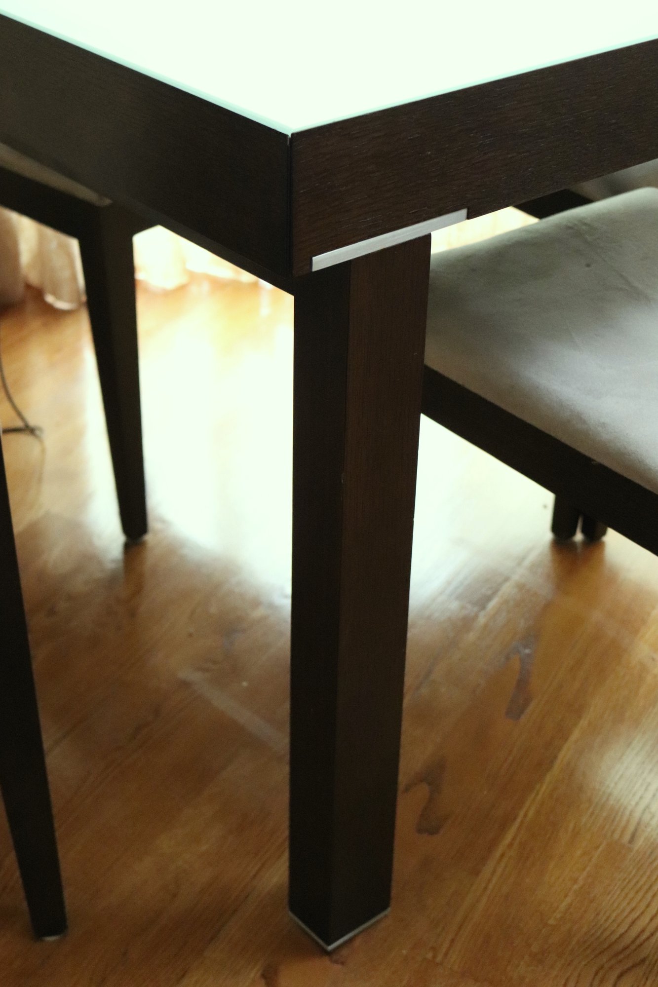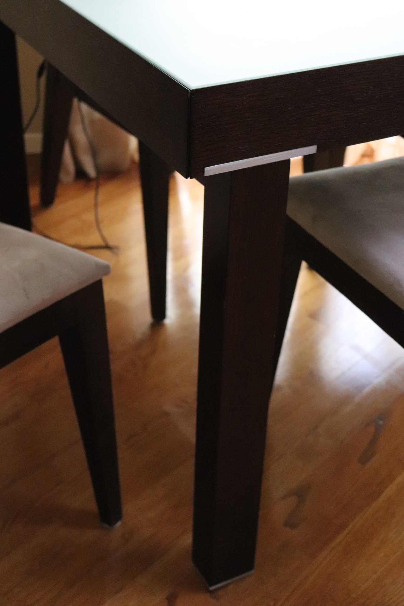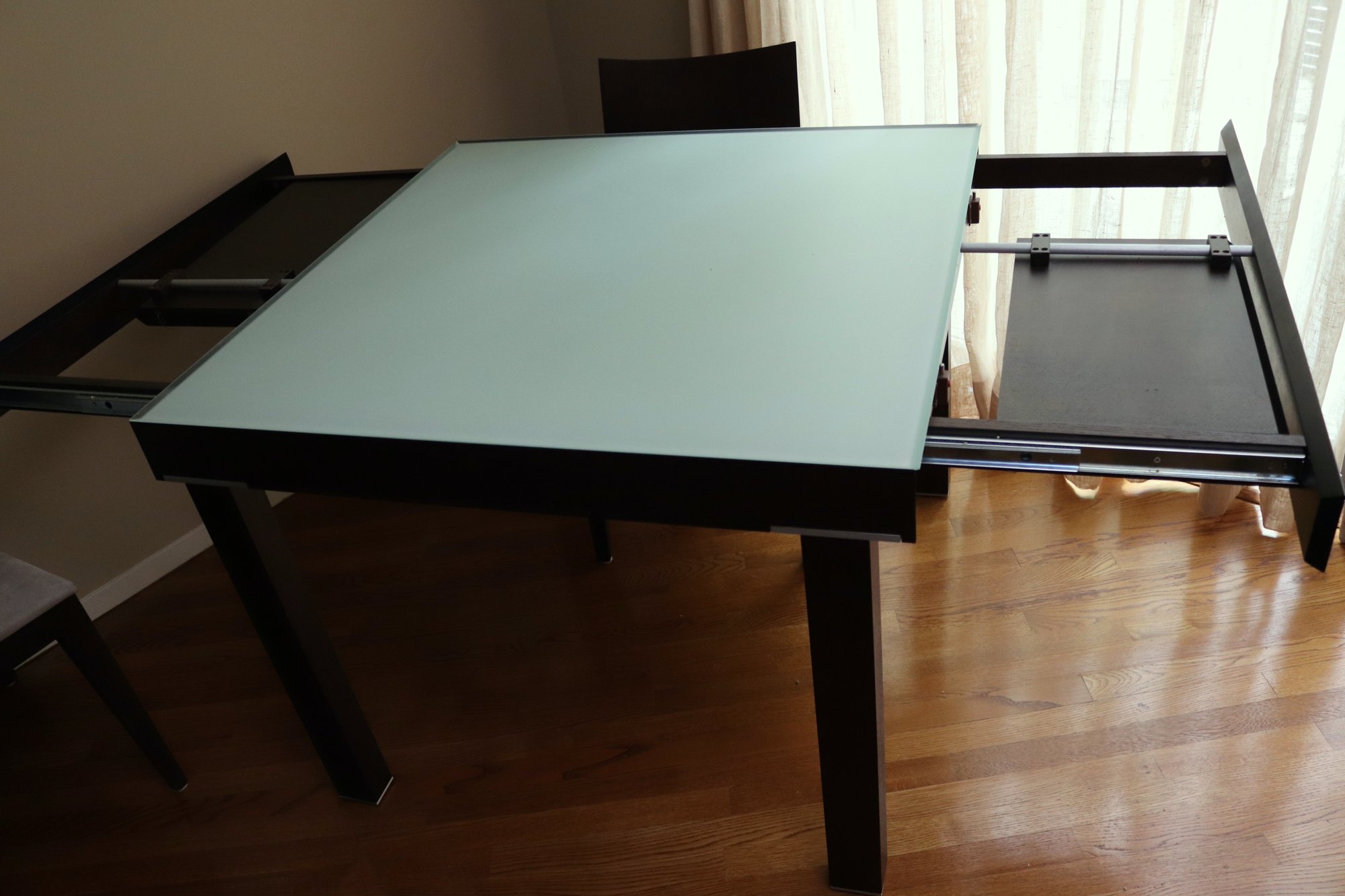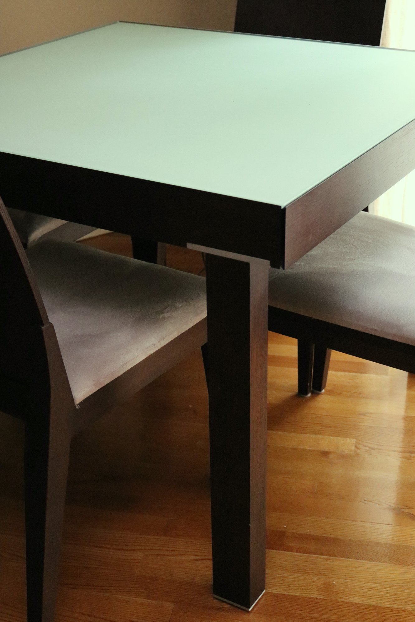 Expansion table in dark wood with frosted green glass top, chunky legs and 4 chairs. This is a very handsome set for a small area or nook in your home. The table expands, and has a nice, frosted glass center. Chair seats have some staining, please see photos. 39” Sq. x 30” T, expands to 64”.. Each leaf is 12” W. Chairs are 18” x 19” 33”. Seat height 18”, depth 17.5”