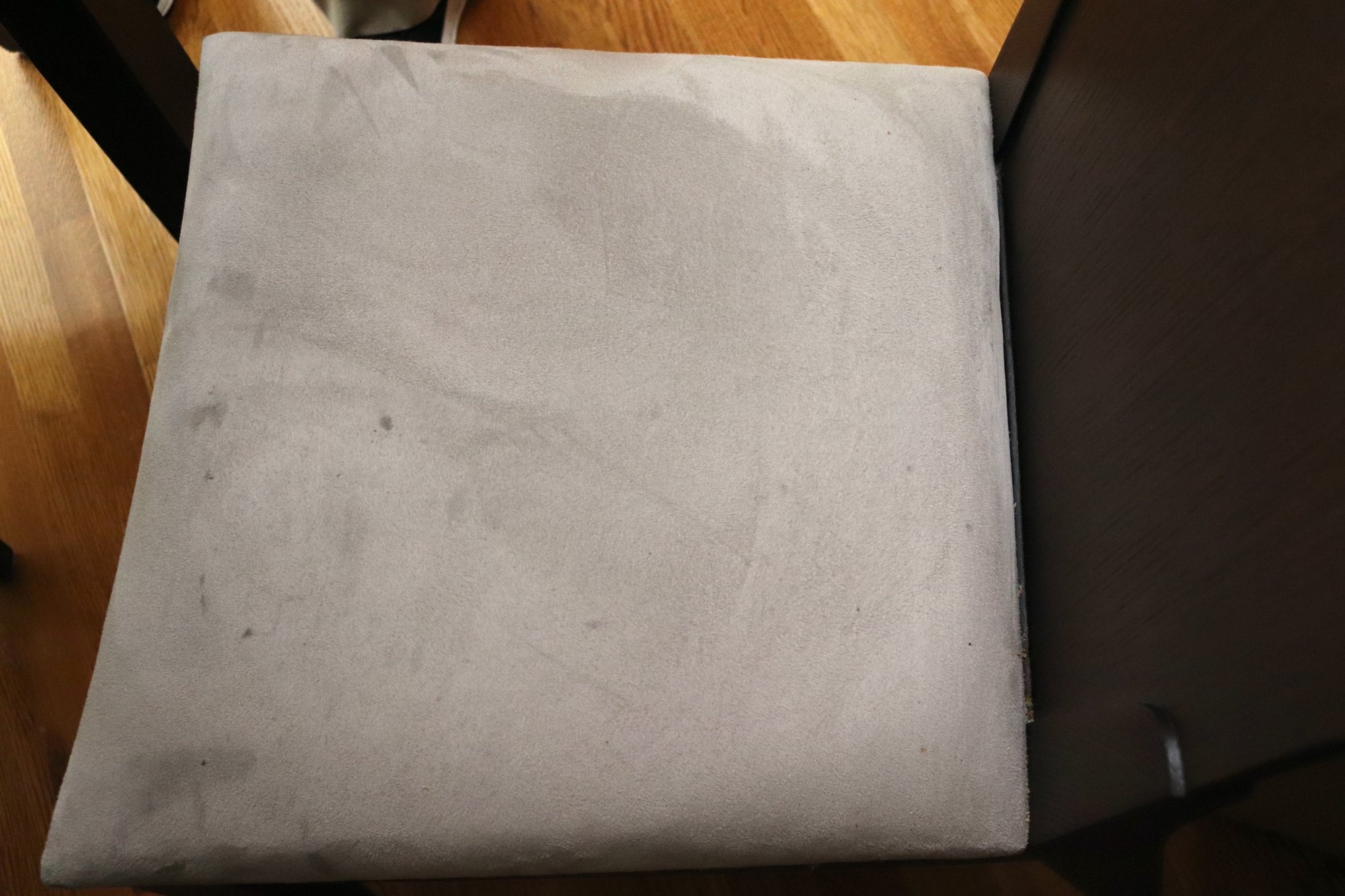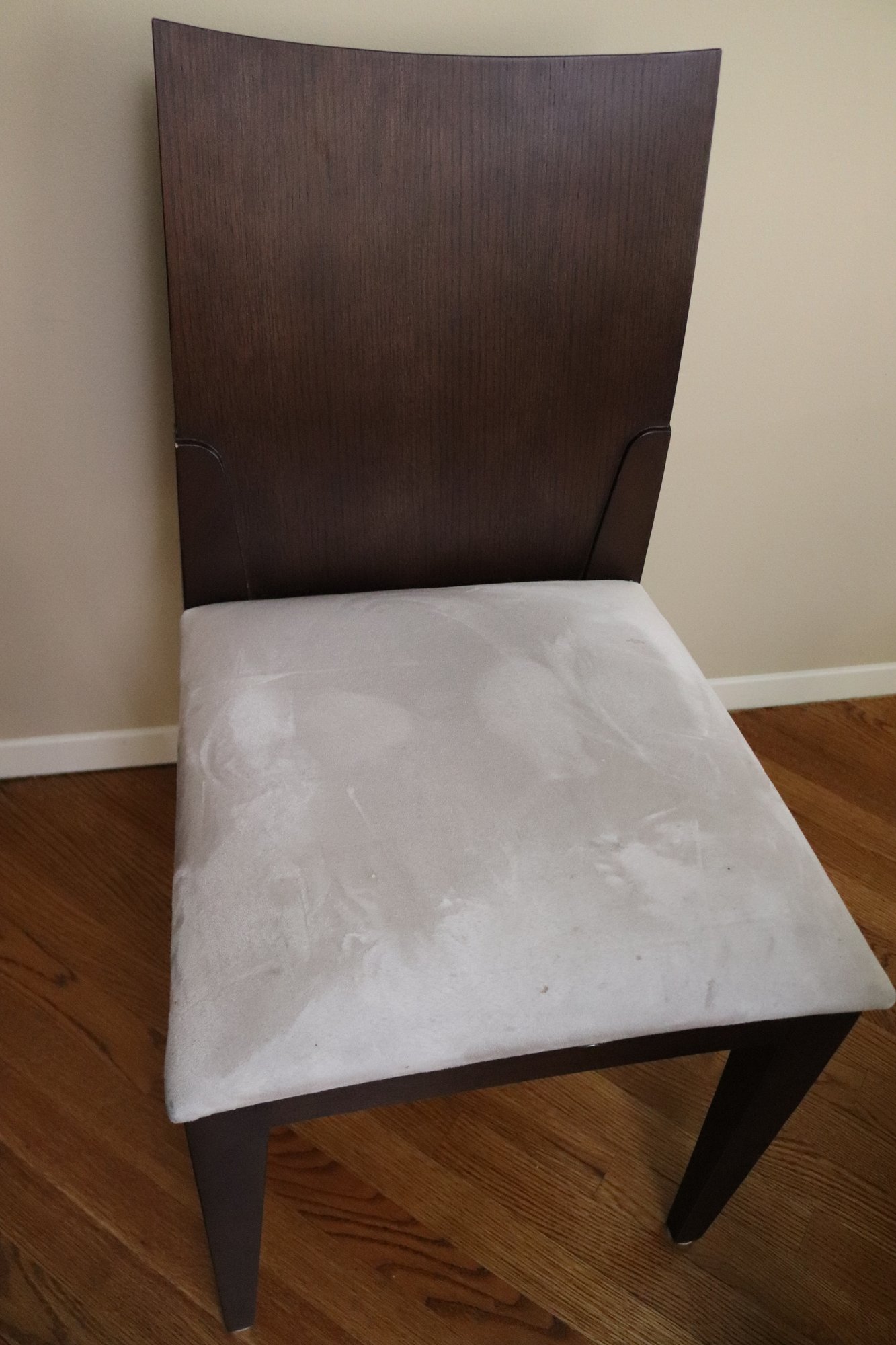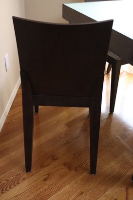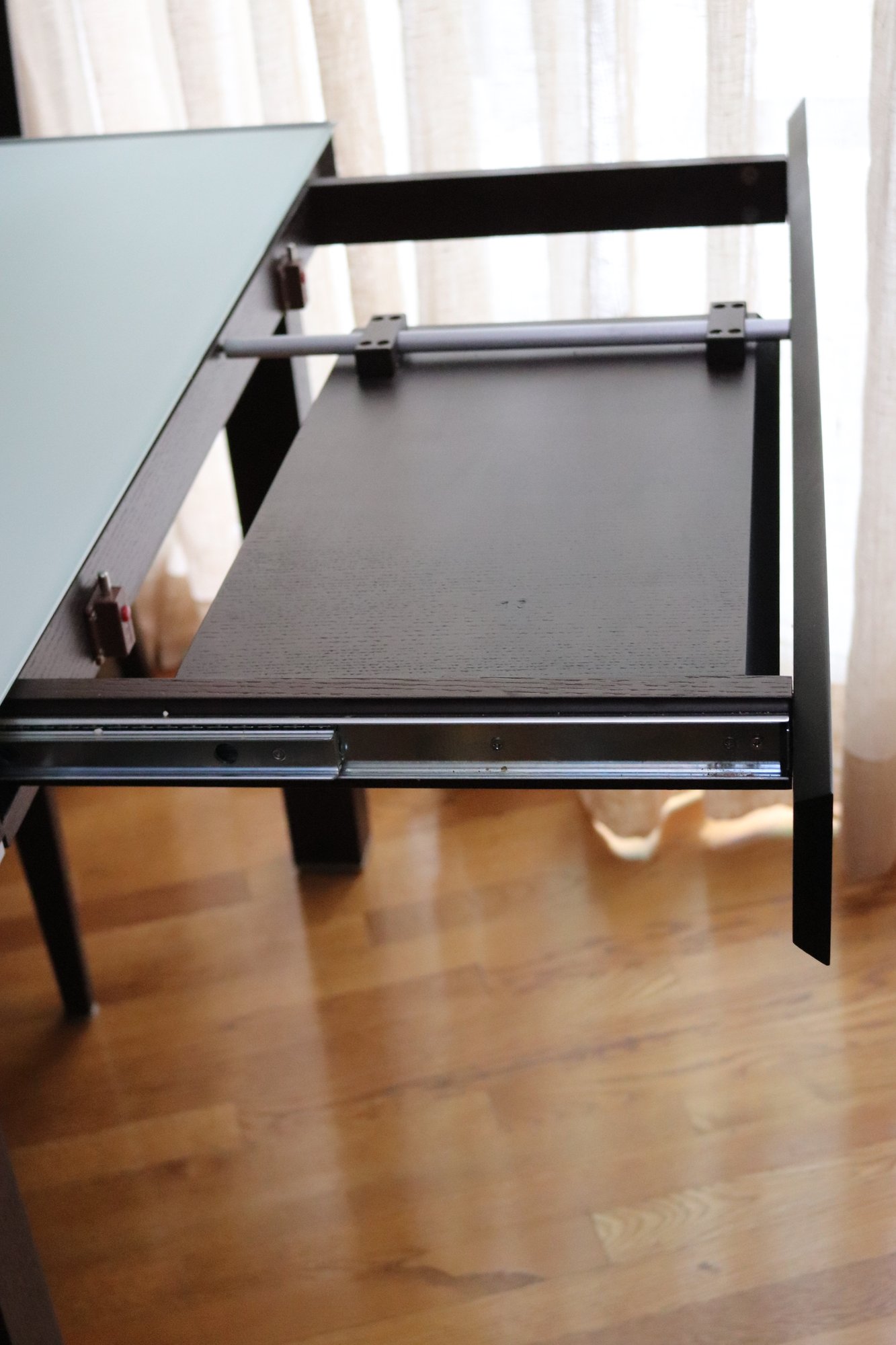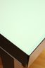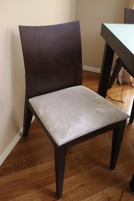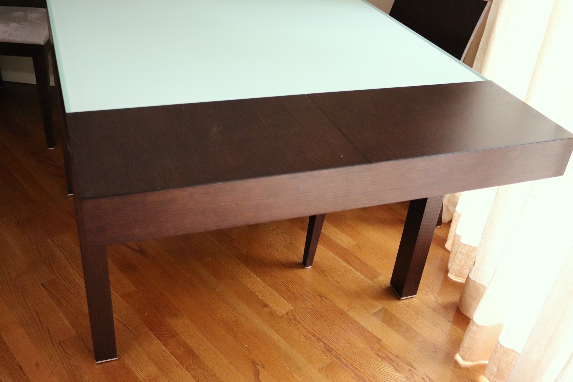 Expansion table in dark wood with frosted green glass top, chunky legs and 4 chairs. This is a very handsome set for a small area or nook in your home. The table expands, and has a nice, frosted glass center. Chair seats have some staining, please see photos. 39” Sq. x 30” T, expands to 64”.. Each leaf is 12” W. Chairs are 18” x 19” 33”. Seat height 18”, depth 17.5”