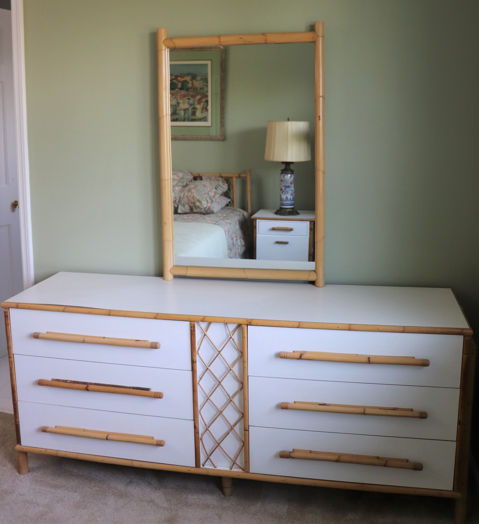 Formica & Bamboo dresser with 6 drawers that have bamboo handles & bamboo framed mirror. Slight raising of Formica on top left. Dresser measures 66” L x 19” D x 28.5” T. Mirror is 26” W x 40” T
