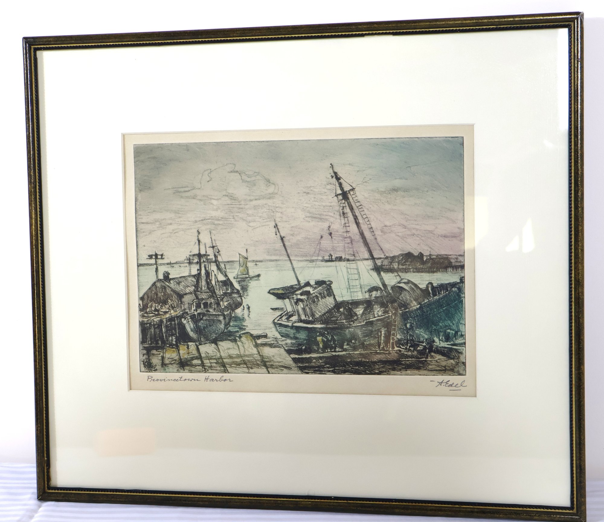 Framed engraving of Provincetown Harbor pencil signed by A. Edel. Art approx. 10” x 8”. Frame