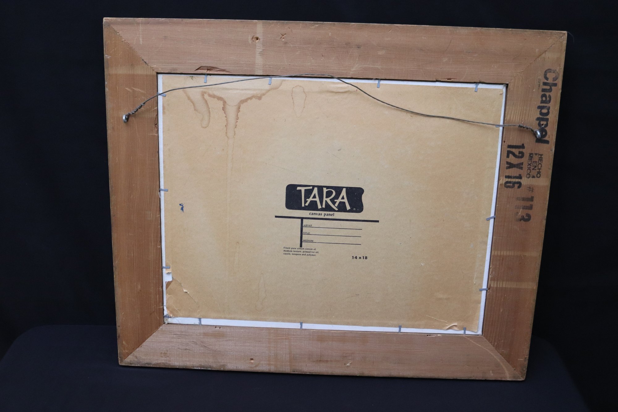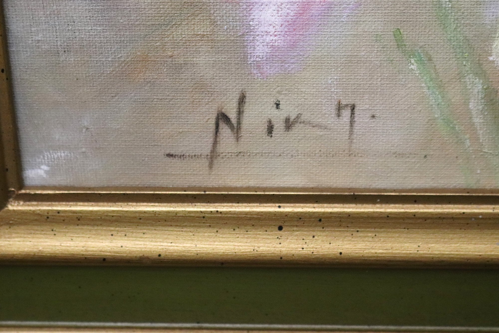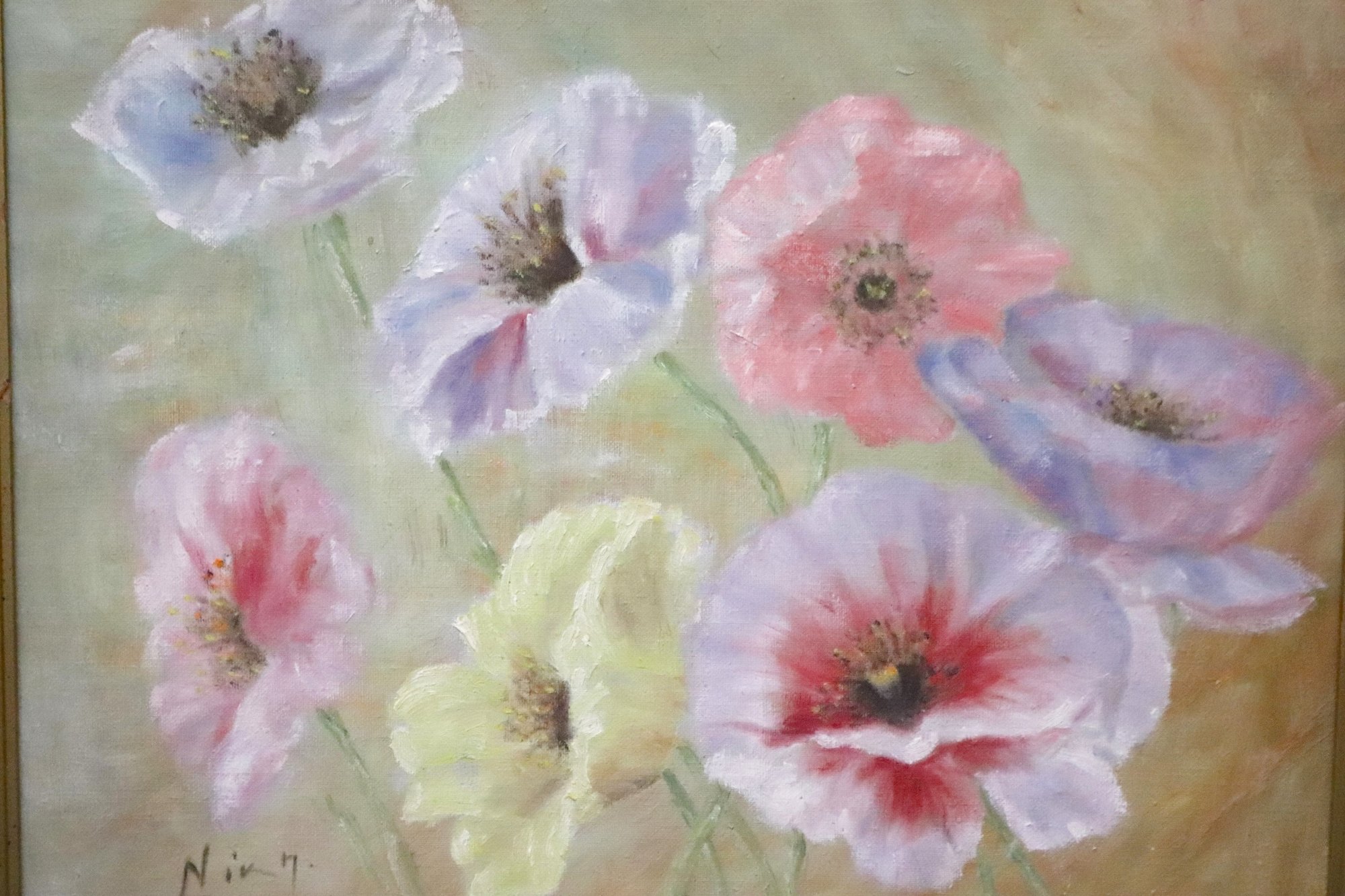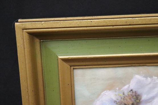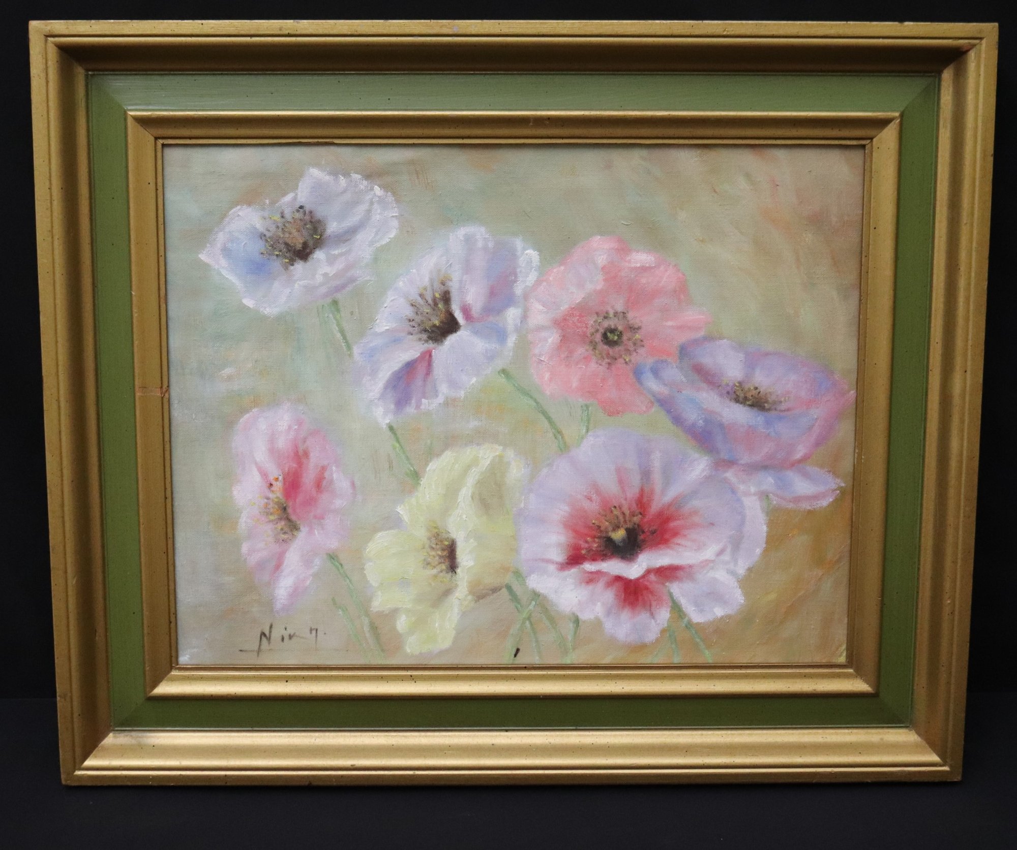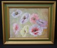 Framed floral painting on canvas panel signed by the artist. This piece measures