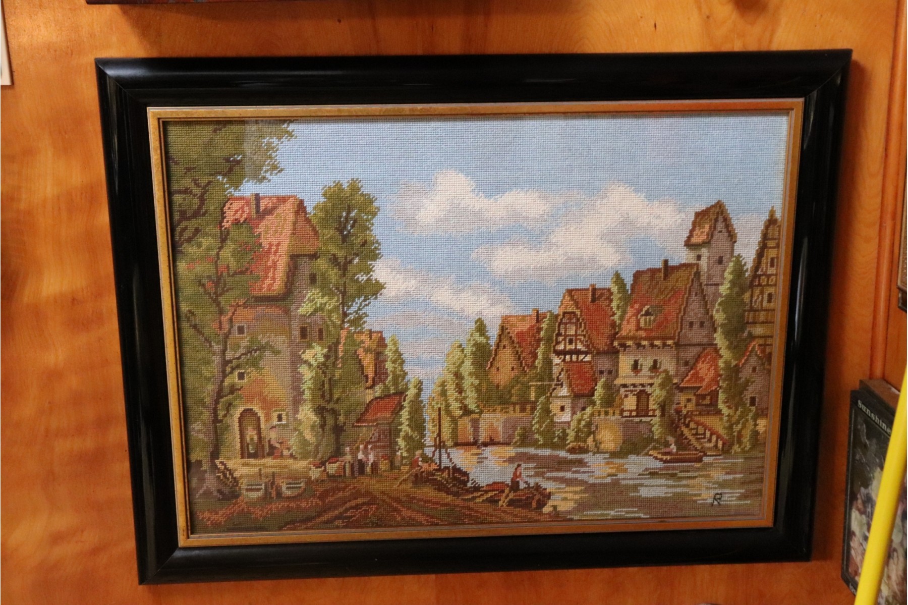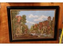 Framed Needlepoint Point Artwork Small Village Landscape Measures 32" W x 25" Tall