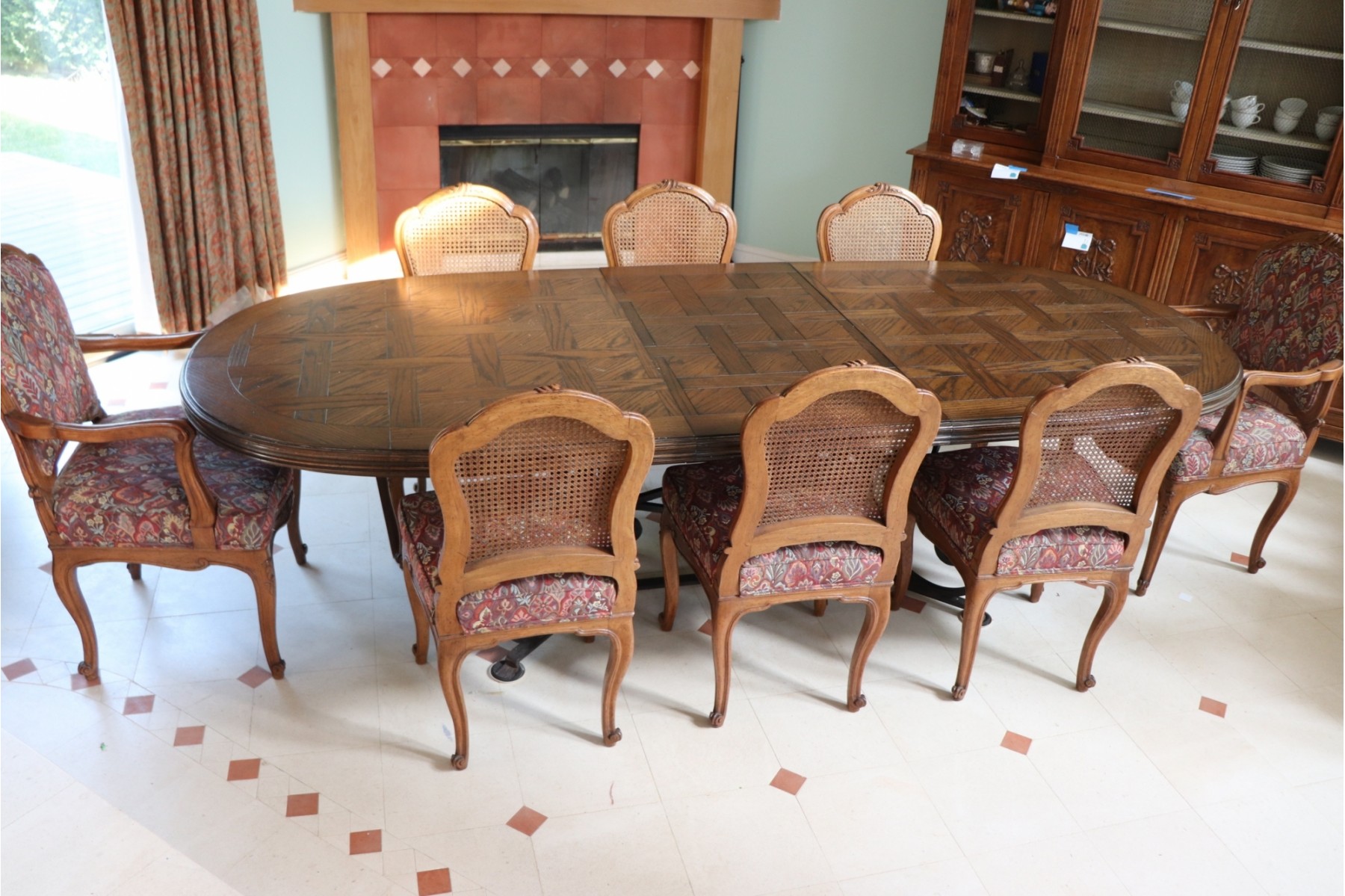 French parquet style dining room table & 8 French style caned back chairs. The table has wrought iron base & 1 leaf and measures 105” L x 43.75” W x 30.5” T. There are 2 armchairs & 6 side chairs. Armchairs are 23” W x 40” T & 20” seat height. Side Chairs are 17” W x 38” T 19.5” seat height. Chairs have Carved apron and legs and crown. Table has small veneer chip missing. Please see photos for more details.