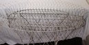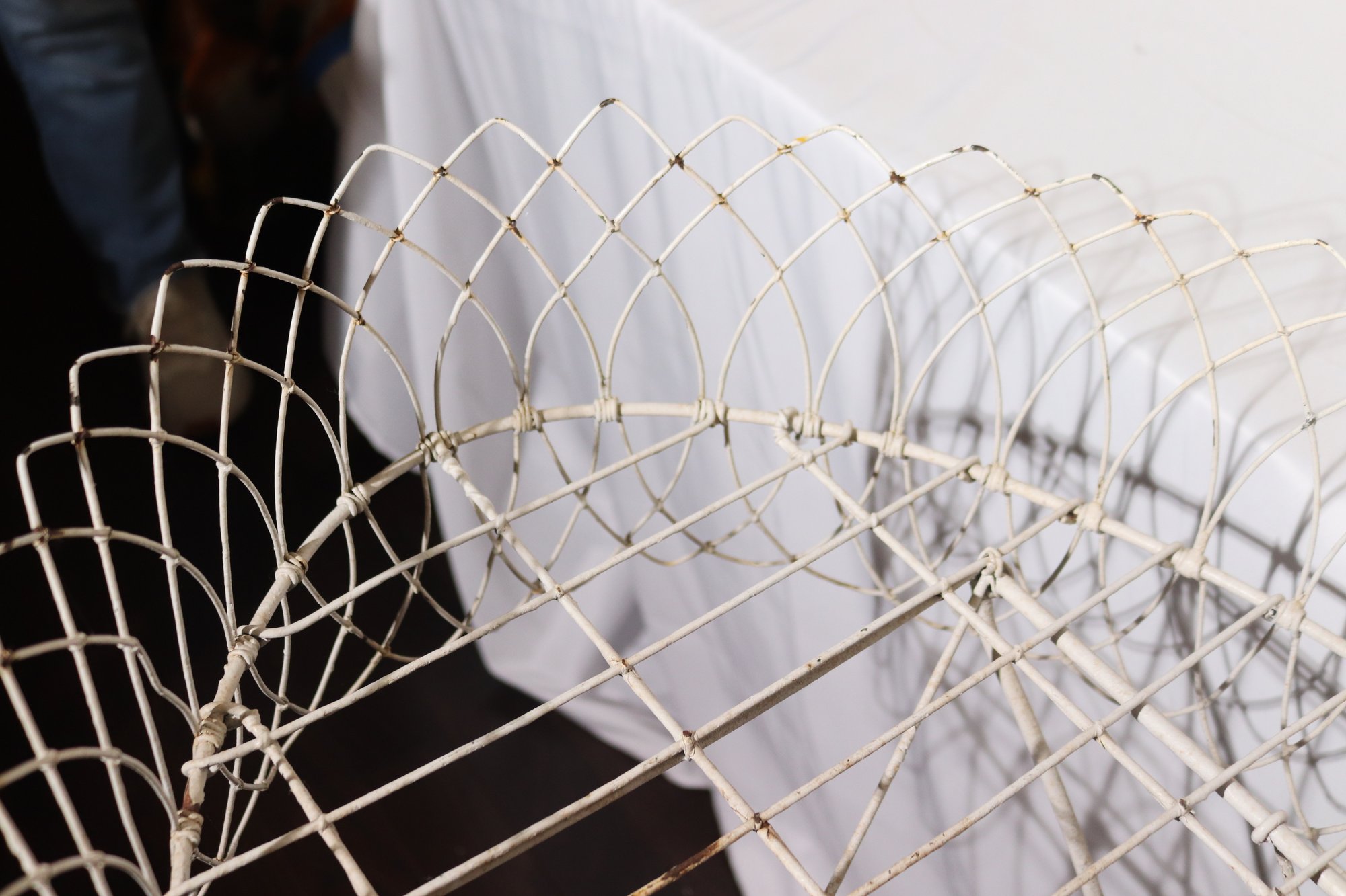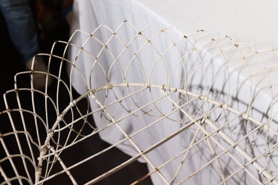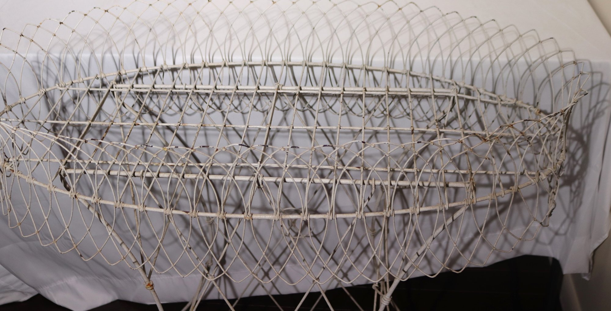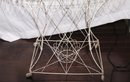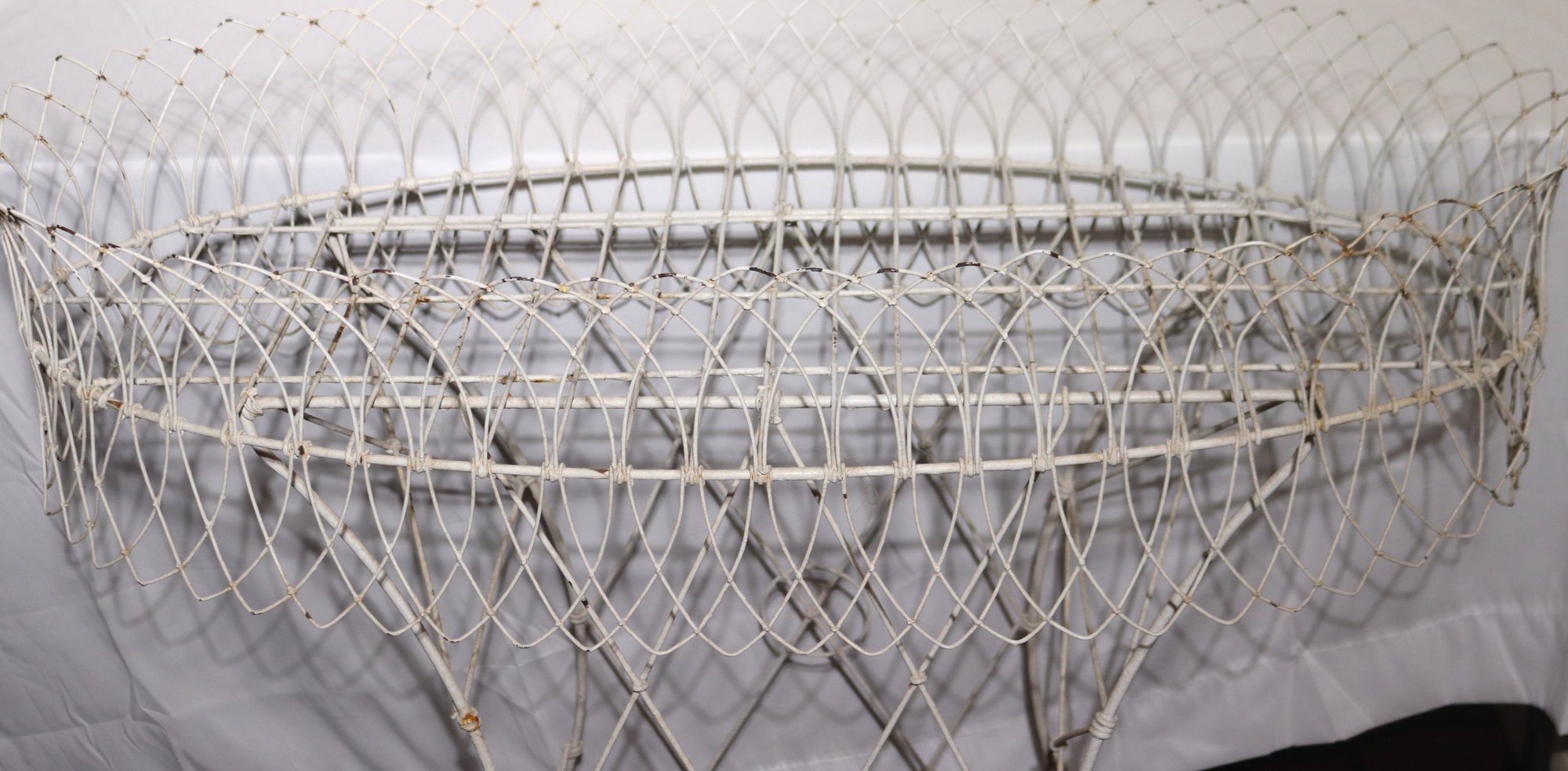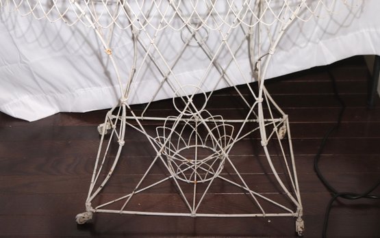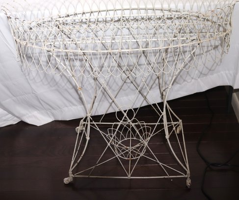 French white painted Metal wire planter on wheels. Measures 37” x 19” x