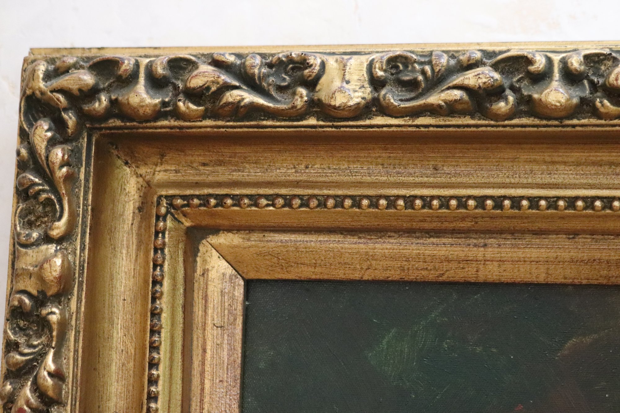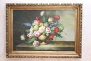 Hand painted still life painting of a floral centerpiece on canvas signed by the artist L.