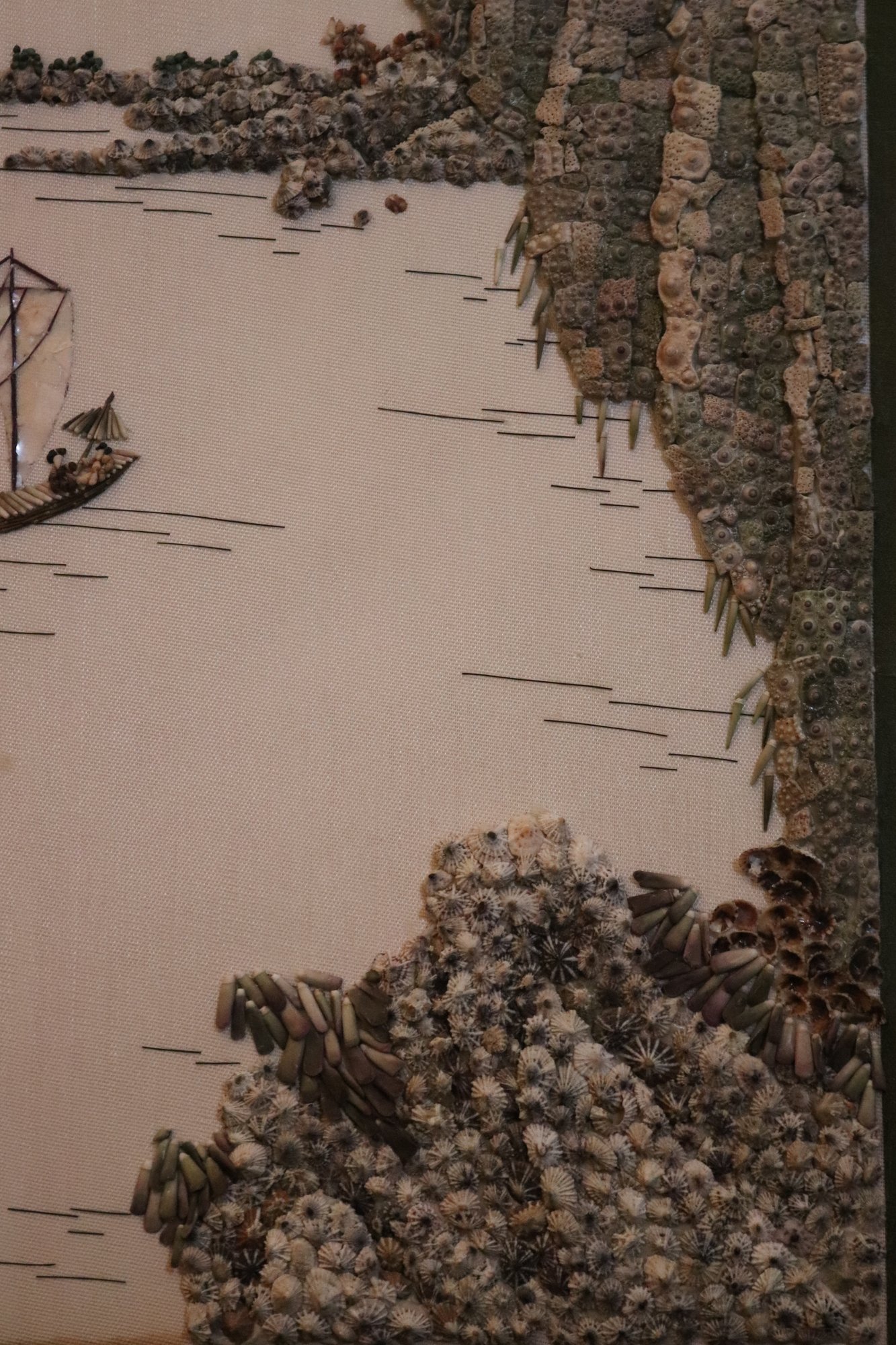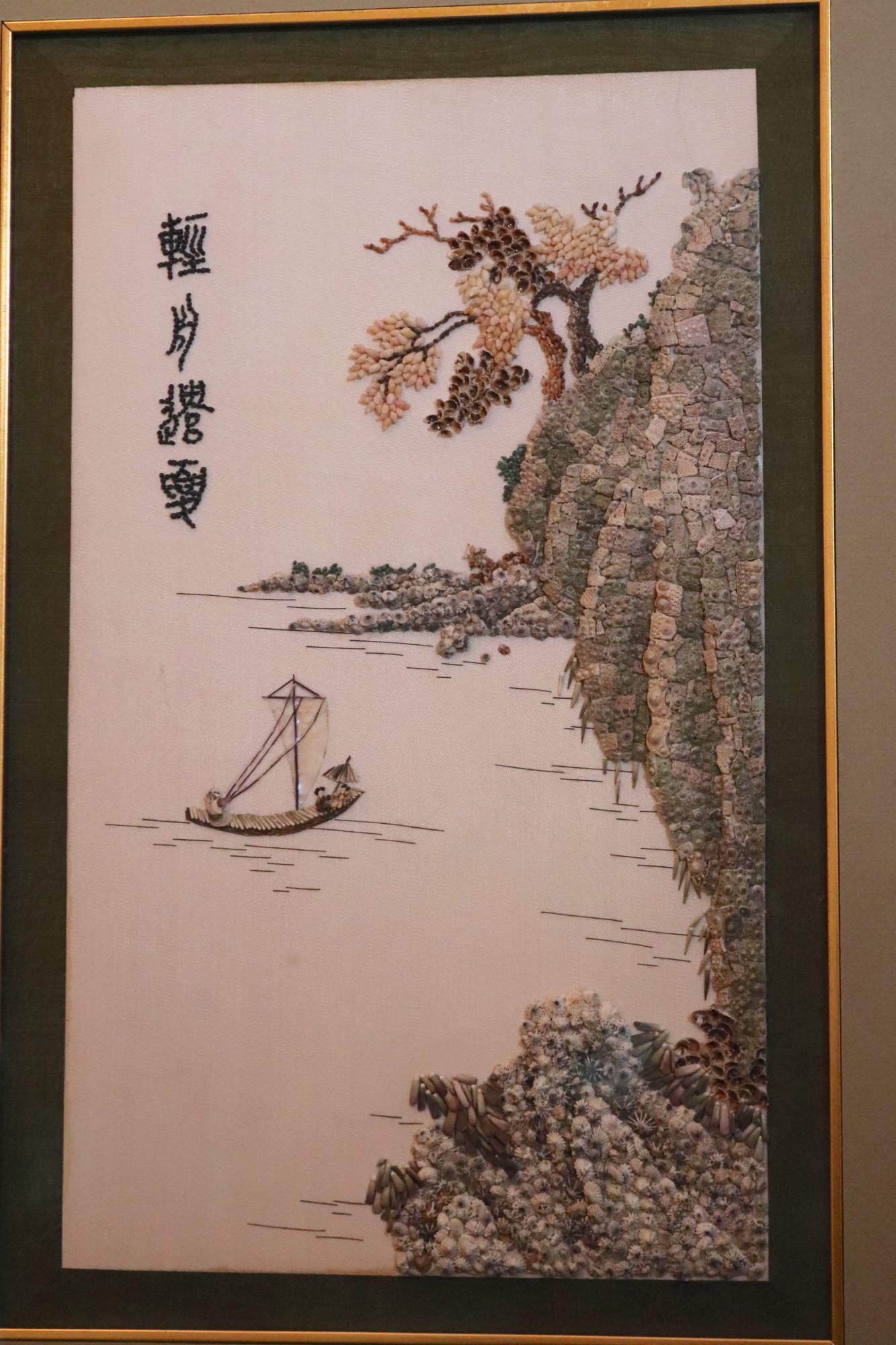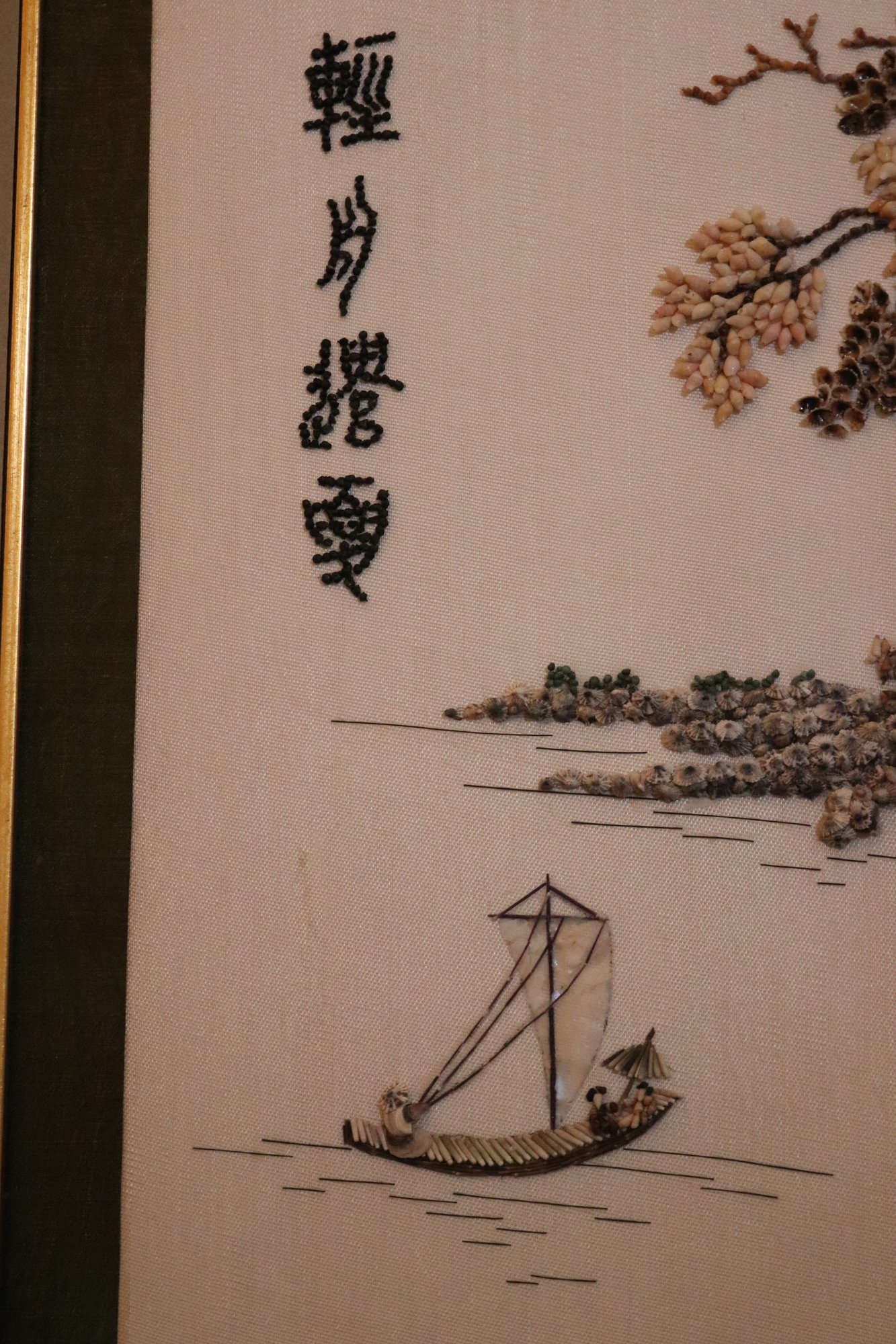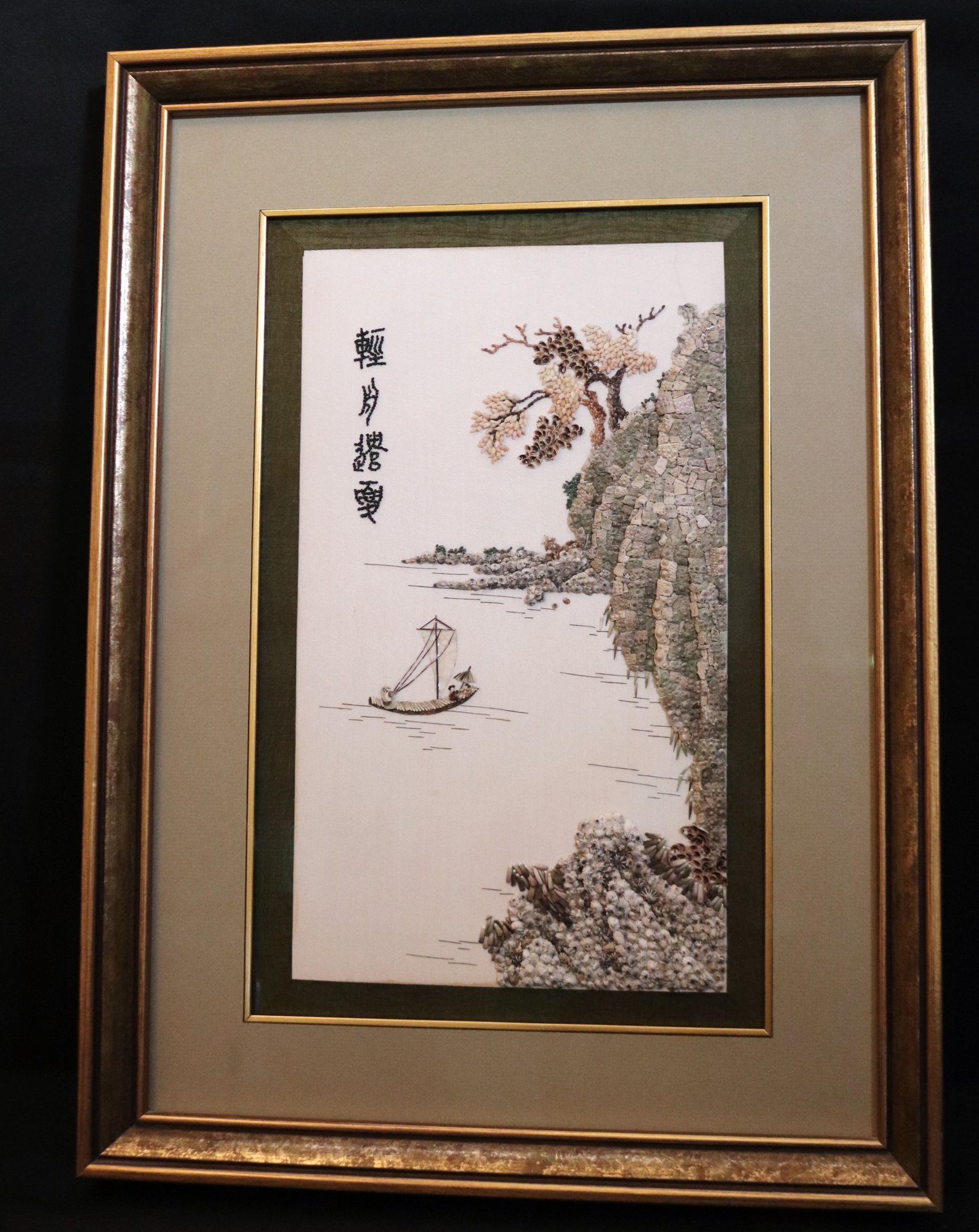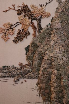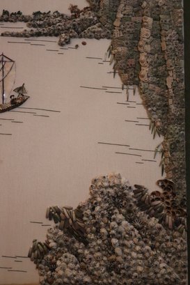 Handmade Chinese shell mosaic artwork in frame, made with hand set stones as pictured This piece measures approximately 15.5” w x 21” tall.