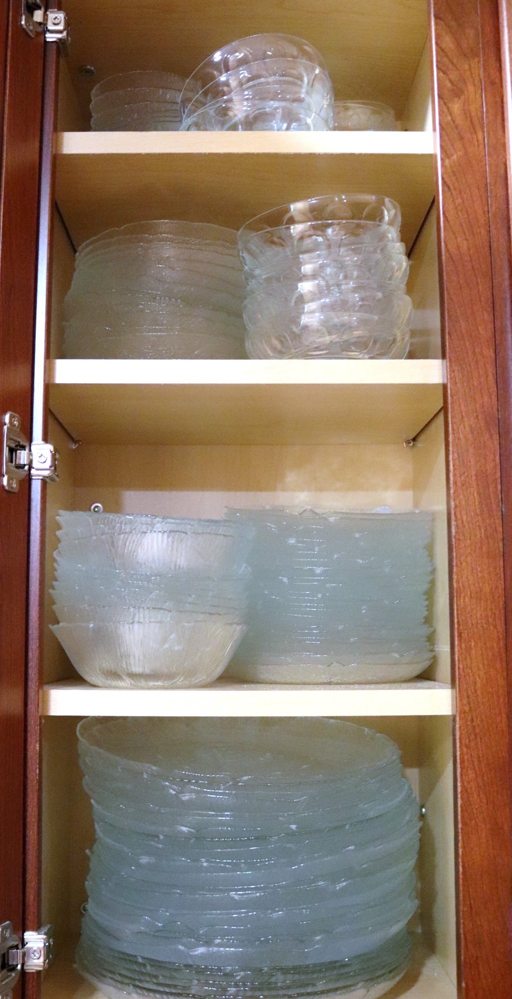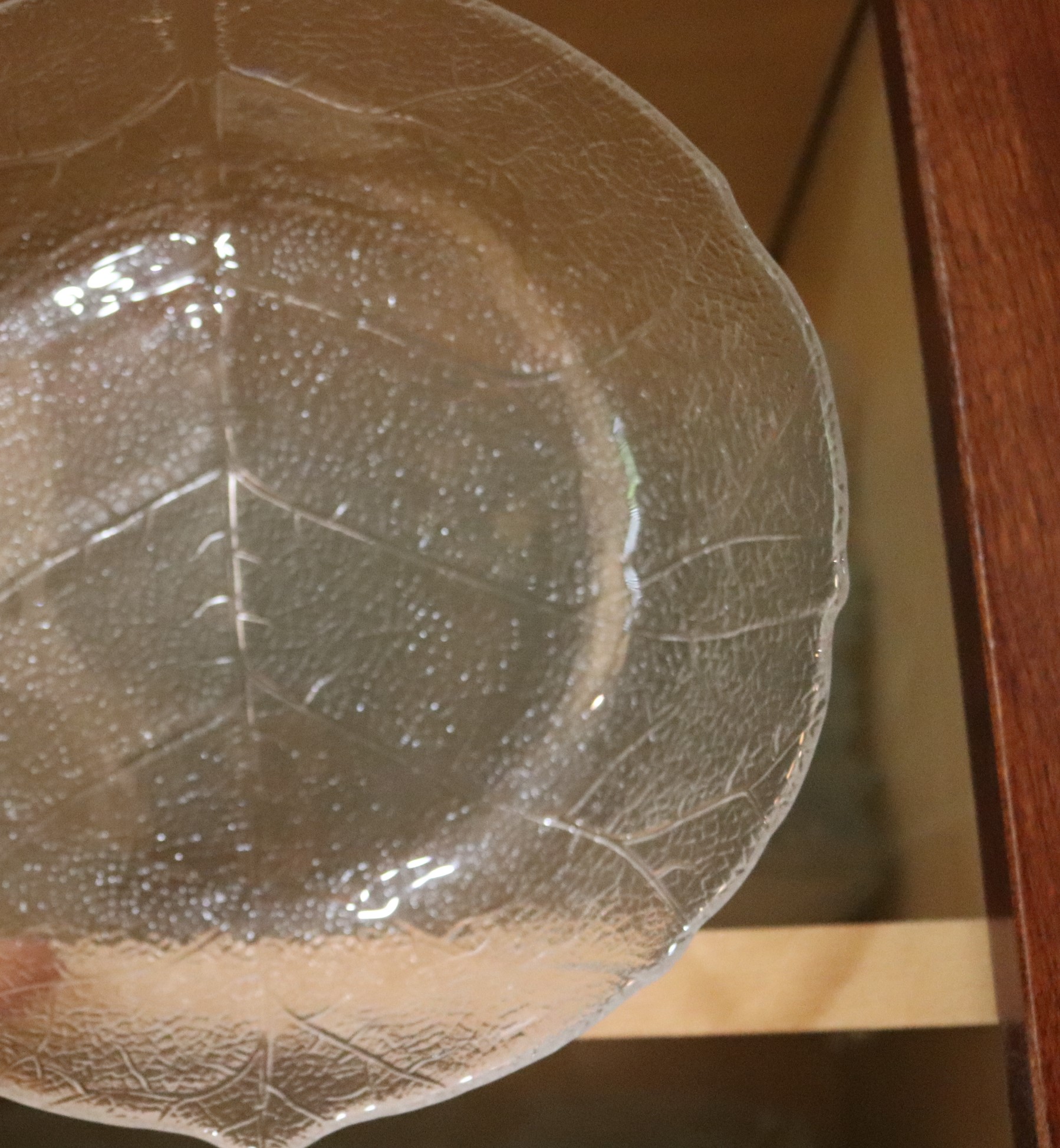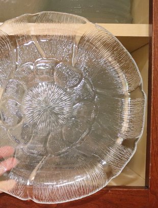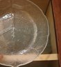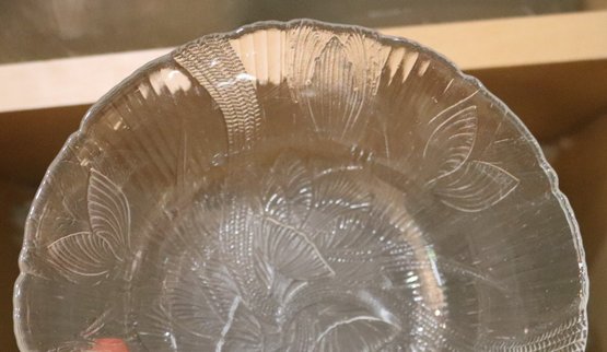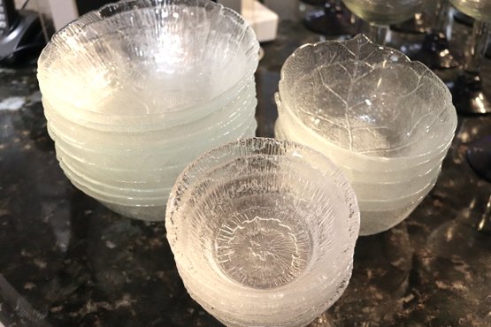 Huge assortment of glass dishes with dinner plates, soup & salad with leaf pattern. The set is huge and features 2 different patterns of glass dishes. Included are 24 dinner plates,16 soup, 11 pasta bowls, 8 berry bowls ++